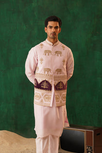 The Vanvaas Blush Kurta is a masterpiece, hand-painted on pure silk, making it perfect for men who want understated luxury.