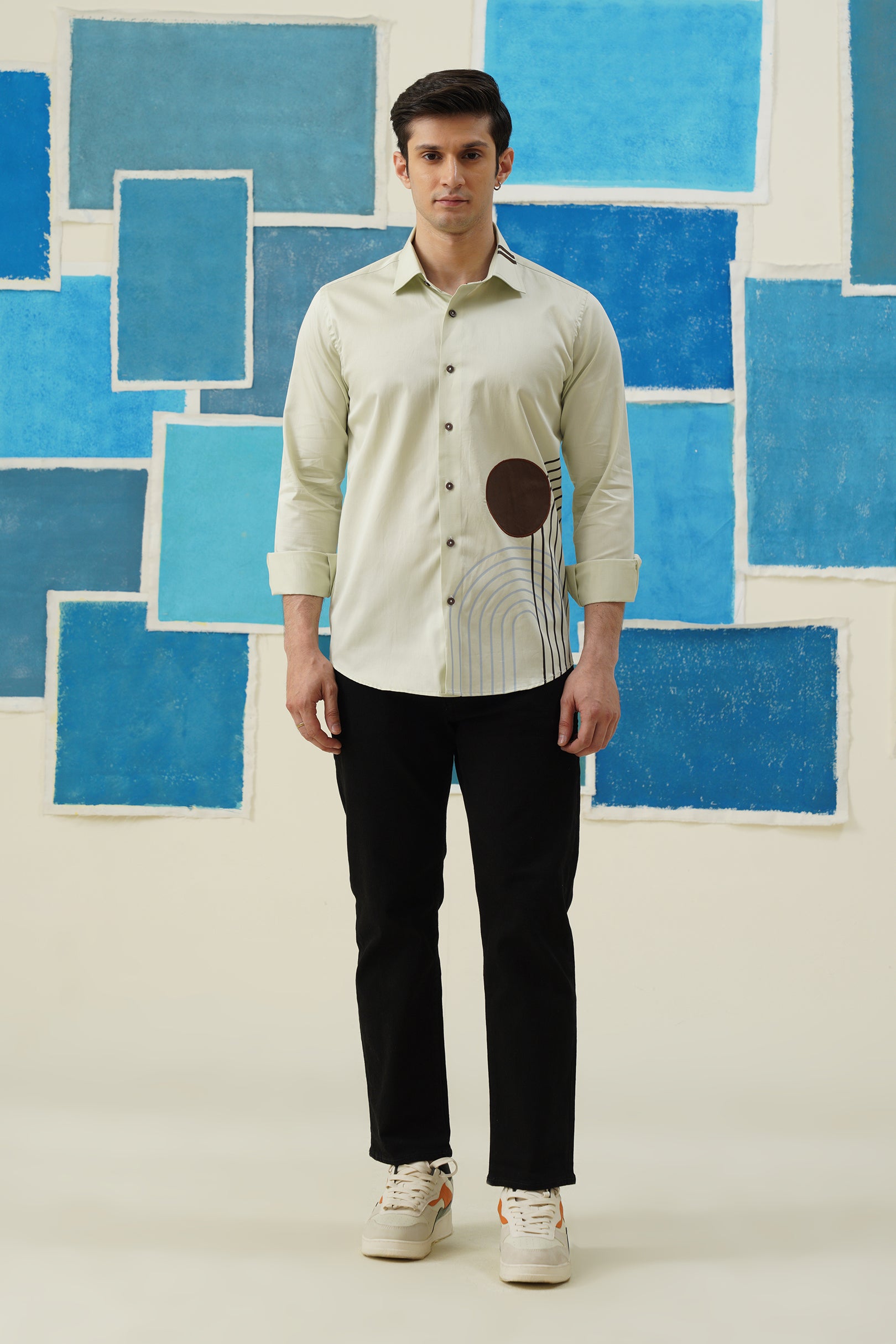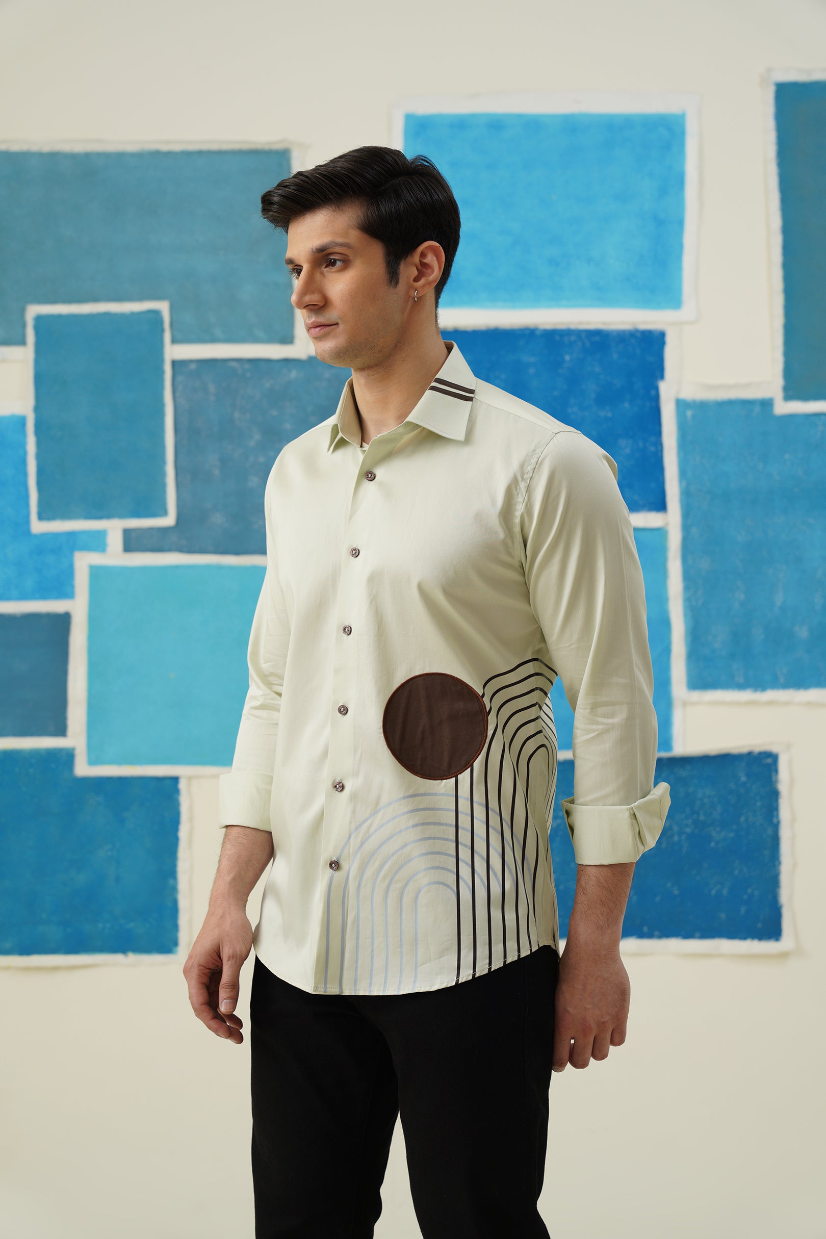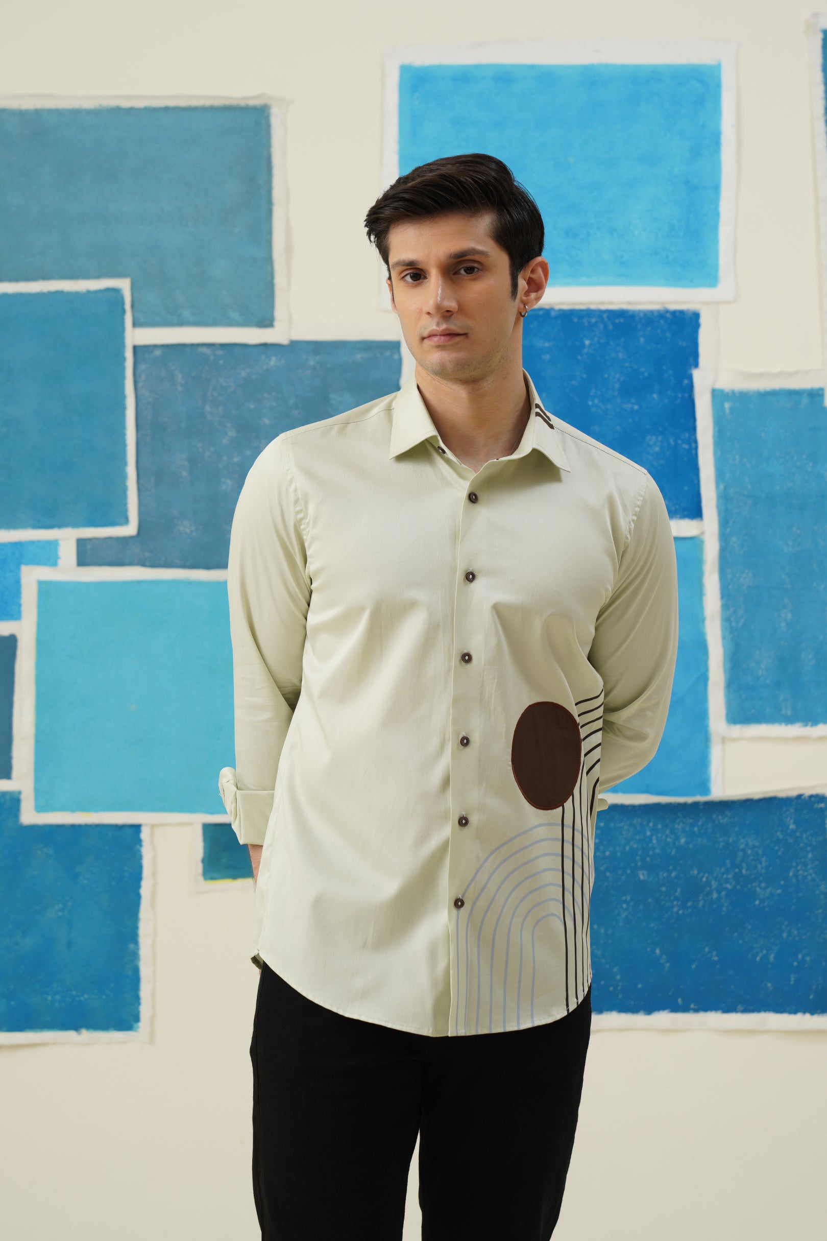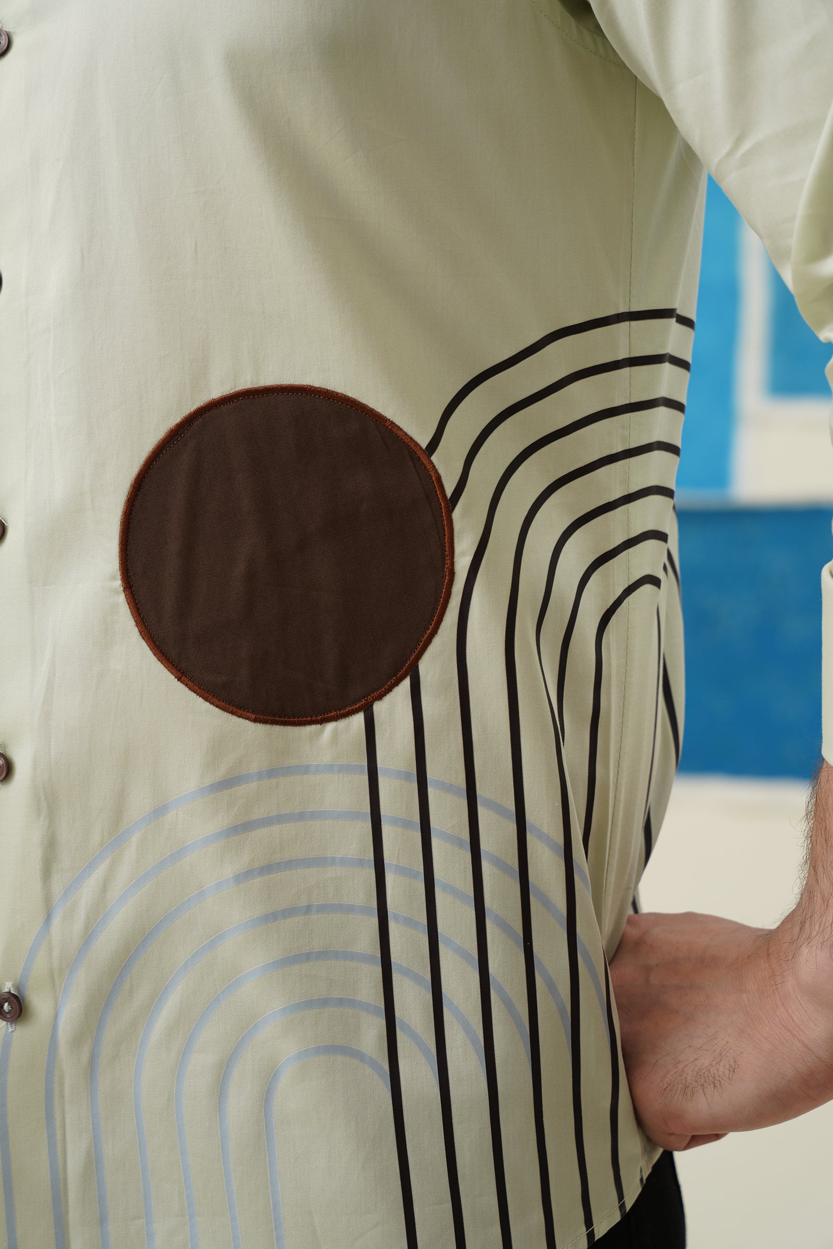 This light green Giza cotton shirt offers a perfect balance of modern design and artistic expression. Featuring intricate patchwork combined with a bold digital print, the shirt showcases a large brown circular patch and dynamic, curved lines that create an abstract, flowing design. The patchwork and digital print are carefully integrated into the fabric to create a harmonious, stylish piece. The soft Giza cotton ensures comfort, while the tailored fit adds a sharp, contemporary silhouette. Ideal for both casual and semi-formal settings, this shirt adds a distinctive edge to any wardrobe.
