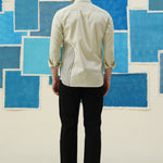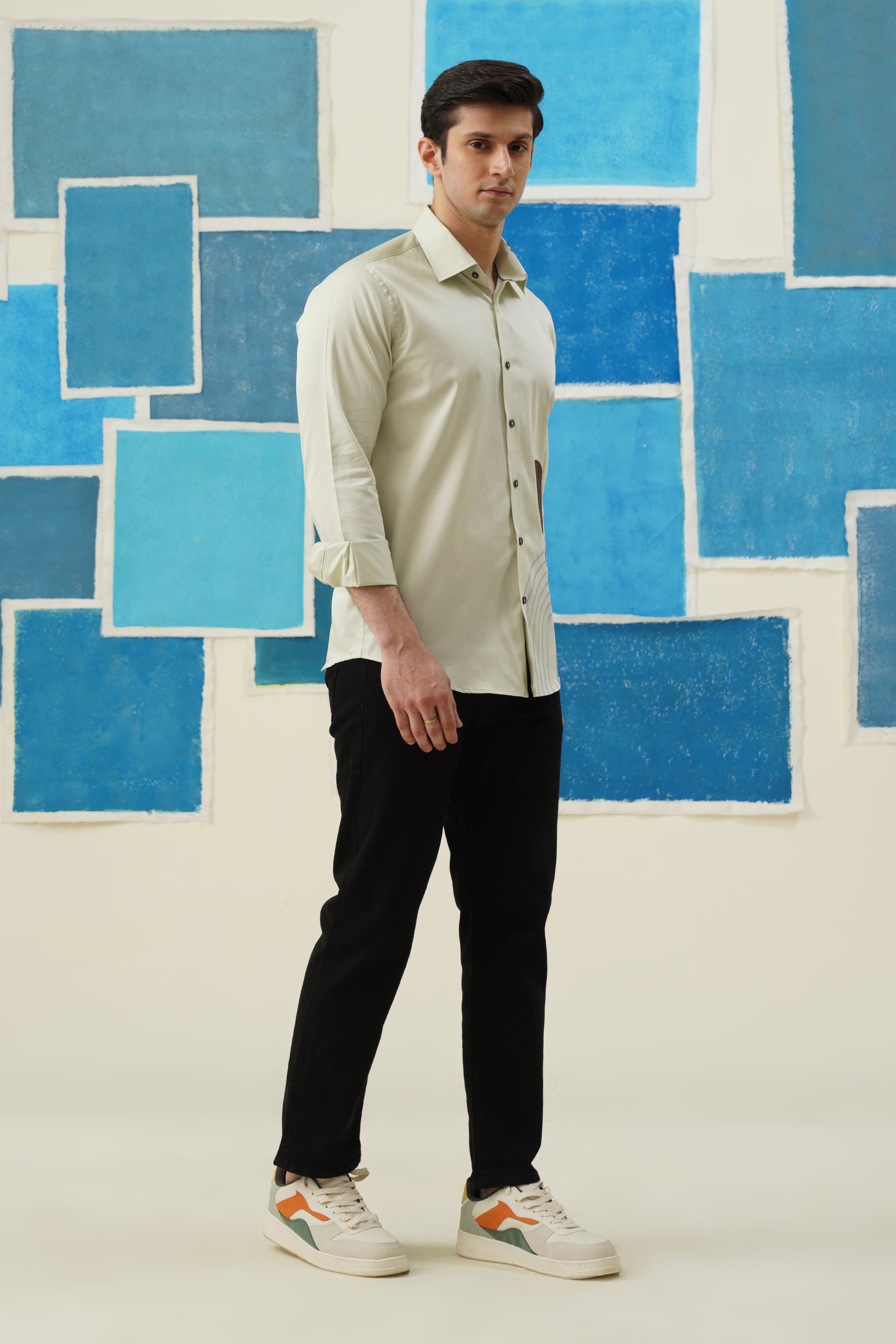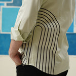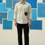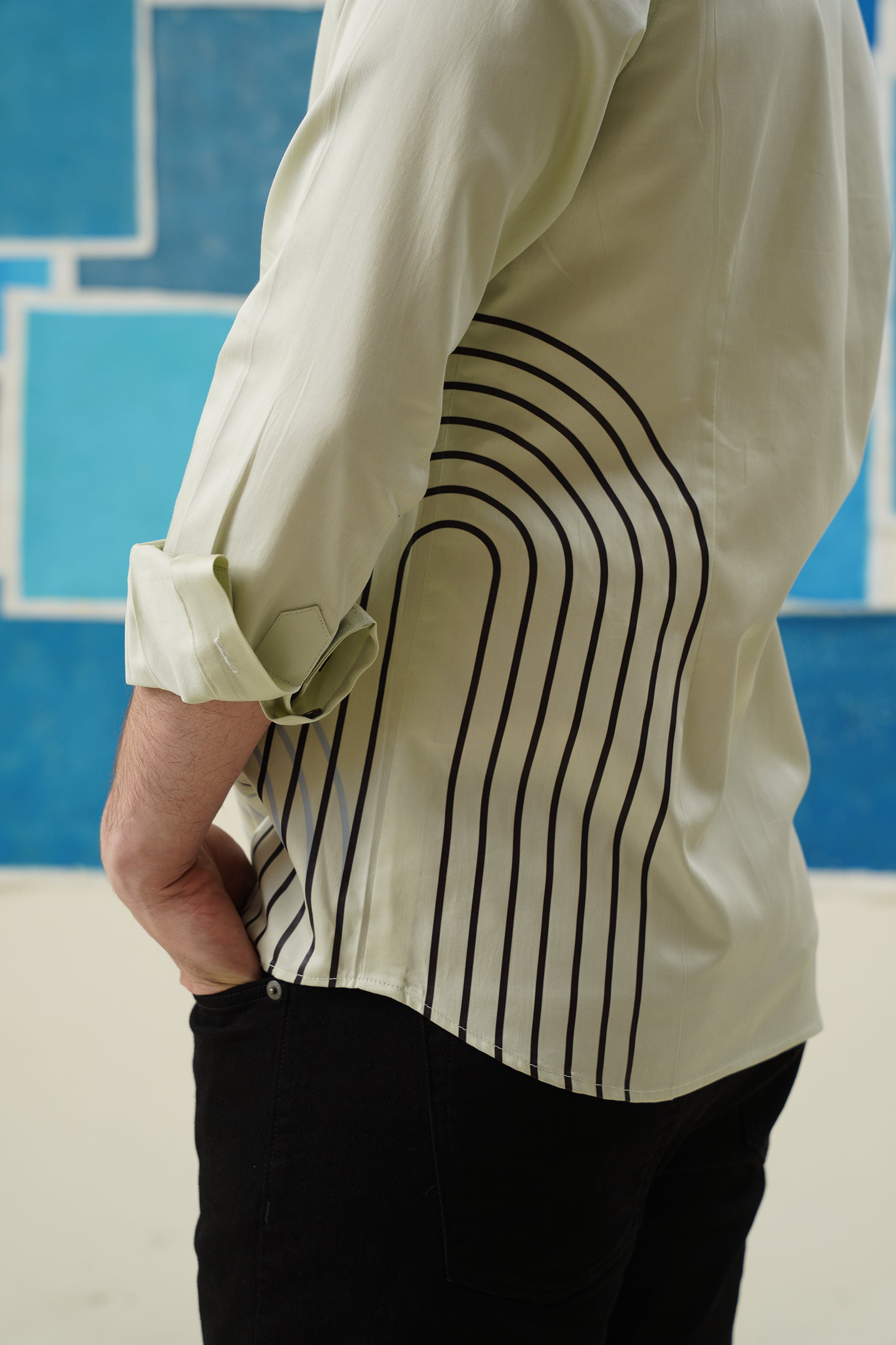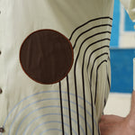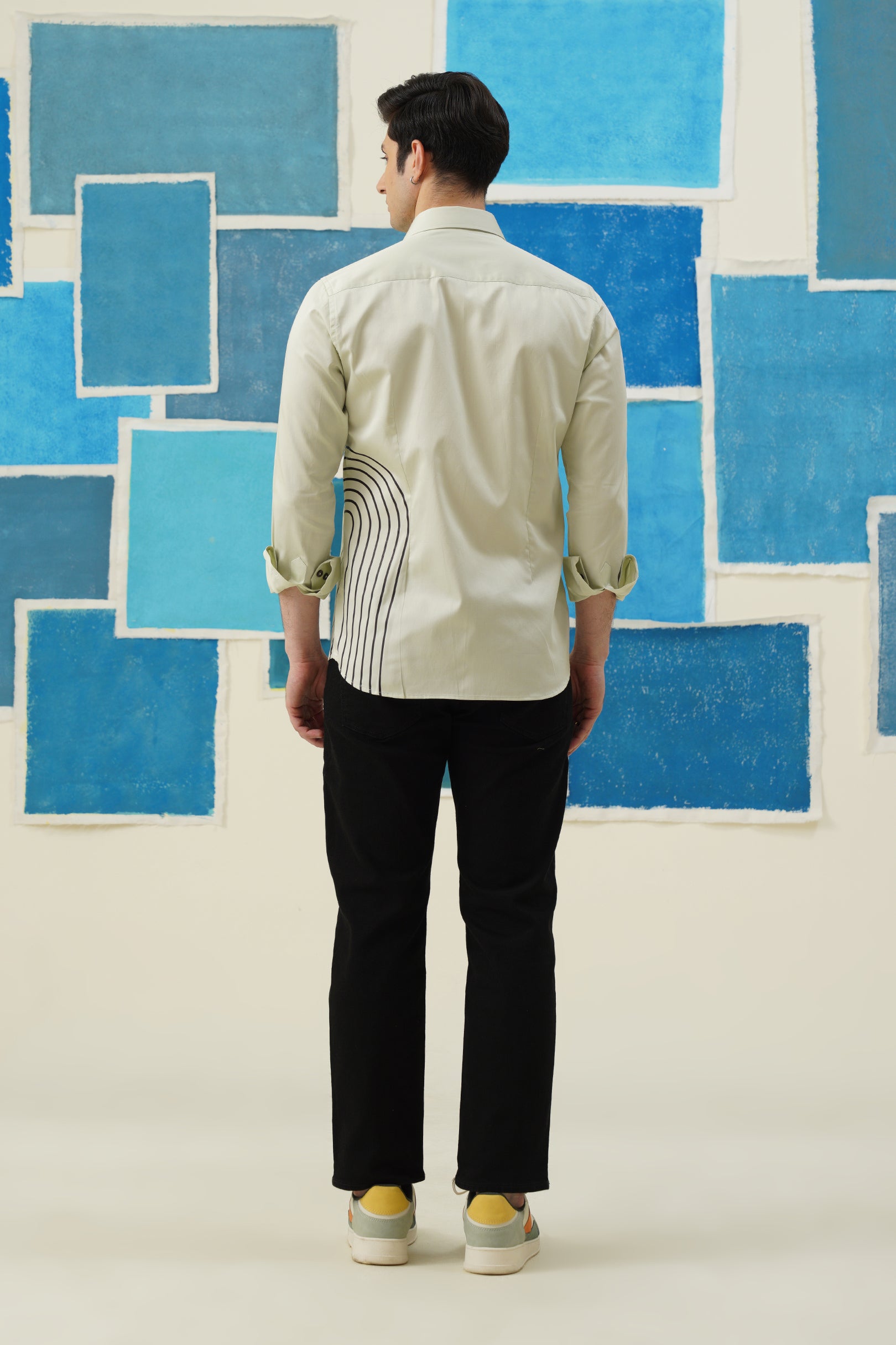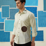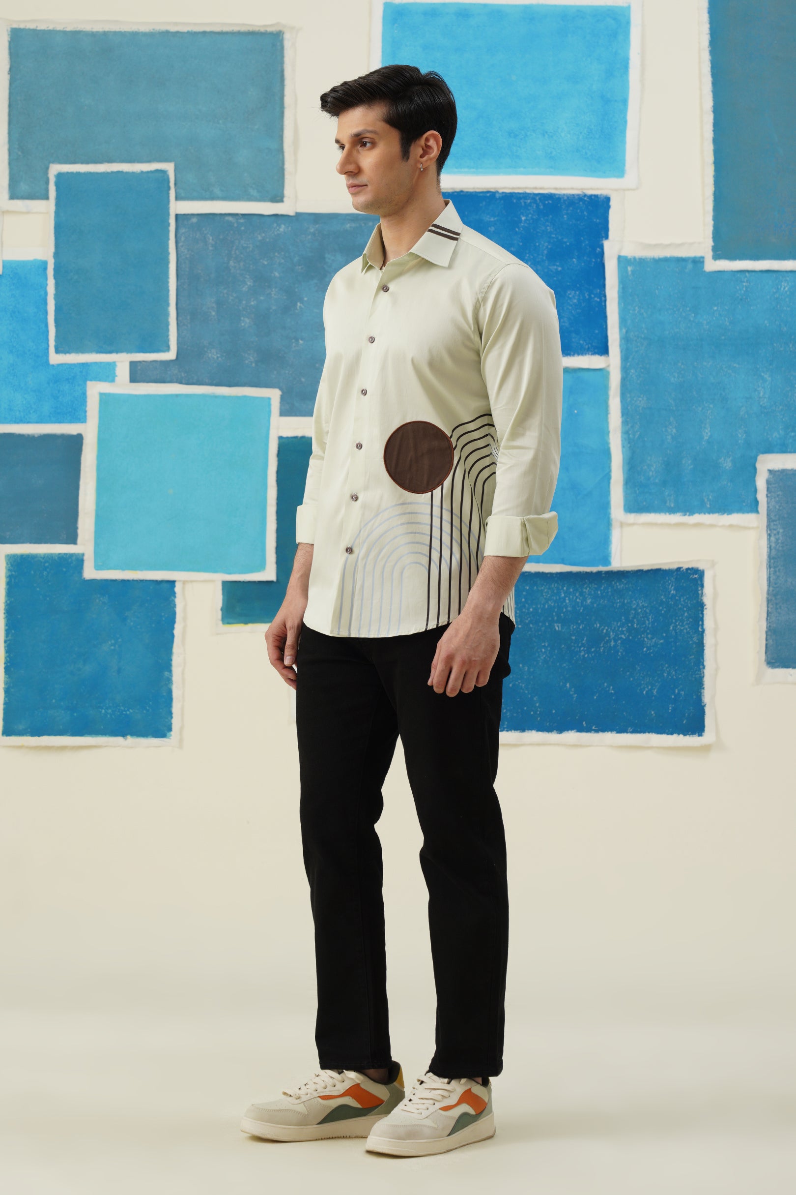 This light green Giza cotton shirt offers a perfect balance of modern design and artistic expression. Featuring intricate patchwork combined with a bold digital print, the shirt showcases a large brown circular patch and dynamic, curved lines that create an abstract, flowing design. The patchwork and digital print are carefully integrated into the fabric to create a harmonious, stylish piece. The soft Giza cotton ensures comfort, while the tailored fit adds a sharp, contemporary silhouette. Ideal for both casual and semi-formal settings, this shirt adds a distinctive edge to any wardrobe.