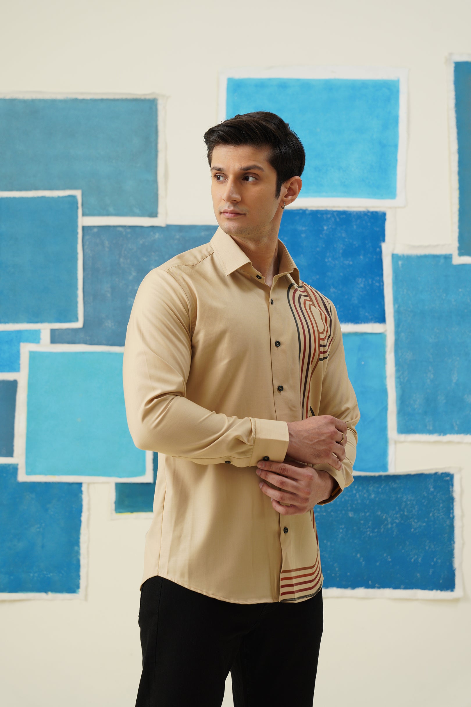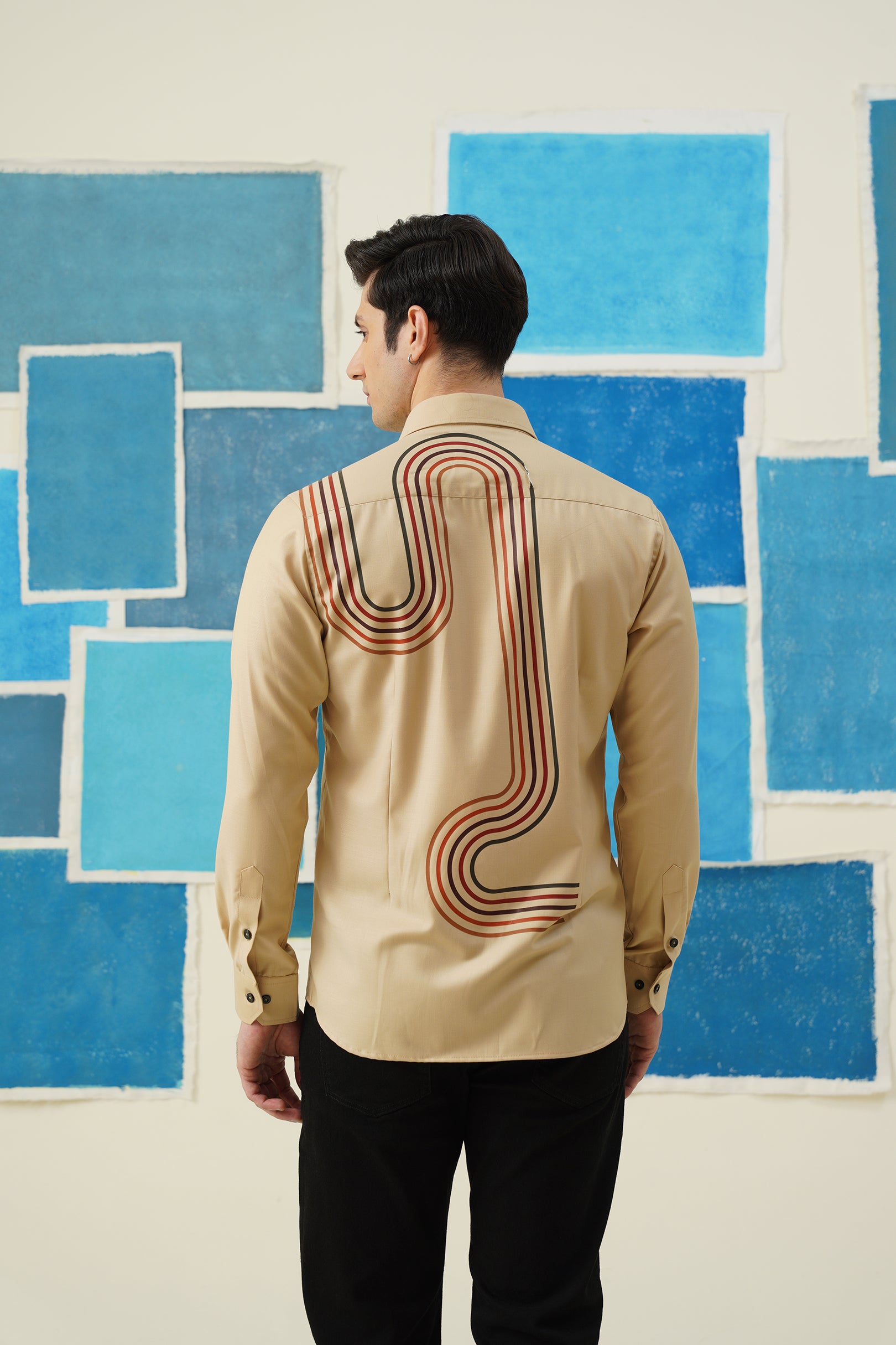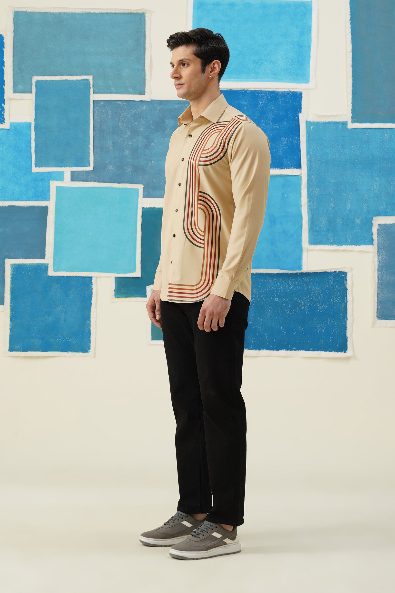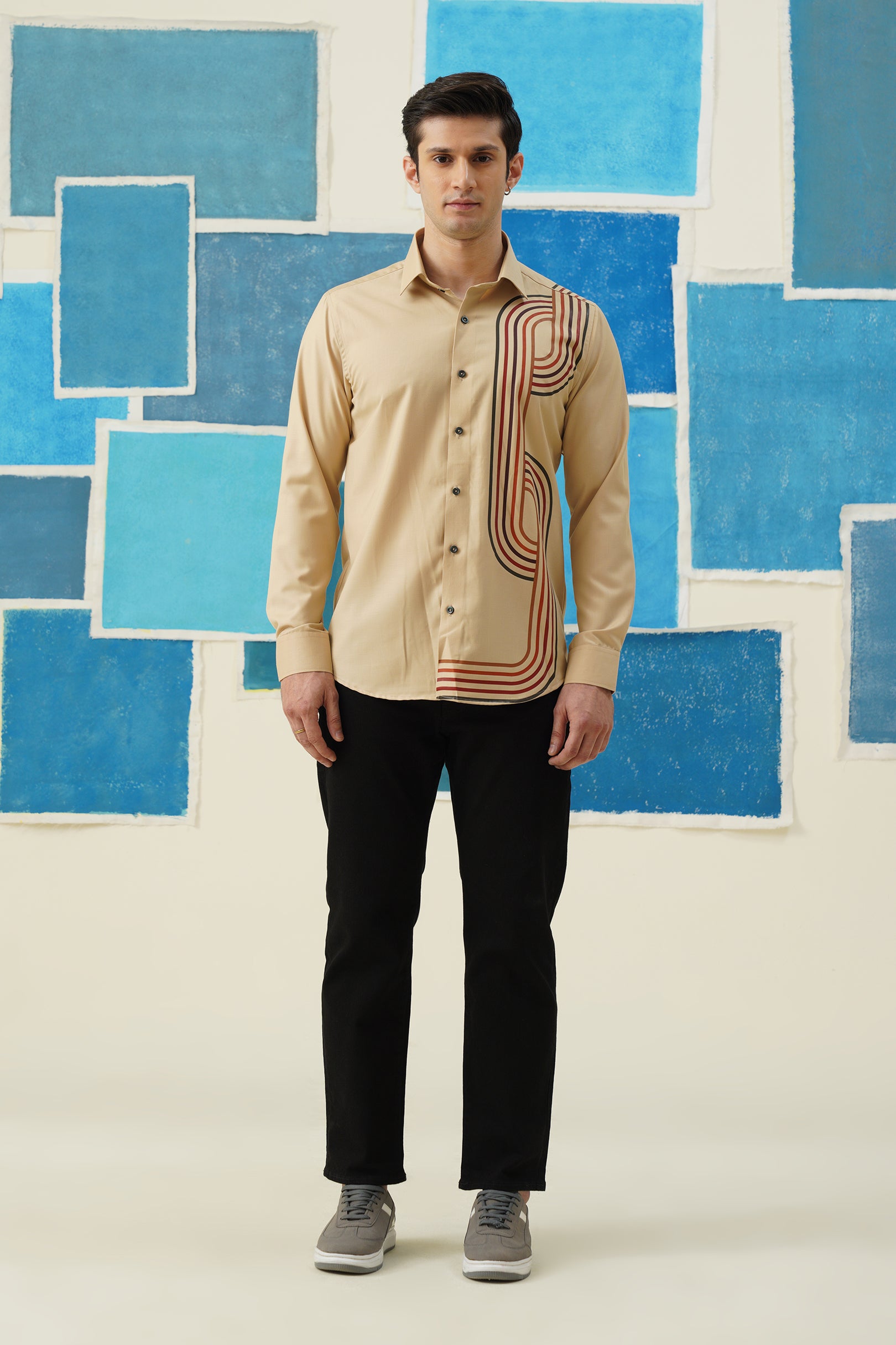 This stylish shirt, crafted from premium Giza cotton, is a perfect blend of comfort and contemporary design. The shirt features a striking digital print of flowing abstract lines in rich tones of red, brown, and black that traverse across the chest and back, making it a bold statement piece. The clean, soft beige base offers an elegant canvas for the dynamic print, while the tailored fit ensures a sharp, modern silhouette.