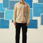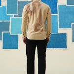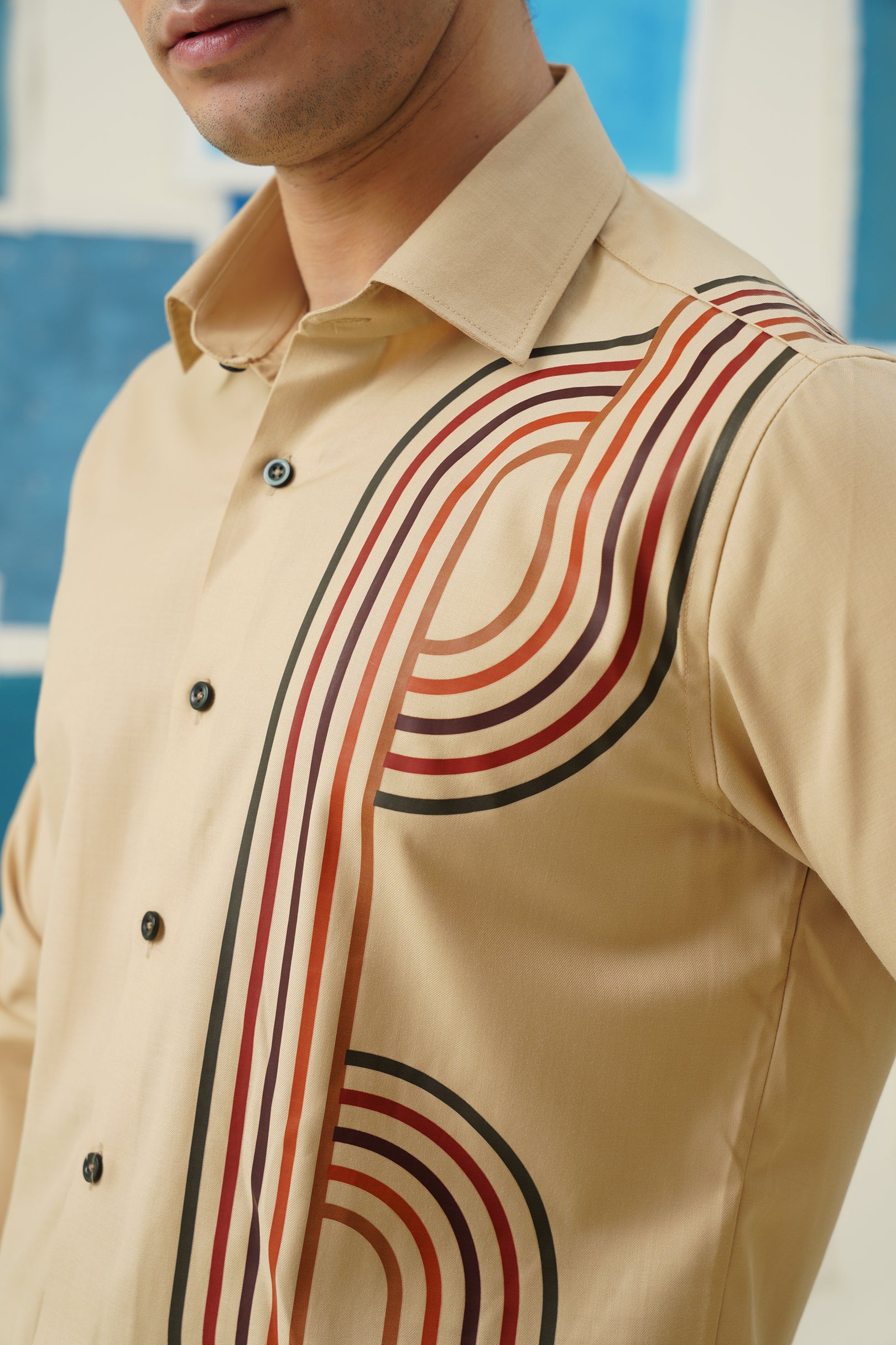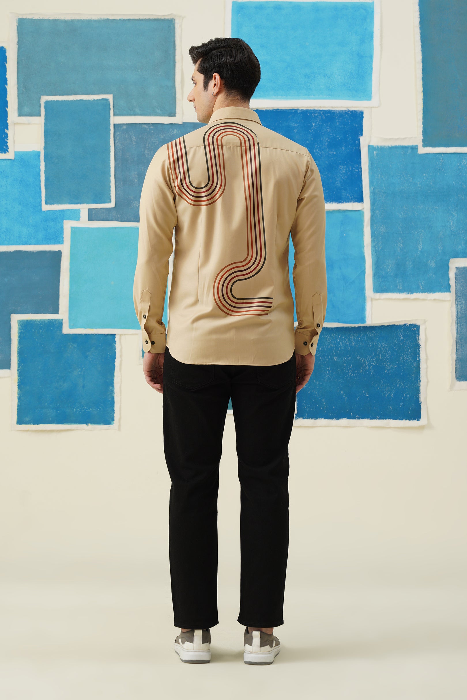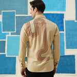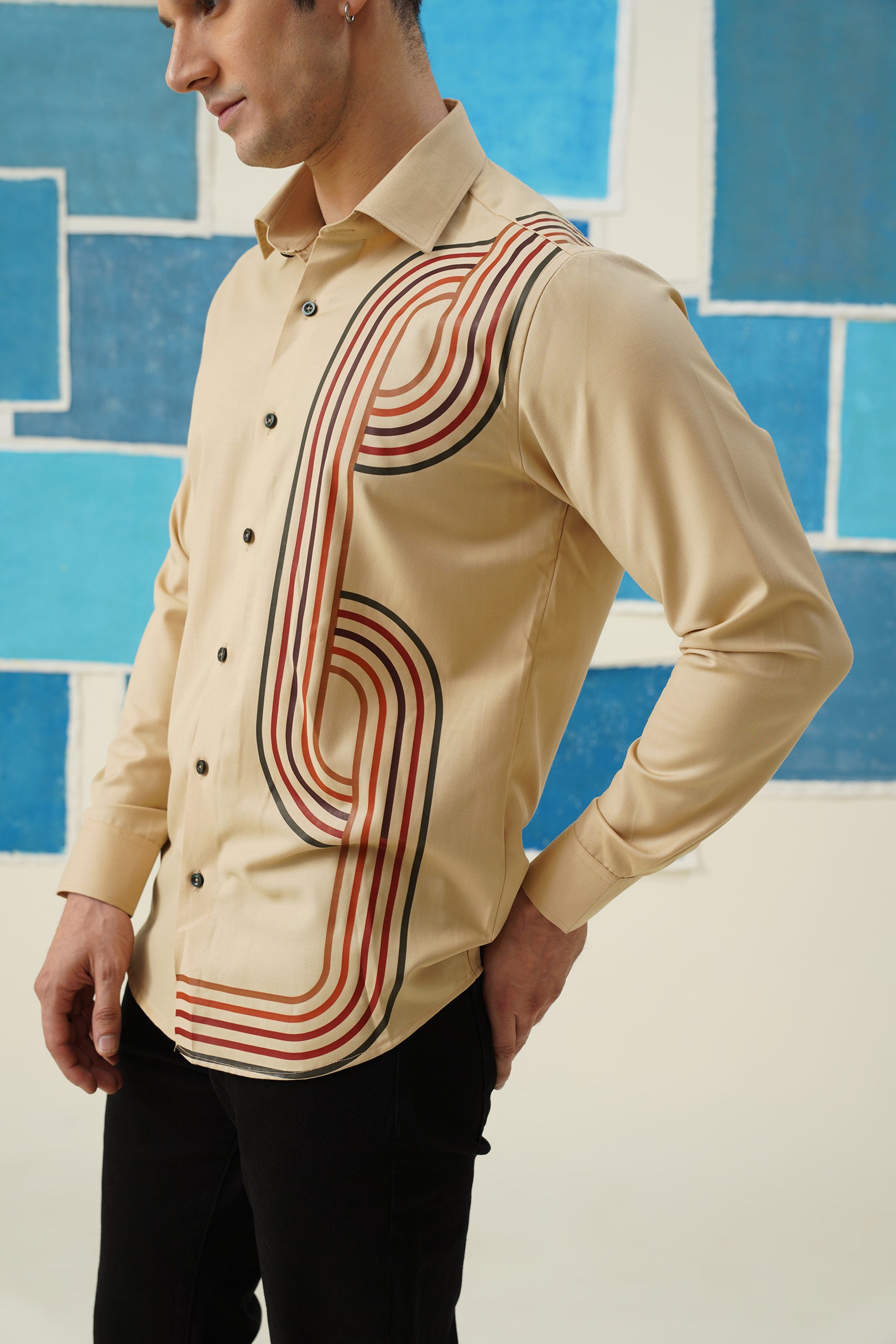 This stylish shirt, crafted from premium Giza cotton, is a perfect blend of comfort and contemporary design. The shirt features a striking digital print of flowing abstract lines in rich tones of red, brown, and black that traverse across the chest and back, making it a bold statement piece. The clean, soft beige base offers an elegant canvas for the dynamic print, while the tailored fit ensures a sharp, modern silhouette.