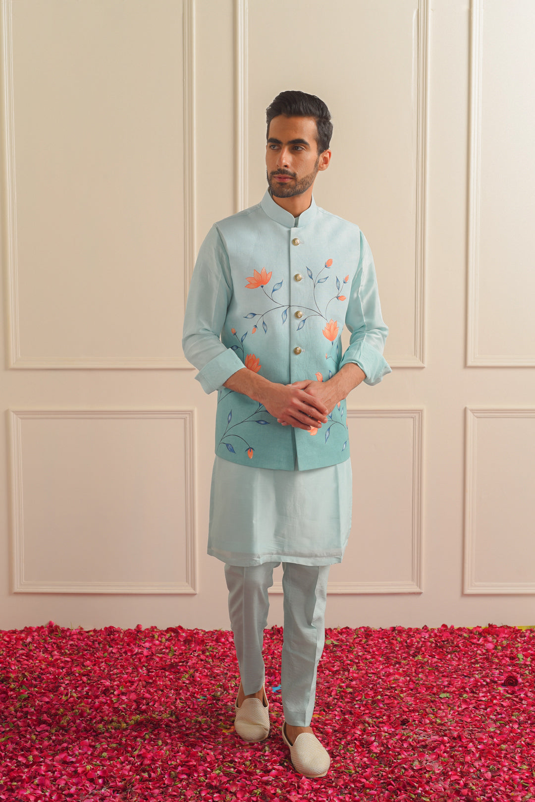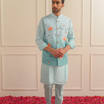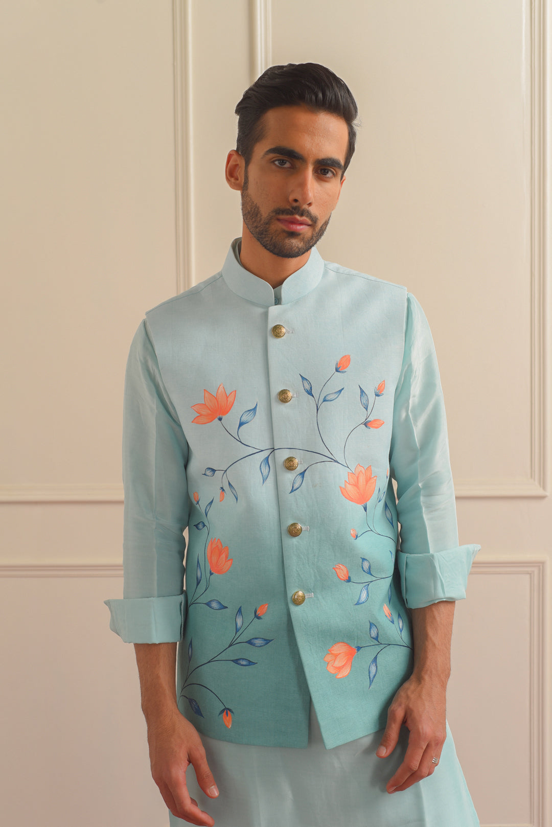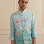 With its classic Nehru collar and tailored silhouette, this jacket exudes timeless elegance. Whether you're dressing up for a special occasion or adding a touch of flair to your everyday look, our Hand-Painted Nehru Jacket is sure to make a statement.