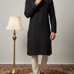 Discover understated luxury with the Classic Mesh Kurta, crafted from advanced Japanese mesh fabric for feather-light comfort and breathability. Clean lines are elevated by vertical leather trim detailing, adding a refined, contemporary edge to this all-black silhouette.