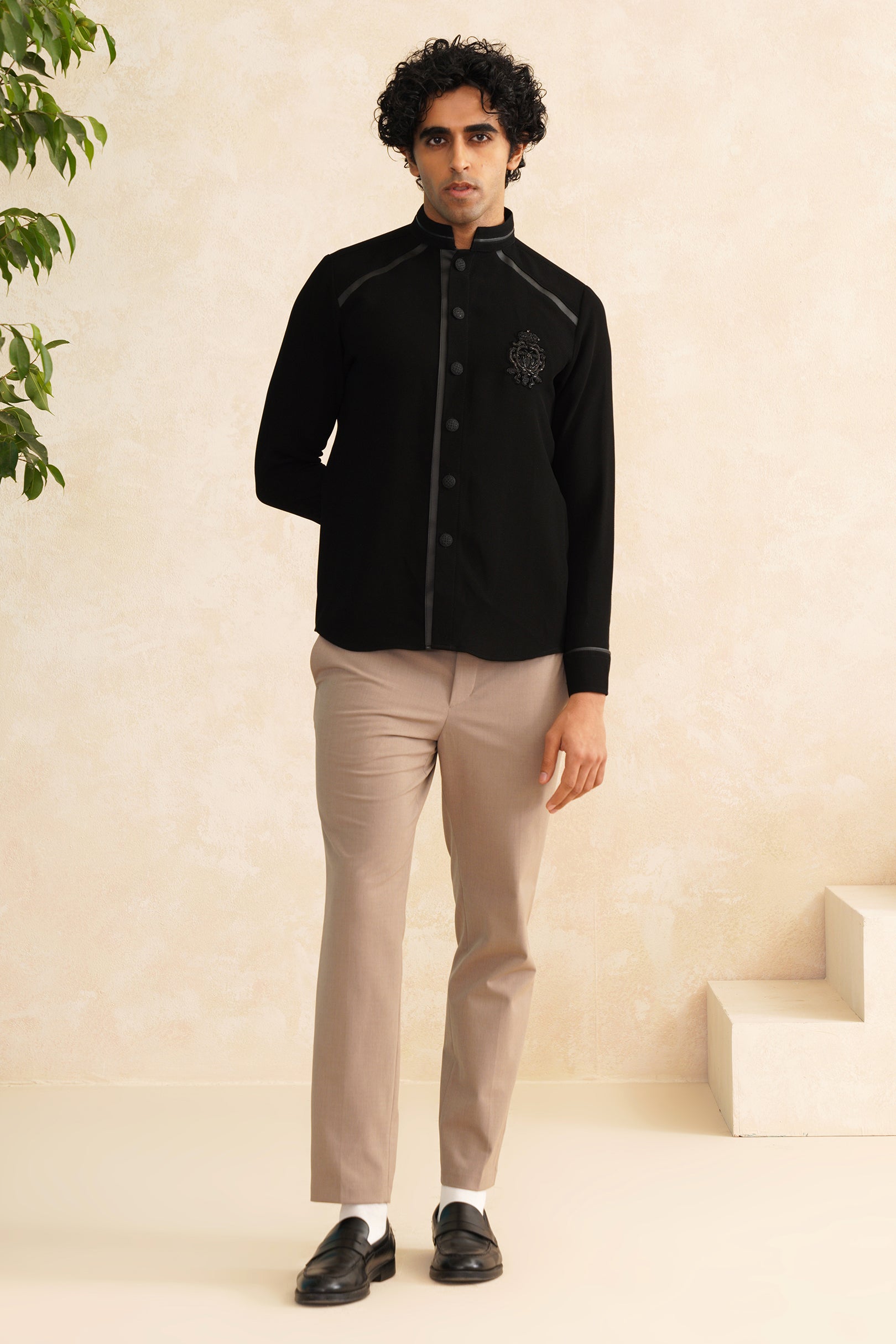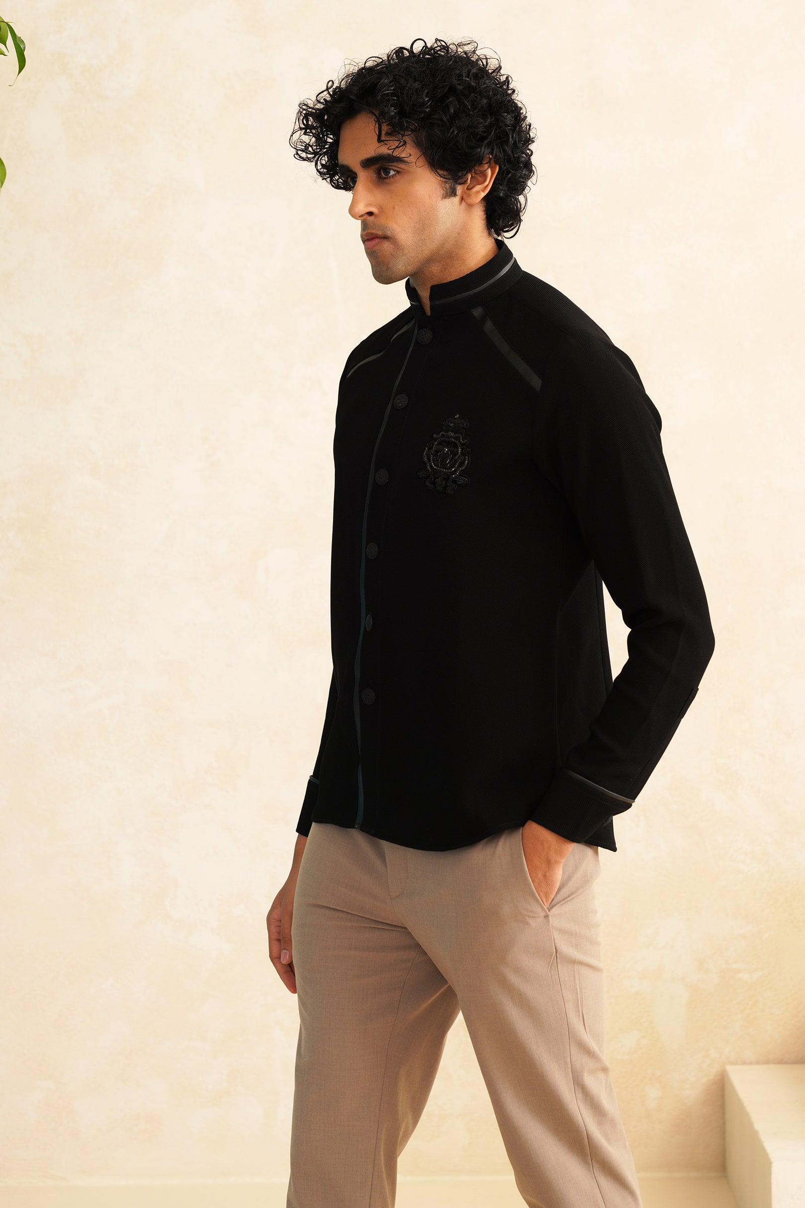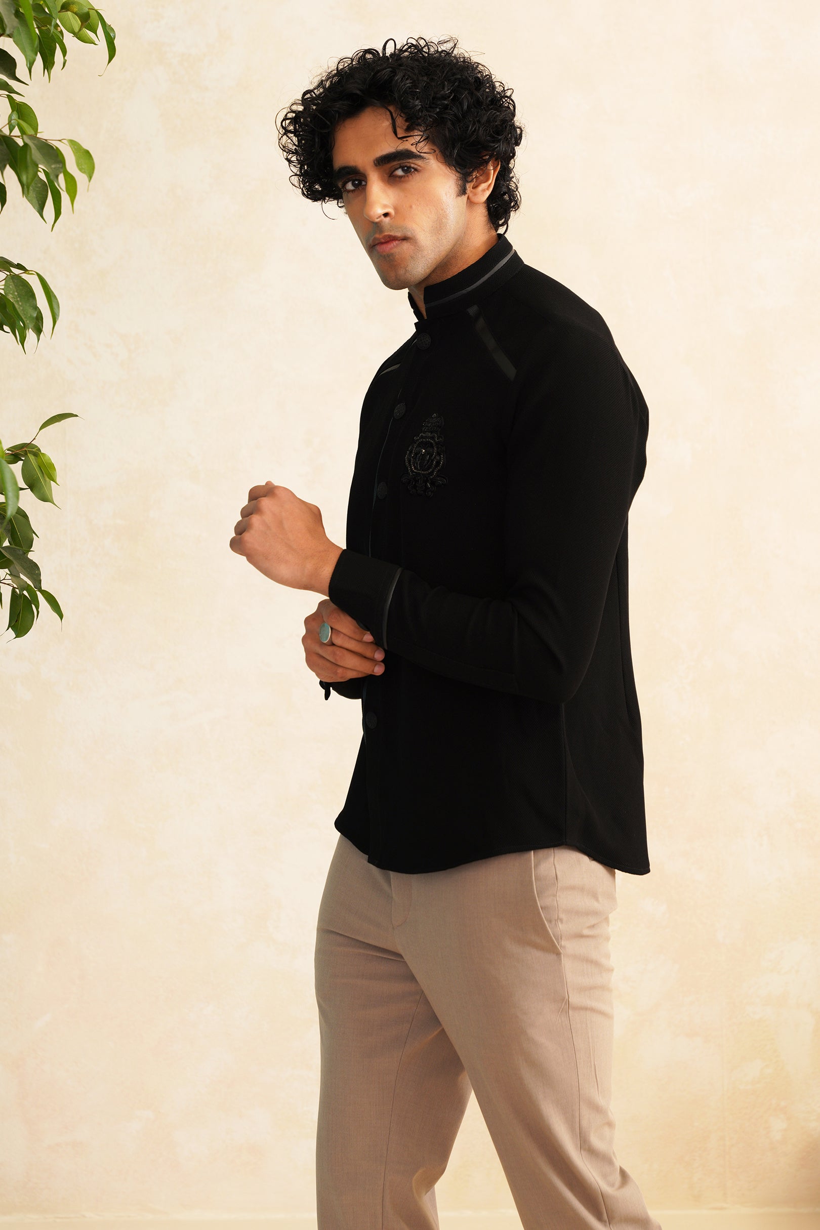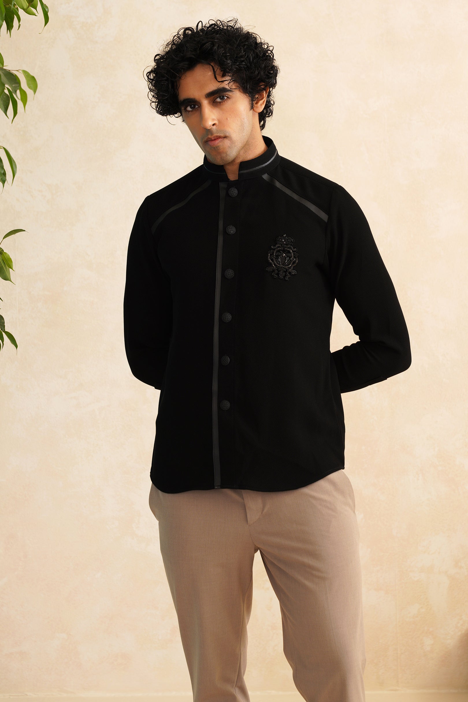 Command elegance with Crown Black – Black embroidered designer shirt for men, a distinguished black shirt tailored in rich Japanese fabric that offers a luxurious feel and flawless fall. This contemporary Bandhgala-style shirt features structured shoulders, tonal piping across the yoke, and a sleek buttoned placket. A regal embroidered crest on the chest adds a signature touch of nobility, making this piece a modern tribute to classic royal fashion. Ideal for upscale dinners, festive evenings, or statement formalwear.
