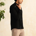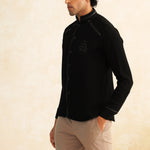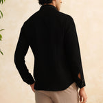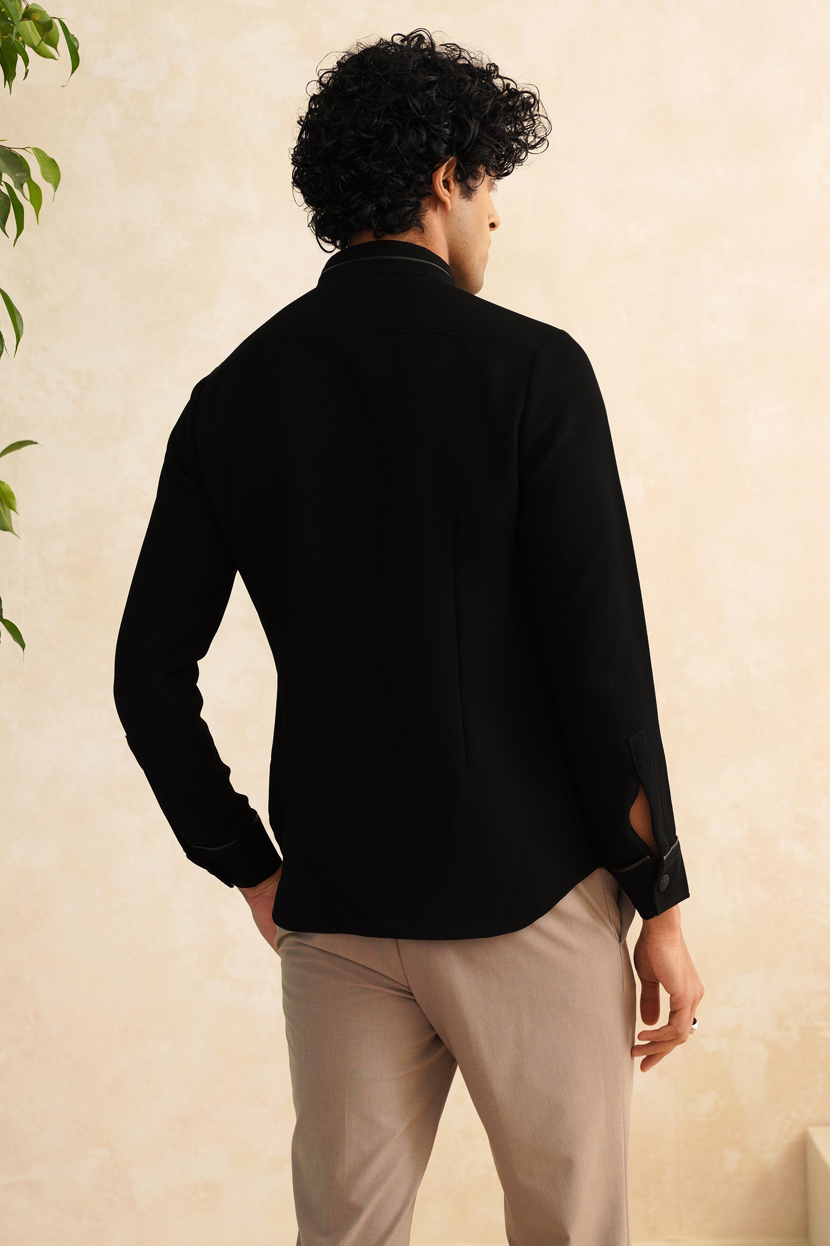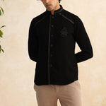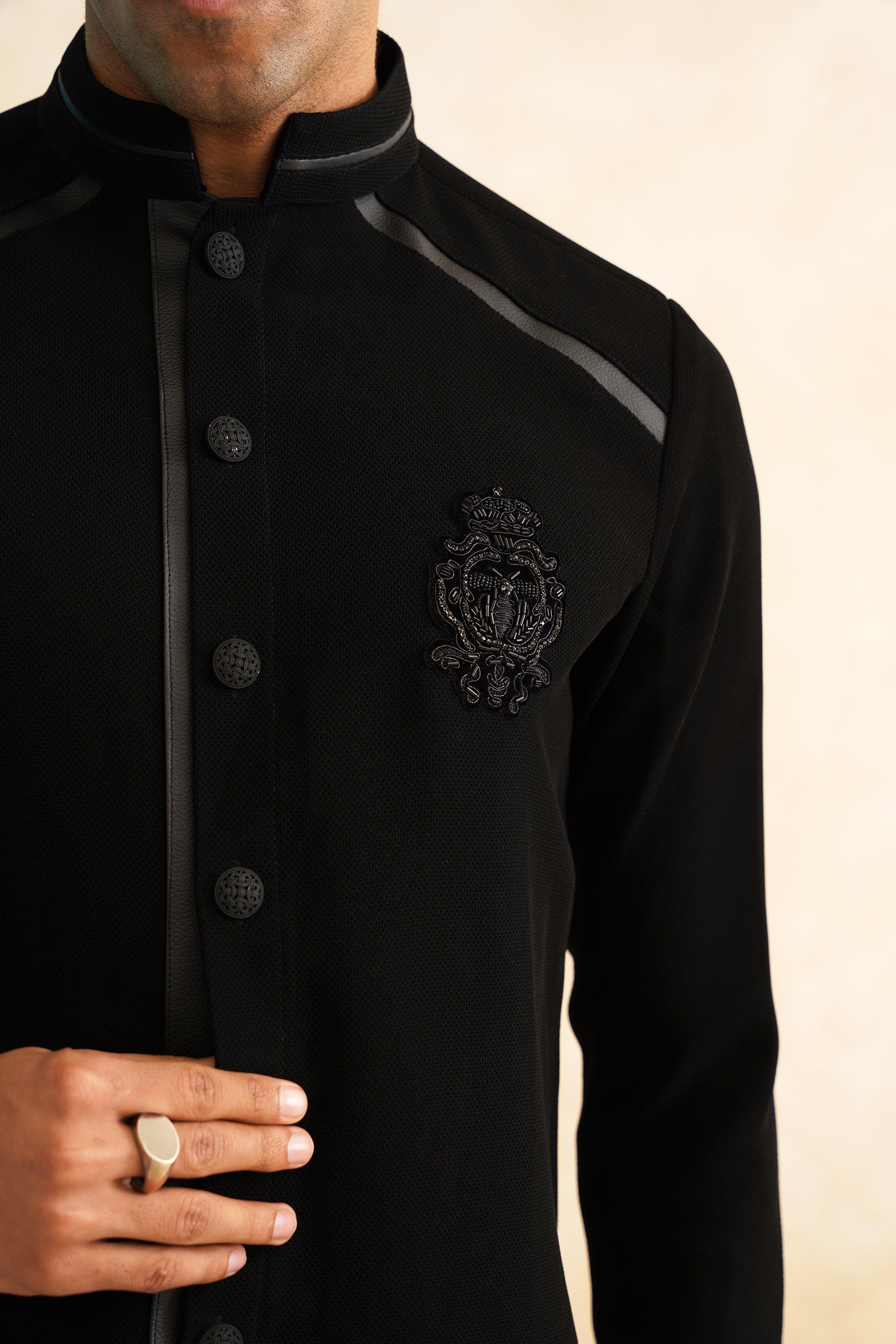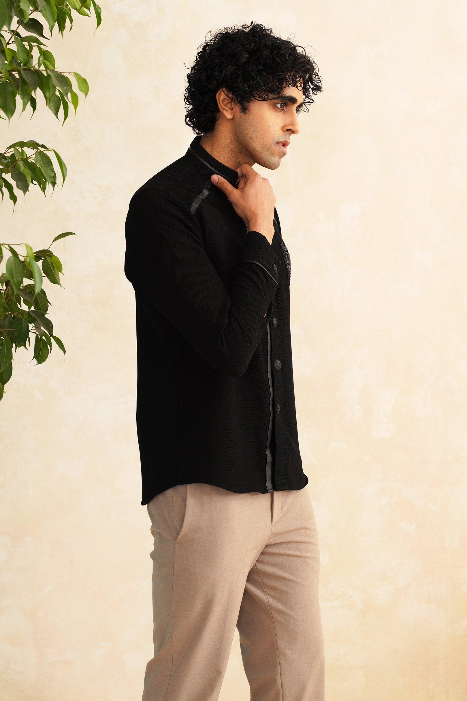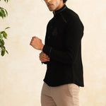 Command elegance with Crown Black – Black embroidered designer shirt for men, a distinguished black shirt tailored in rich Japanese fabric that offers a luxurious feel and flawless fall. This contemporary Bandhgala-style shirt features structured shoulders, tonal piping across the yoke, and a sleek buttoned placket. A regal embroidered crest on the chest adds a signature touch of nobility, making this piece a modern tribute to classic royal fashion. Ideal for upscale dinners, festive evenings, or statement formalwear.