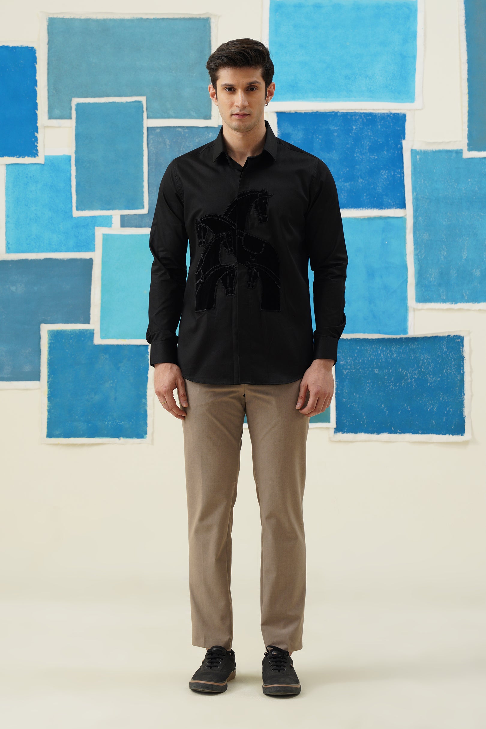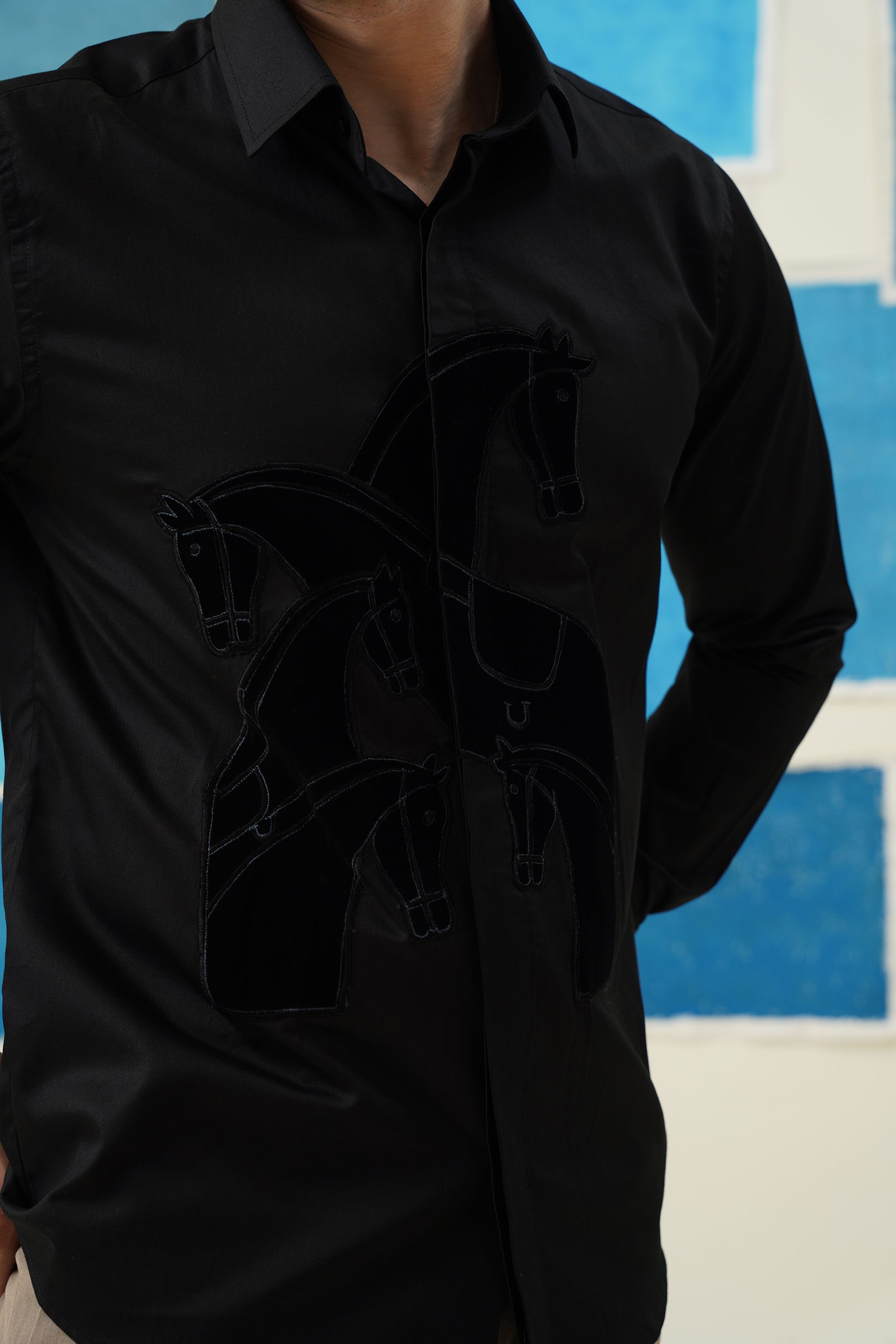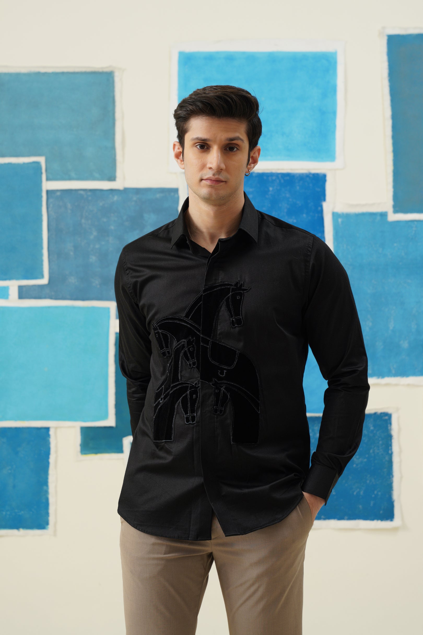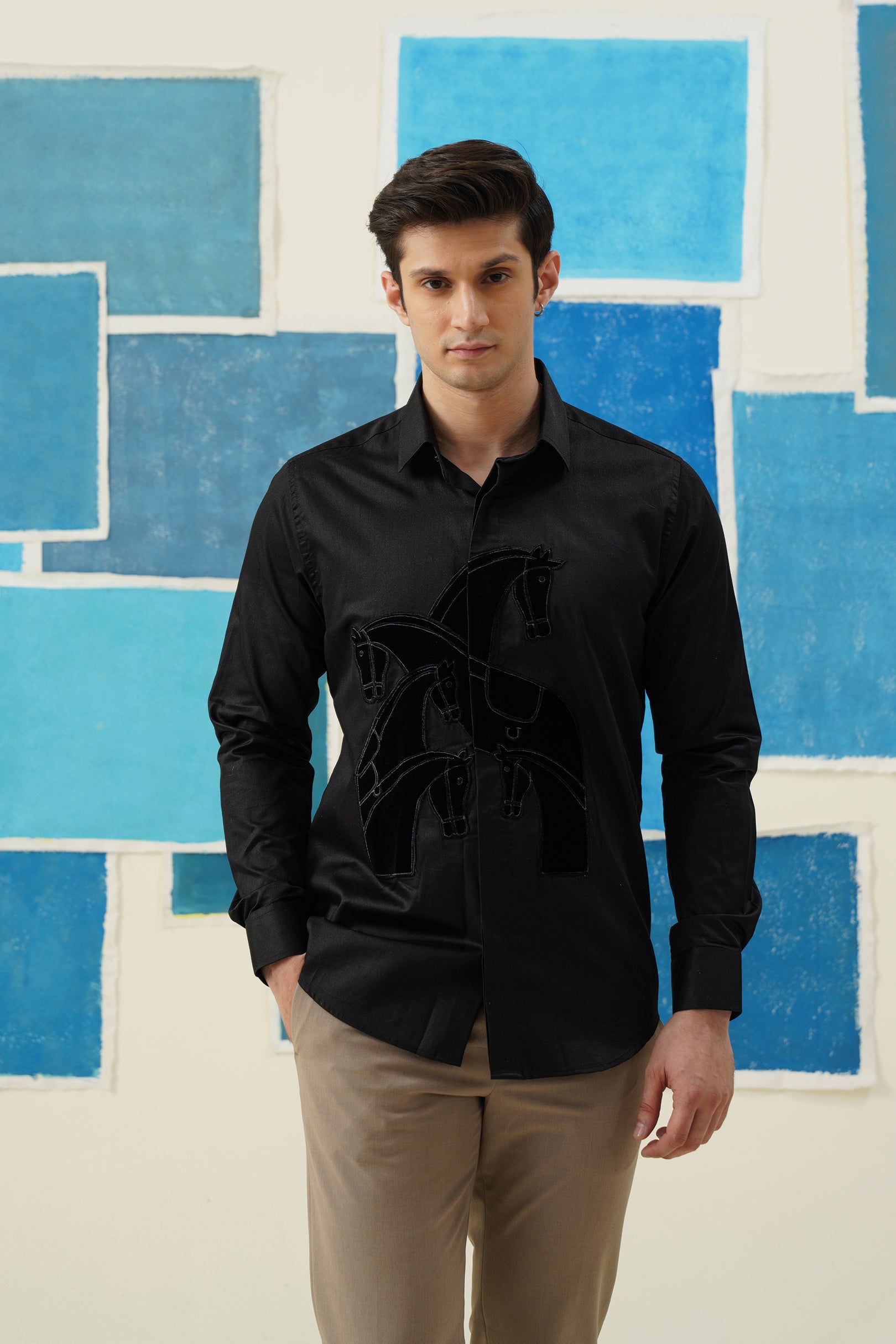 Crafted from the finest Giza cotton, this shirt embodies the perfect blend of luxury and style. The rich, smooth texture of the cotton is complemented by a striking velvet patch of intricately embroidered horses, adding a touch of sophistication and artistic flair to the design. The deep black fabric serves as a canvas for the bold, yet elegant, equestrian motif, making this shirt a statement piece for any modern wardrobe. Whether paired with formal trousers or casual chinos, this shirt is versatile enough for both day and evening wear, exuding a refined, effortless charm.