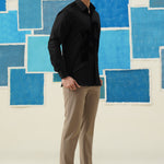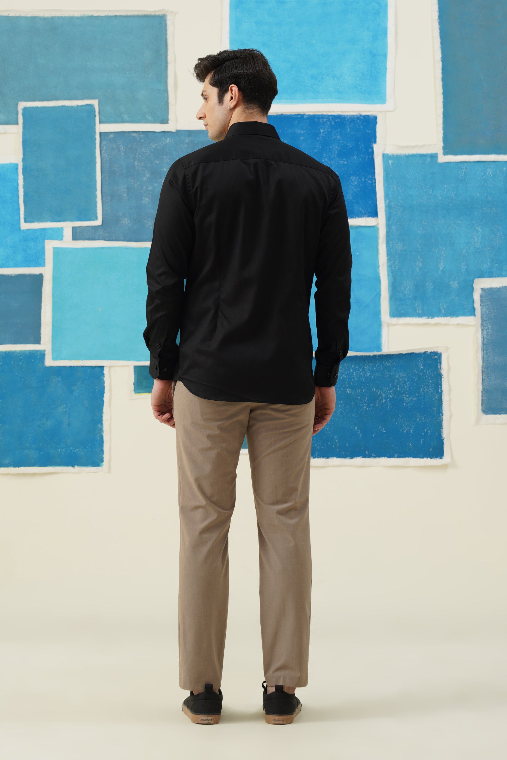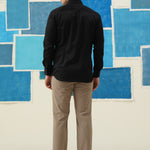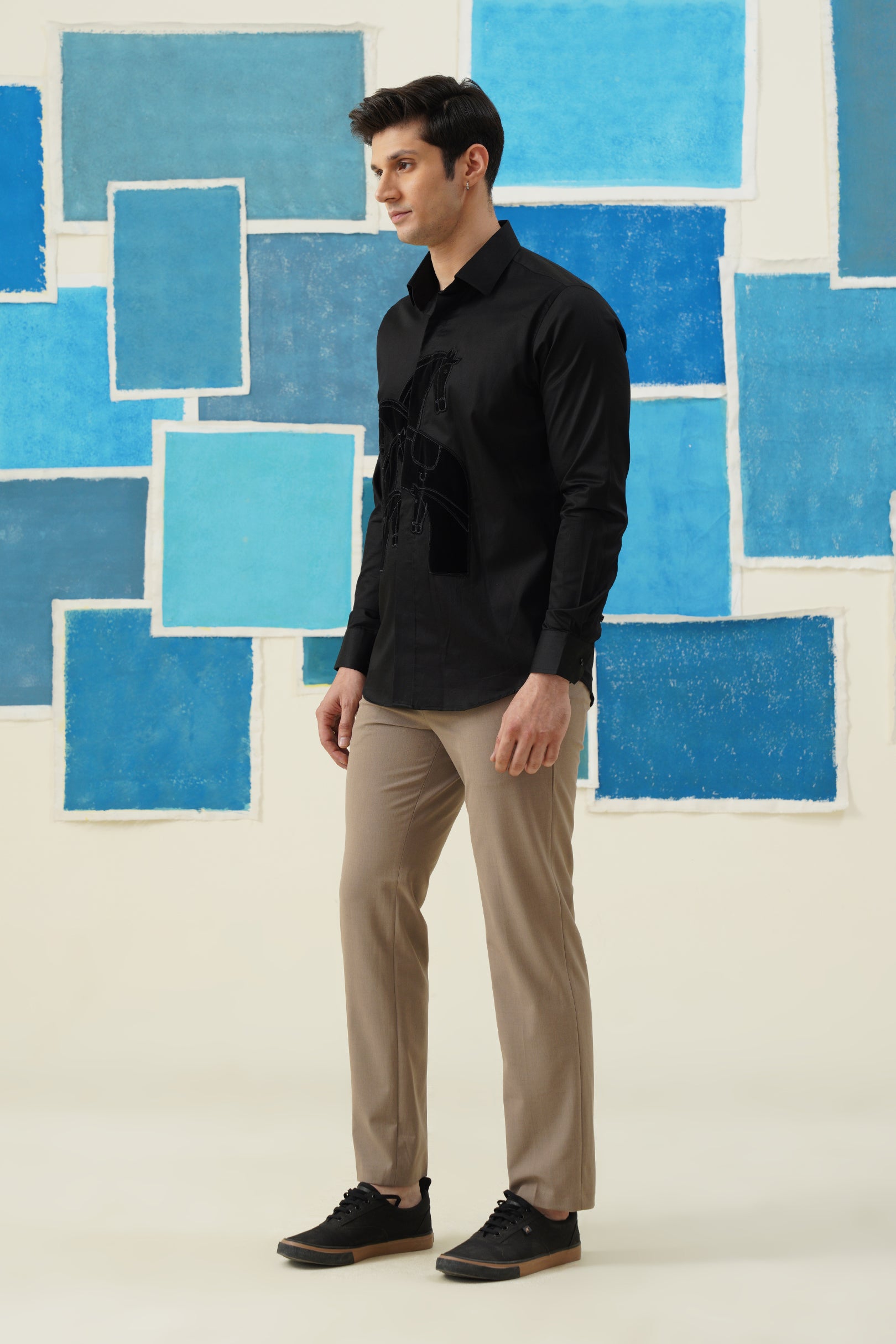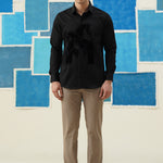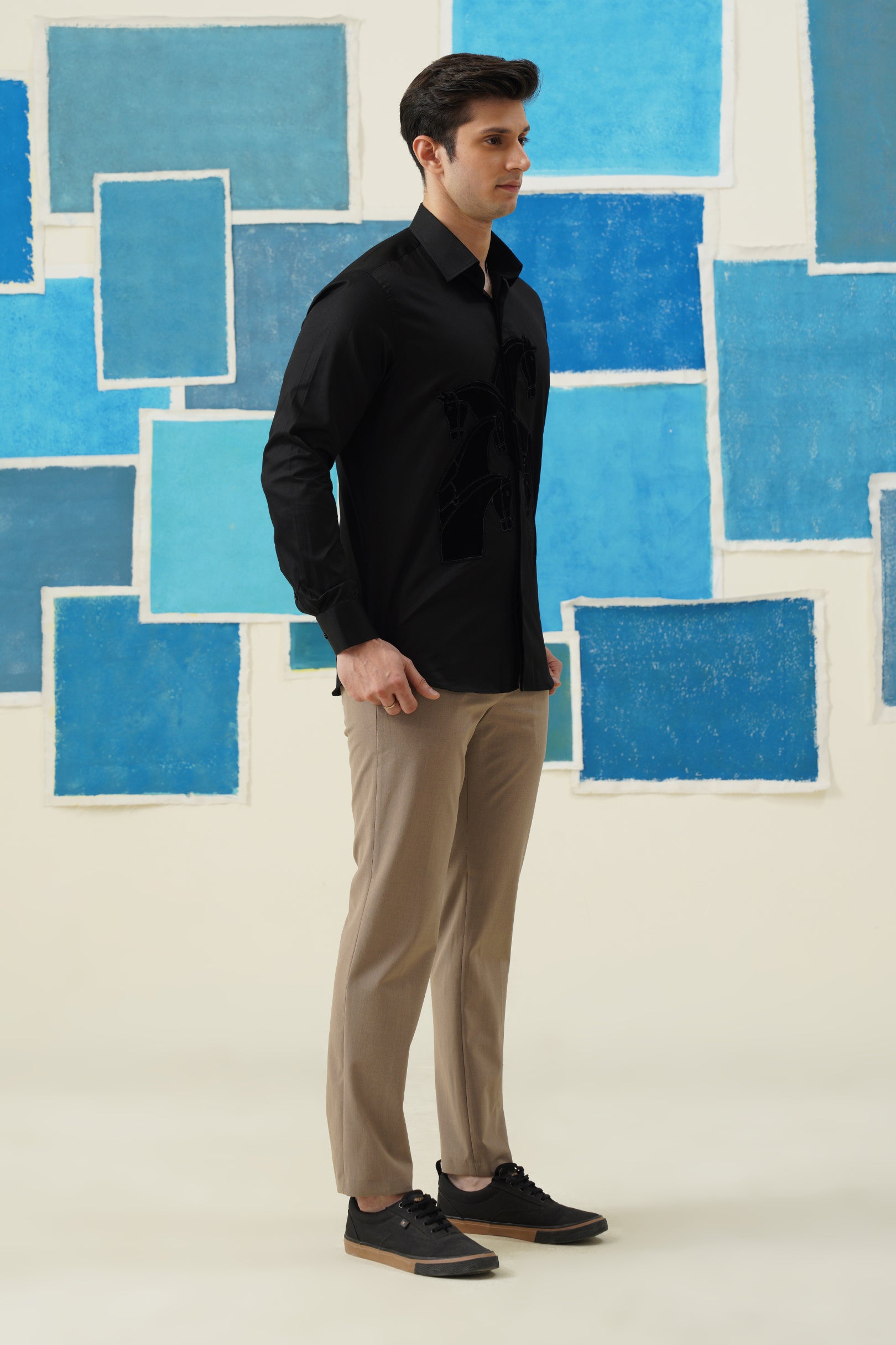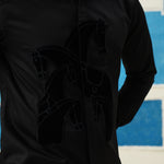 Crafted from the finest Giza cotton, this shirt embodies the perfect blend of luxury and style. The rich, smooth texture of the cotton is complemented by a striking velvet patch of intricately embroidered horses, adding a touch of sophistication and artistic flair to the design. The deep black fabric serves as a canvas for the bold, yet elegant, equestrian motif, making this shirt a statement piece for any modern wardrobe. Whether paired with formal trousers or casual chinos, this shirt is versatile enough for both day and evening wear, exuding a refined, effortless charm.