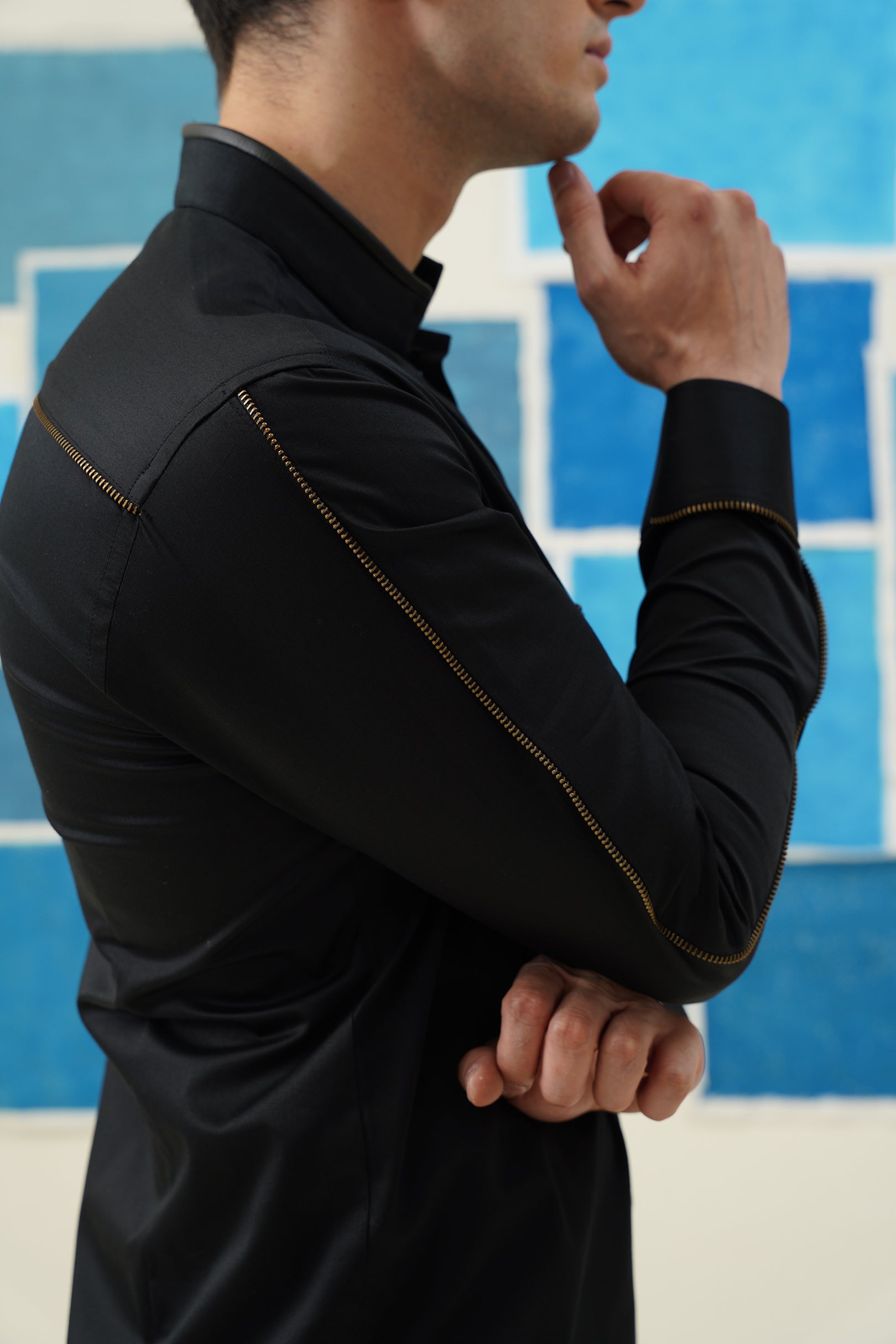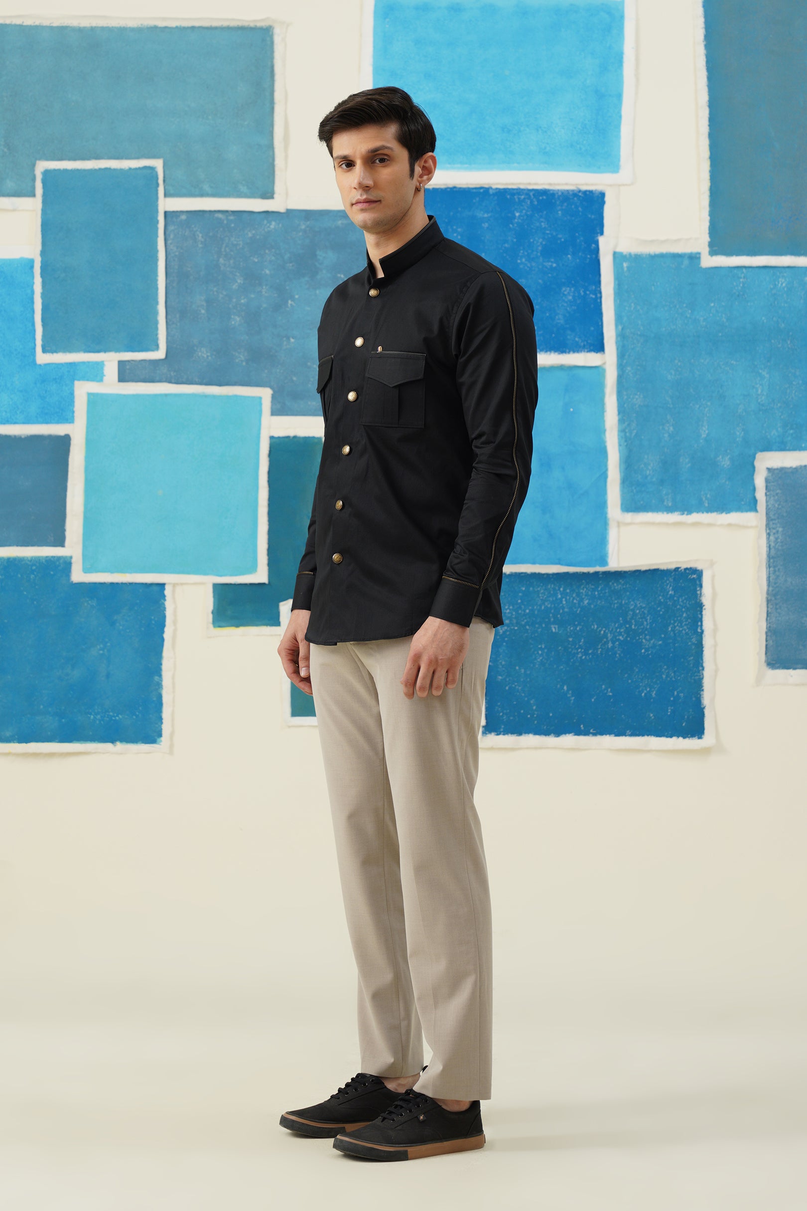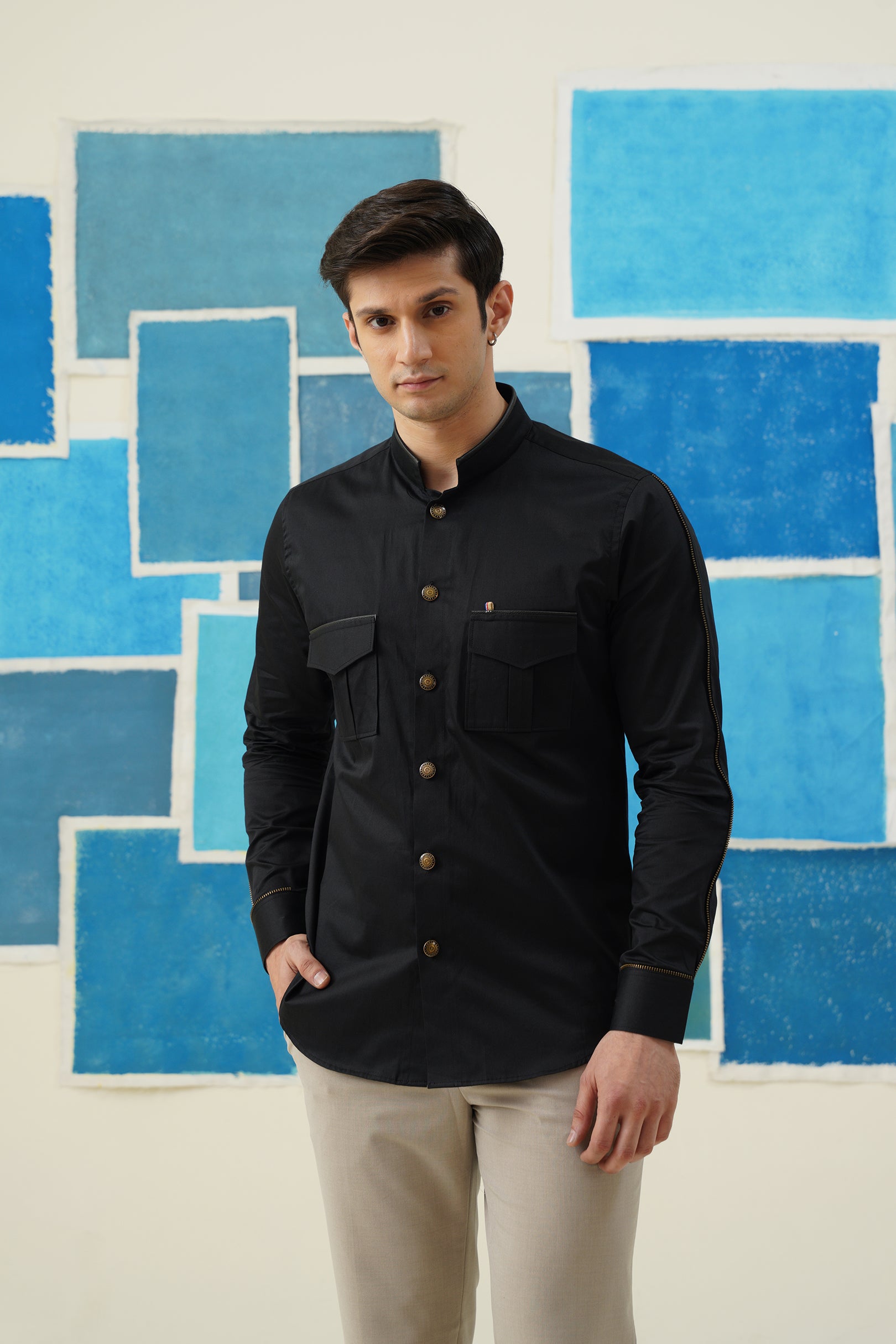 Featuring bold chest pockets with chain detailing and a stand collar, the Explorer Chain shirt offers an elevated take on the classic hunting shirt. The black color adds a timeless elegance, while the chain accents provide a subtle yet striking contrast, making this shirt a must-have for those who appreciate both fashion and function.