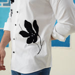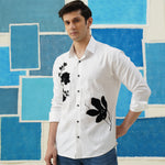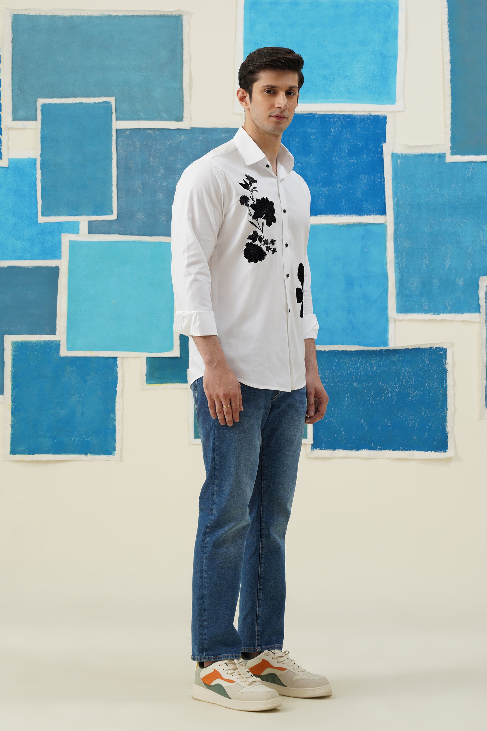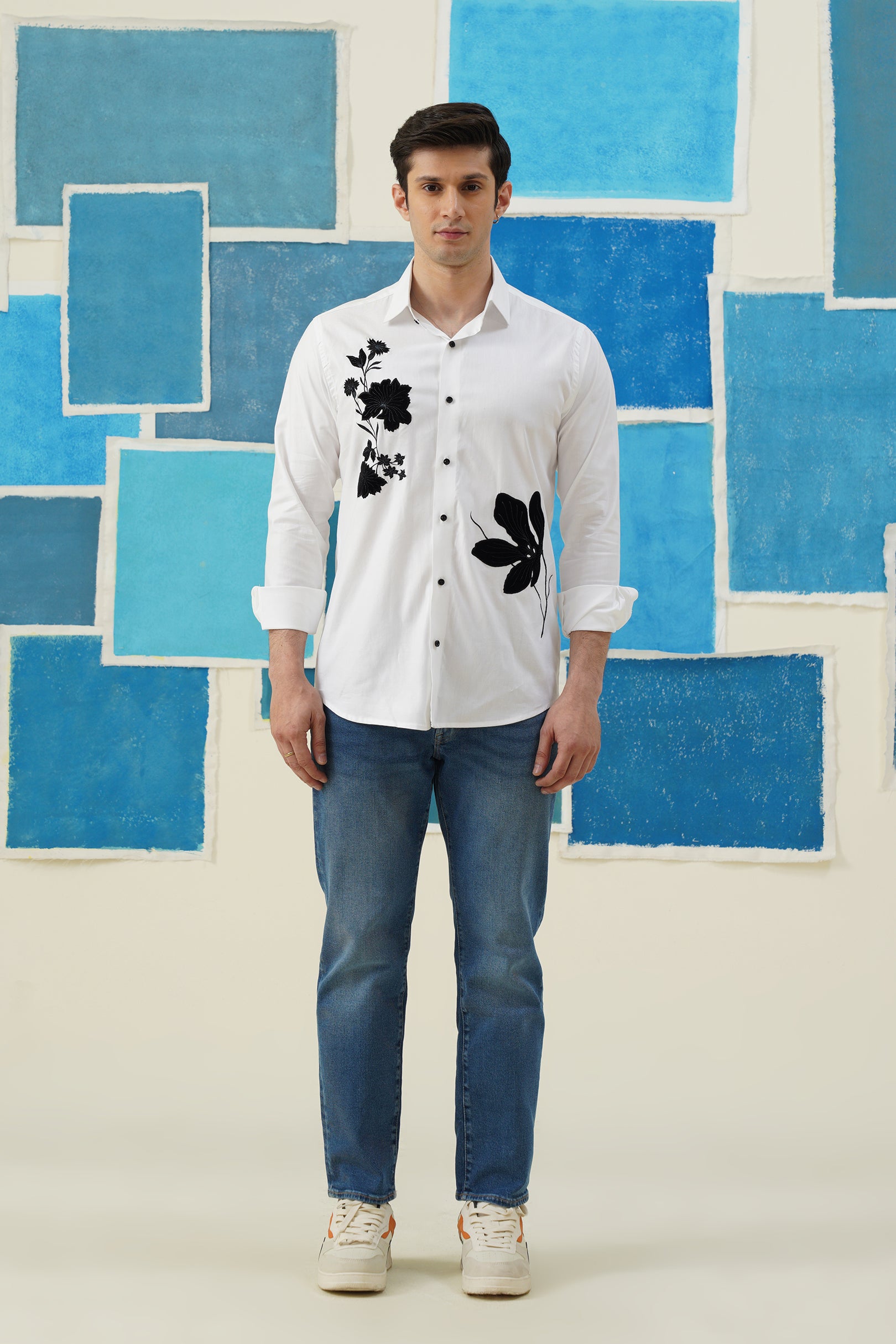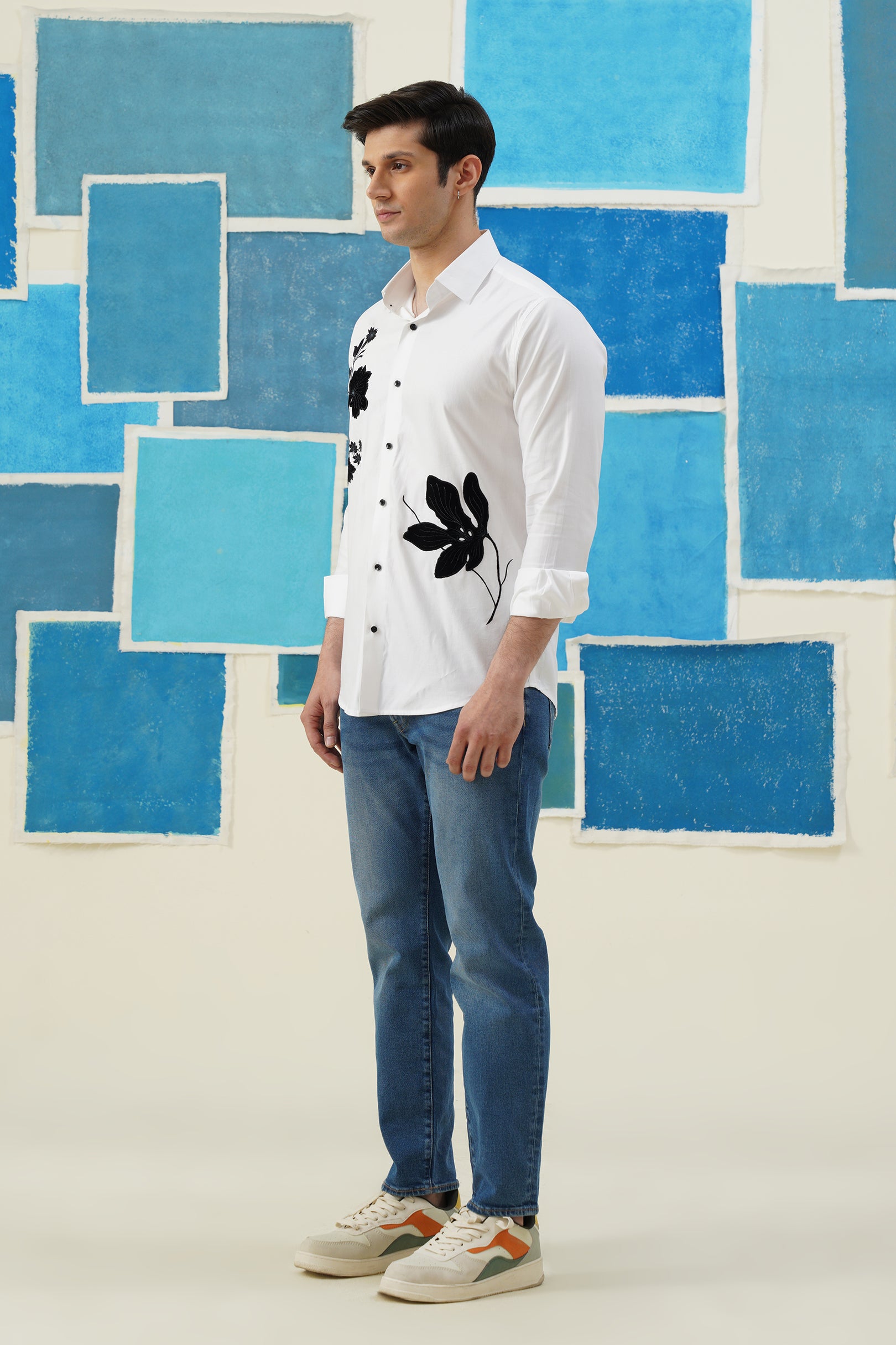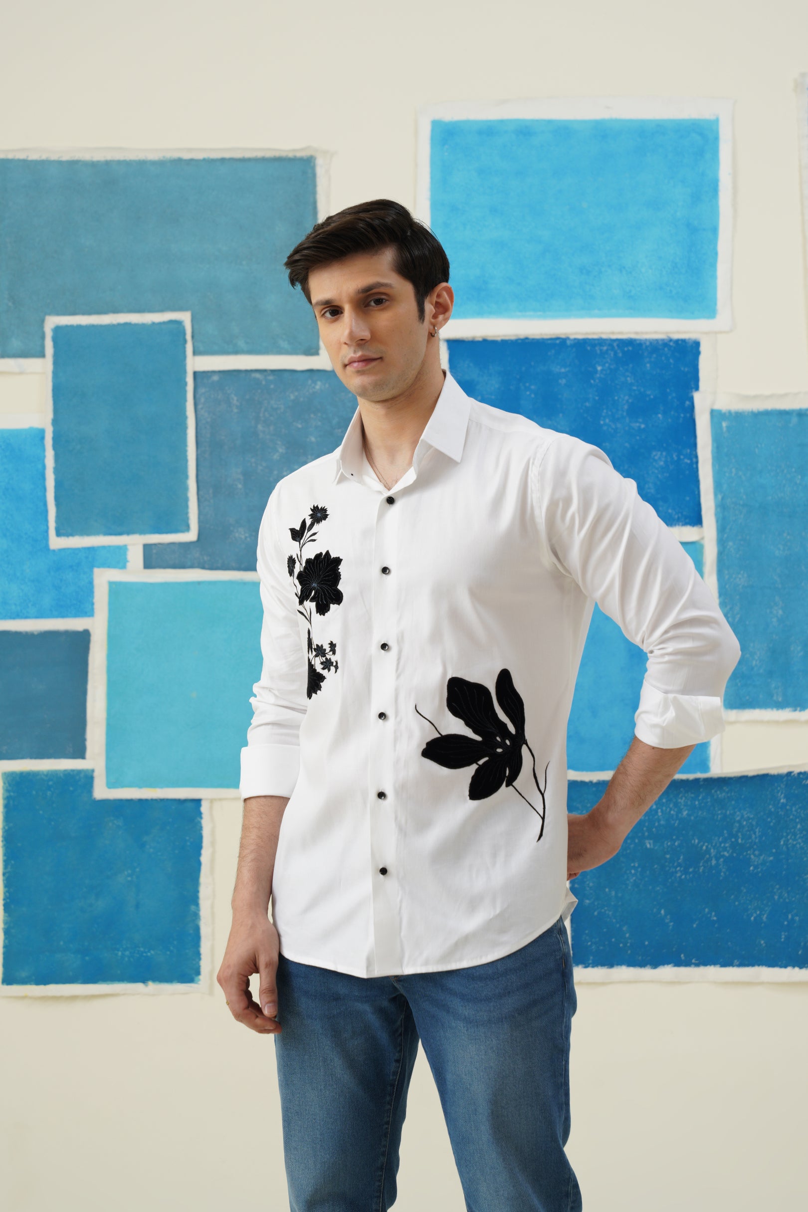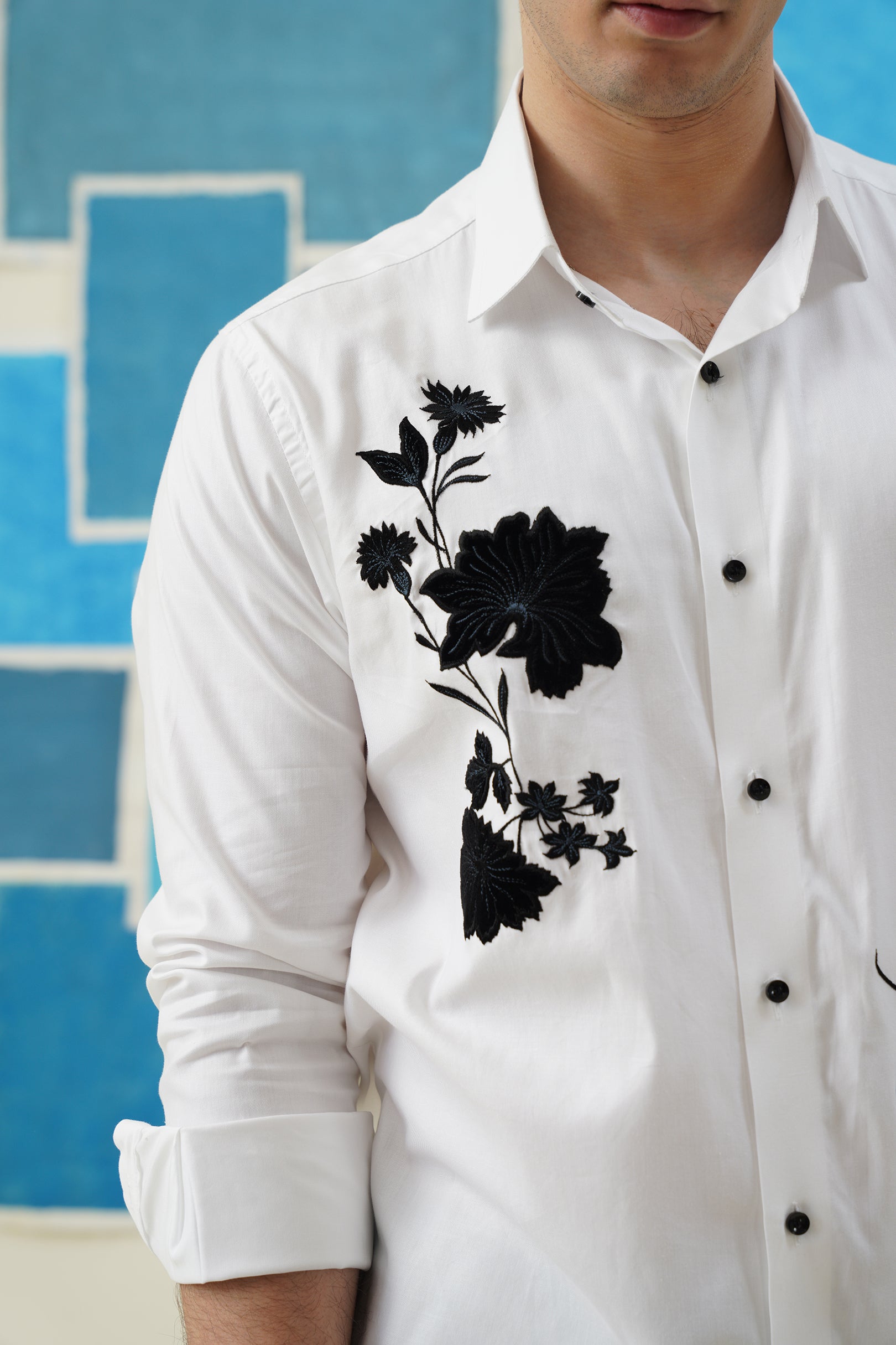 Introducing the Floral Fusion shirt, where modern design meets luxury craftsmanship. This shirt is made from premium Giza cotton, known for its superior softness, breathability, and sleek finish. The main highlight of this shirt is the intricate appliqué work that adorns the left side, featuring bold floral patterns in a contrasting black thread, creating a striking visual impact.