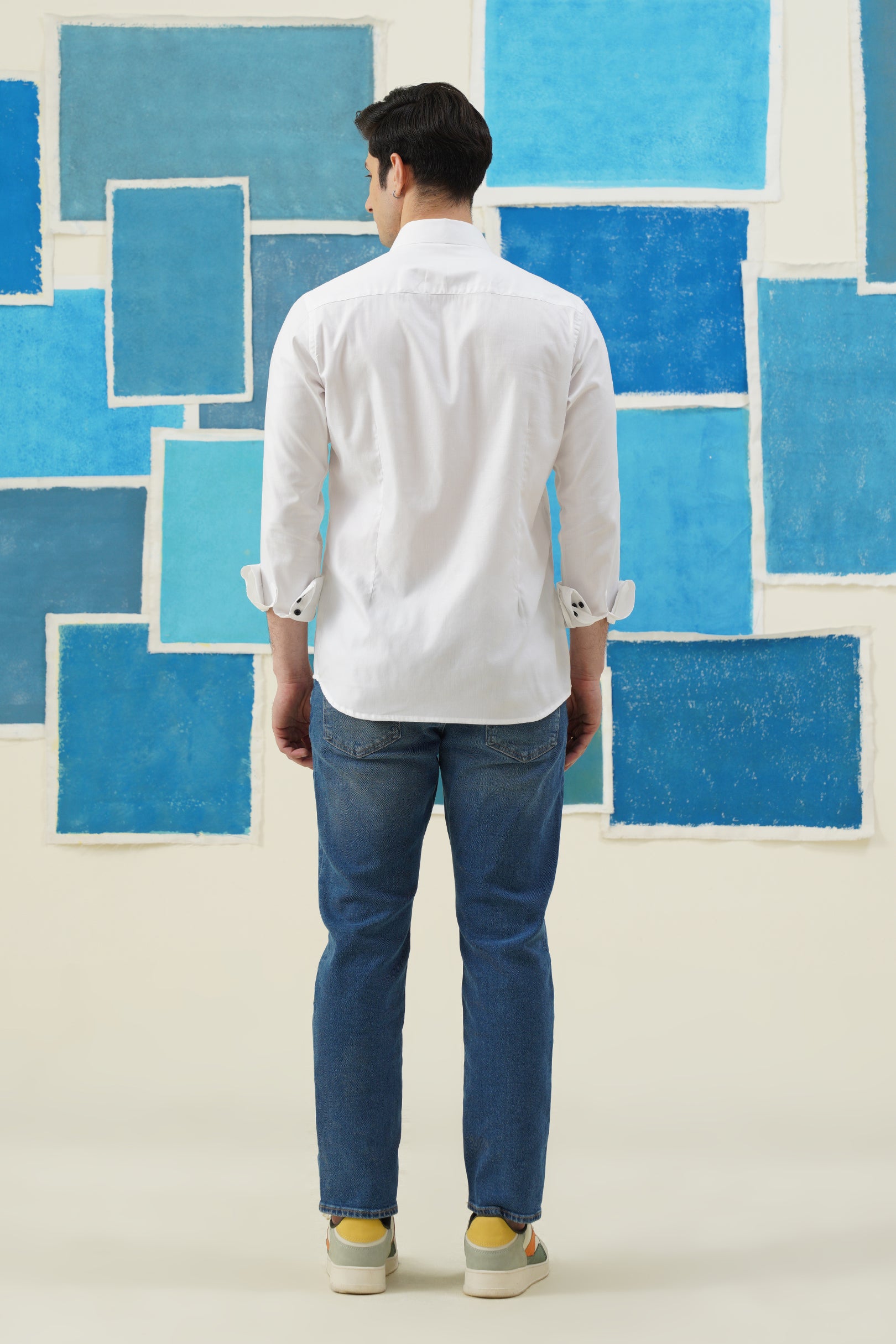 The appliqué technique adds texture and depth to the design, making it a standout piece in any wardrobe. The shirt’s crisp white fabric serves as the perfect canvas for the bold appliqué, ensuring that the design remains the focal point. Ideal for both casual and semi-formal occasions, this versatile piece can easily be paired with jeans or tailored trousers for a refined, modern look.