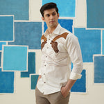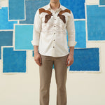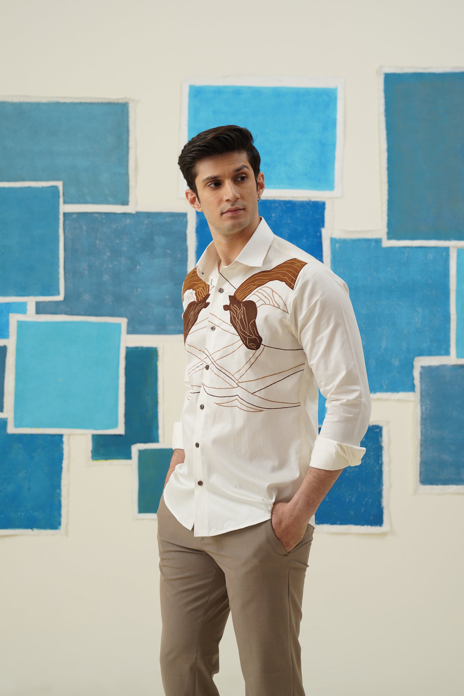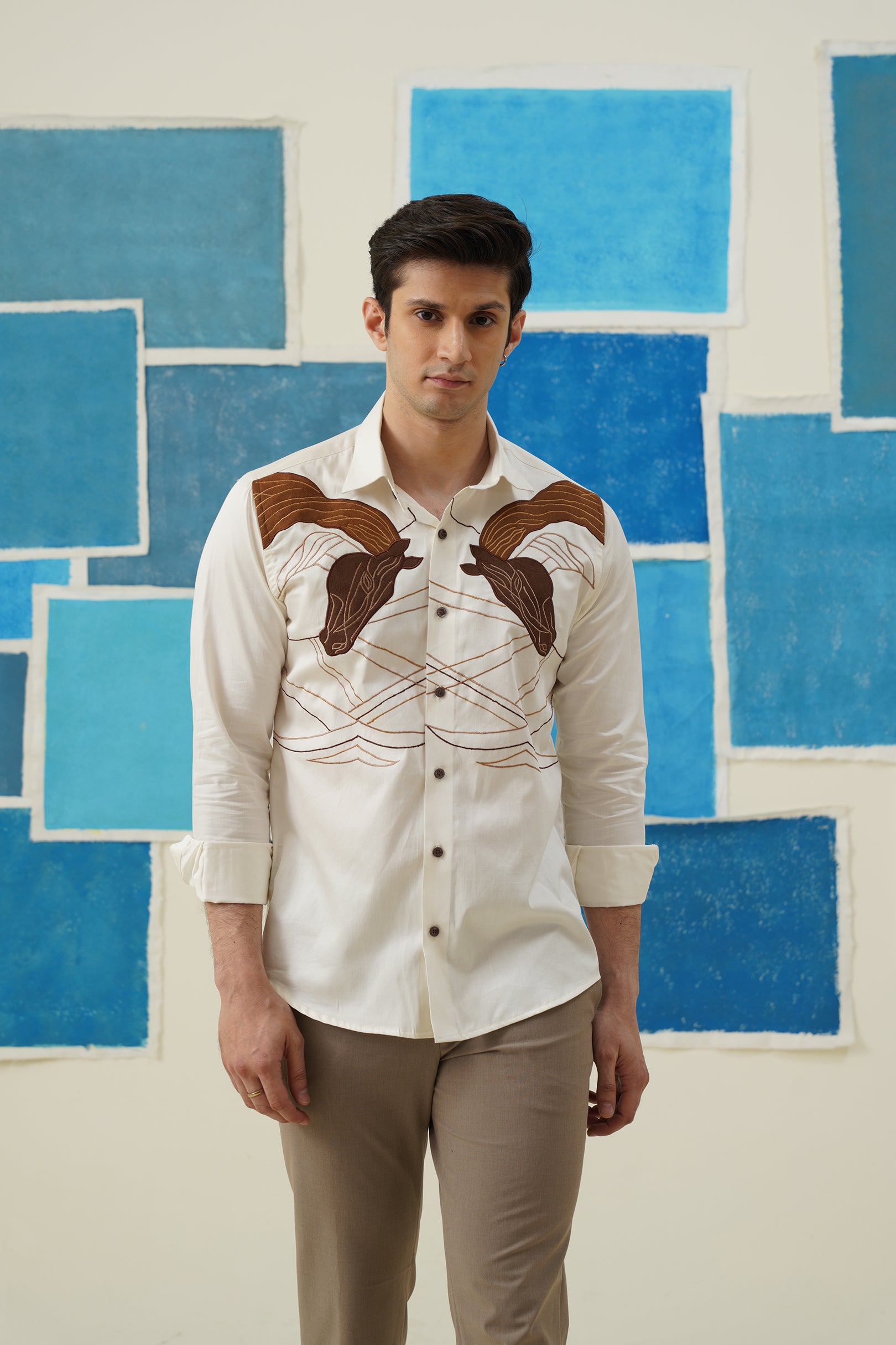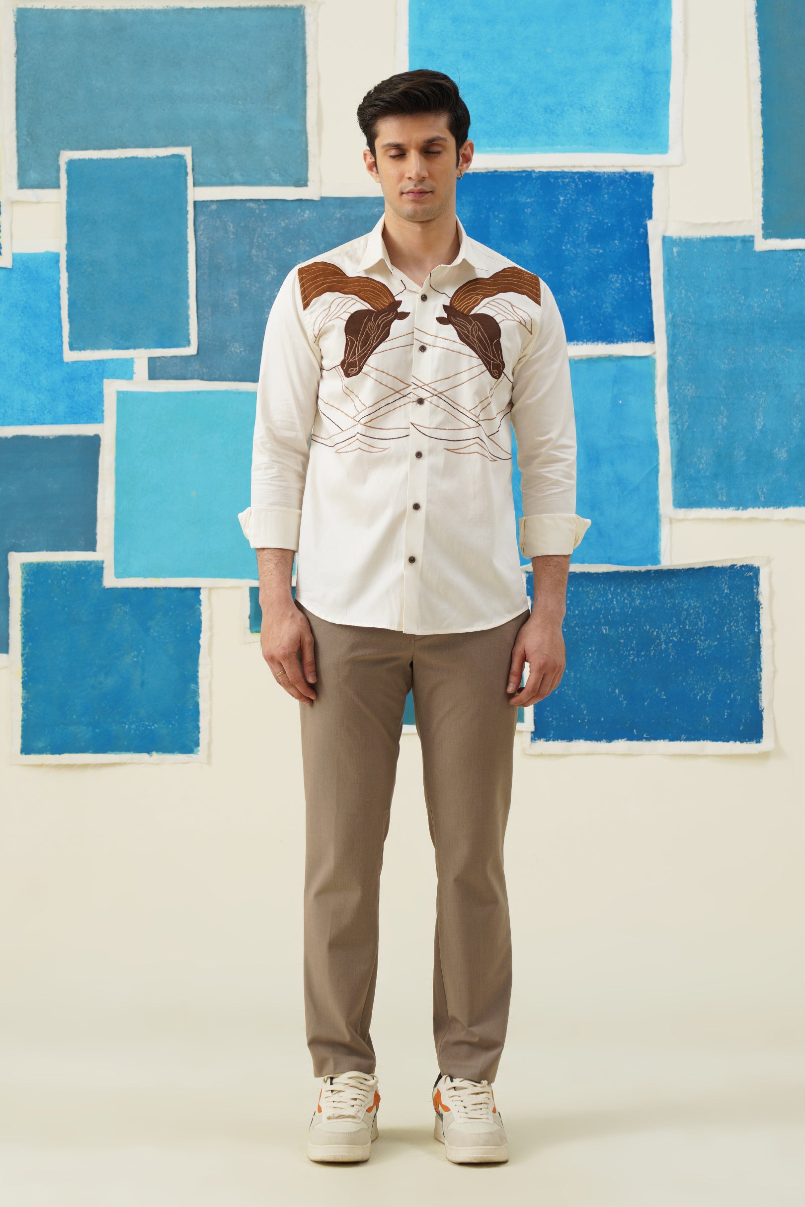 Elevate your style with this elegant Giza cotton shirt, a perfect fusion of comfort and sophistication. The shirt features intricate horse embroidery, with the detailed design beautifully positioned on the shoulders and chest. The rich brown tones of the embroidery contrast gracefully against the soft cream base, creating a bold yet refined look. Ideal for both casual and semi-formal occasions, this shirt promises to add a distinct touch to your wardrobe. The high-quality Giza cotton ensures breathability and a luxurious feel, making it a go-to piece for those who value craftsmanship and style.