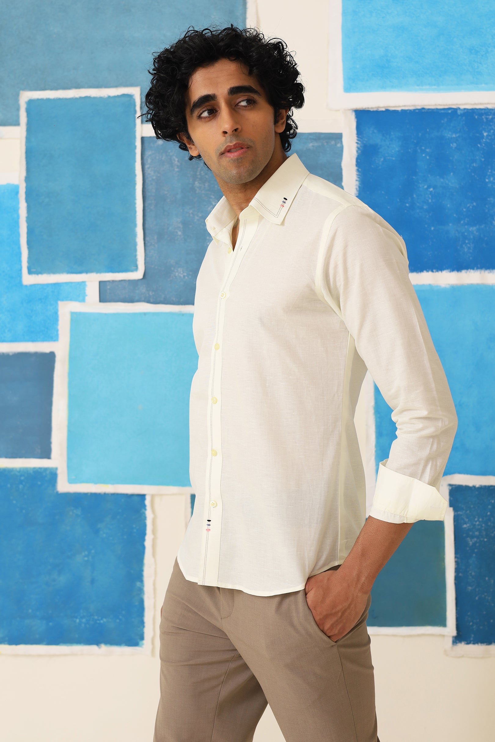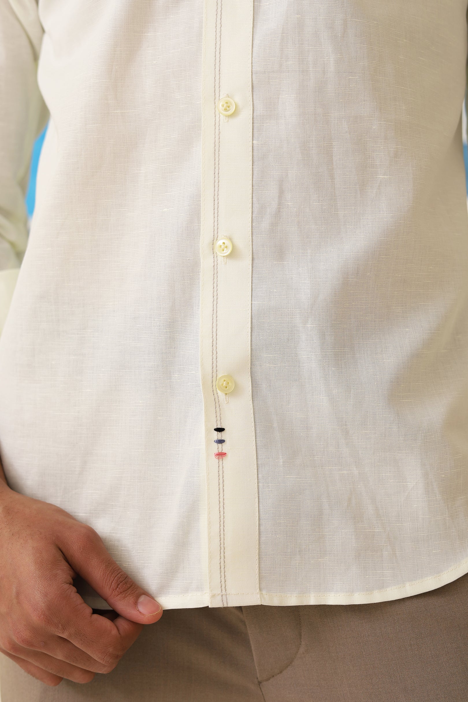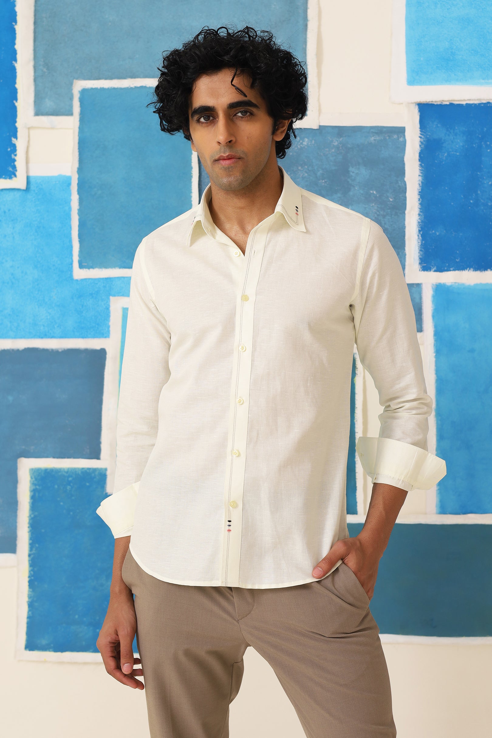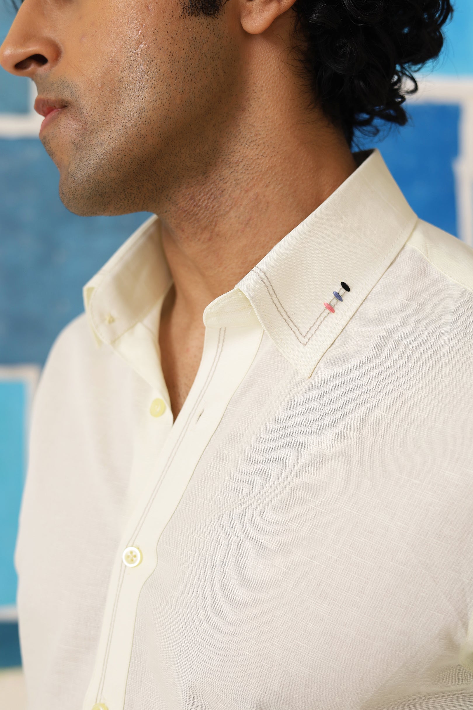 Elevate your everyday wardrobe with our Ivory Linen Shirt, a timeless essential crafted from the finest breathable linen. Designed for the discerning gentleman, this shirt features a sleek silhouette with a soft, natural drape. Subtle contrast hand embroidery on the collar and placket adds a refined, artisanal touch—an ode to understated elegance.