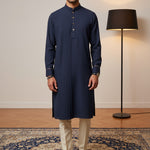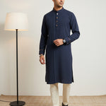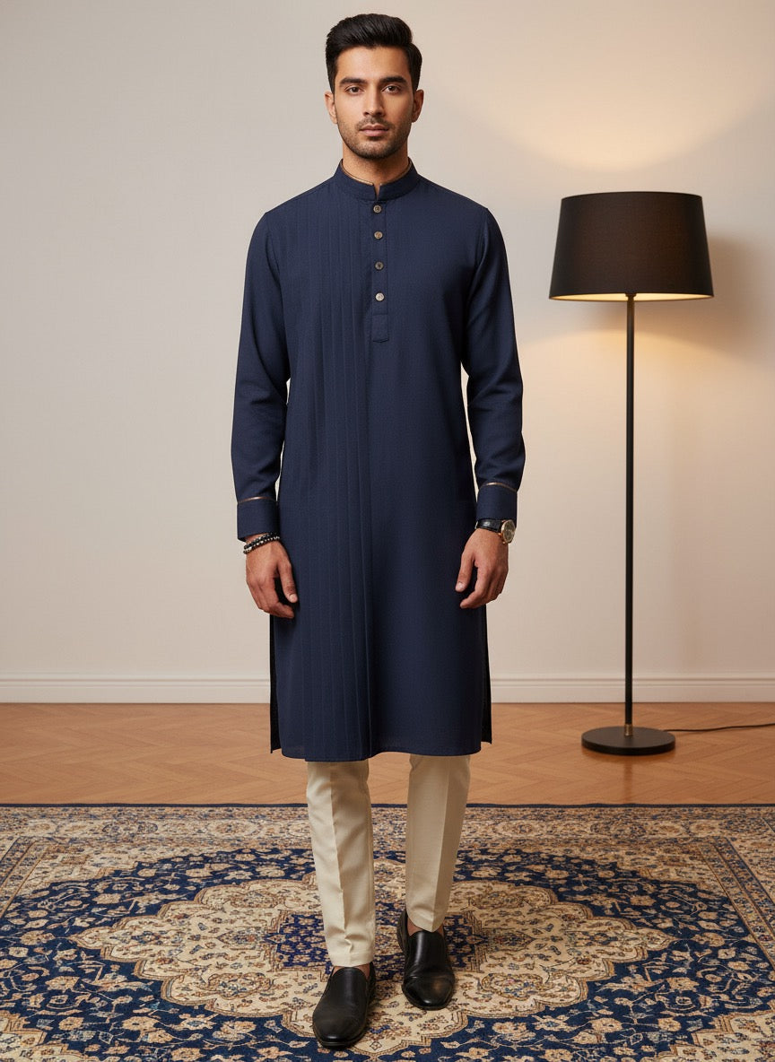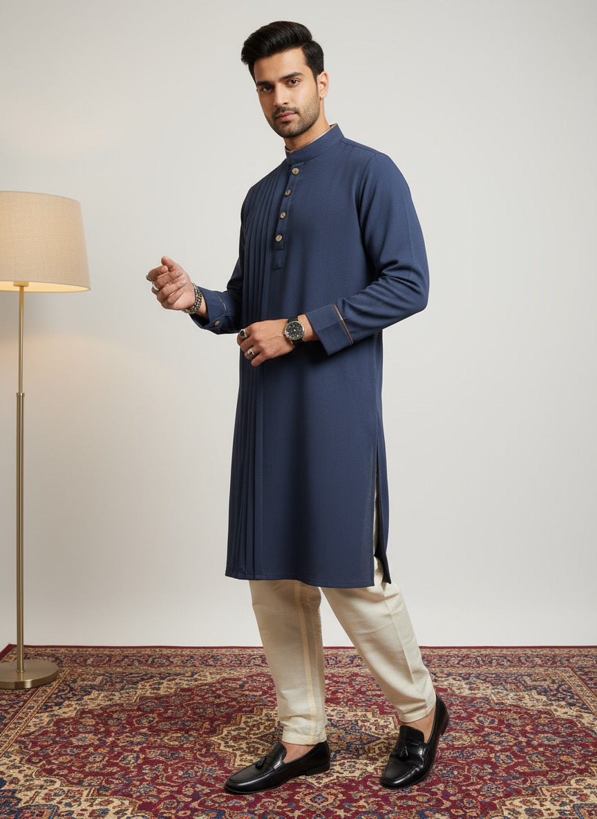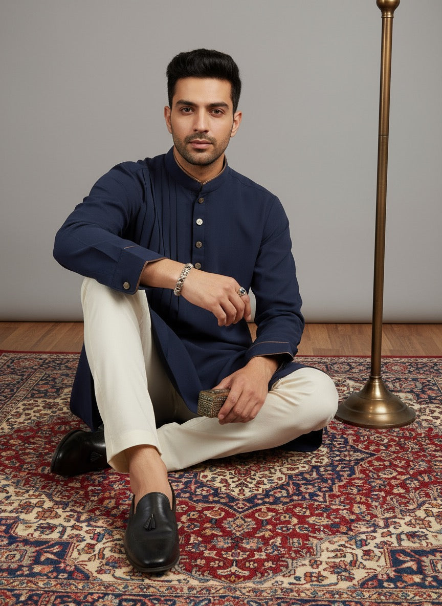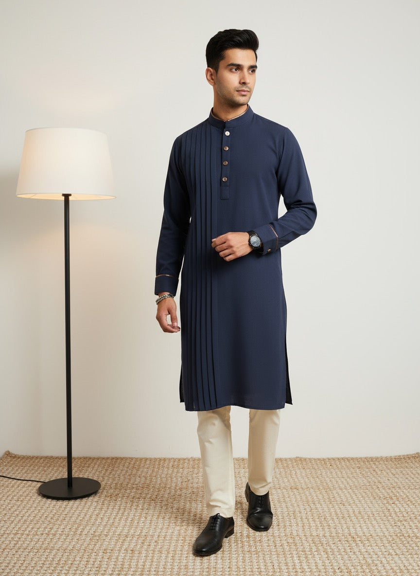 The Kyoto Blue Pleat Kurta blends breathable Japanese mesh with rich dark brown leather accents and side tone-on-tone pitex. Signature pleats on the front panel create an elevated, contemporary look—perfect for modern festive occasions and premium celebrations.