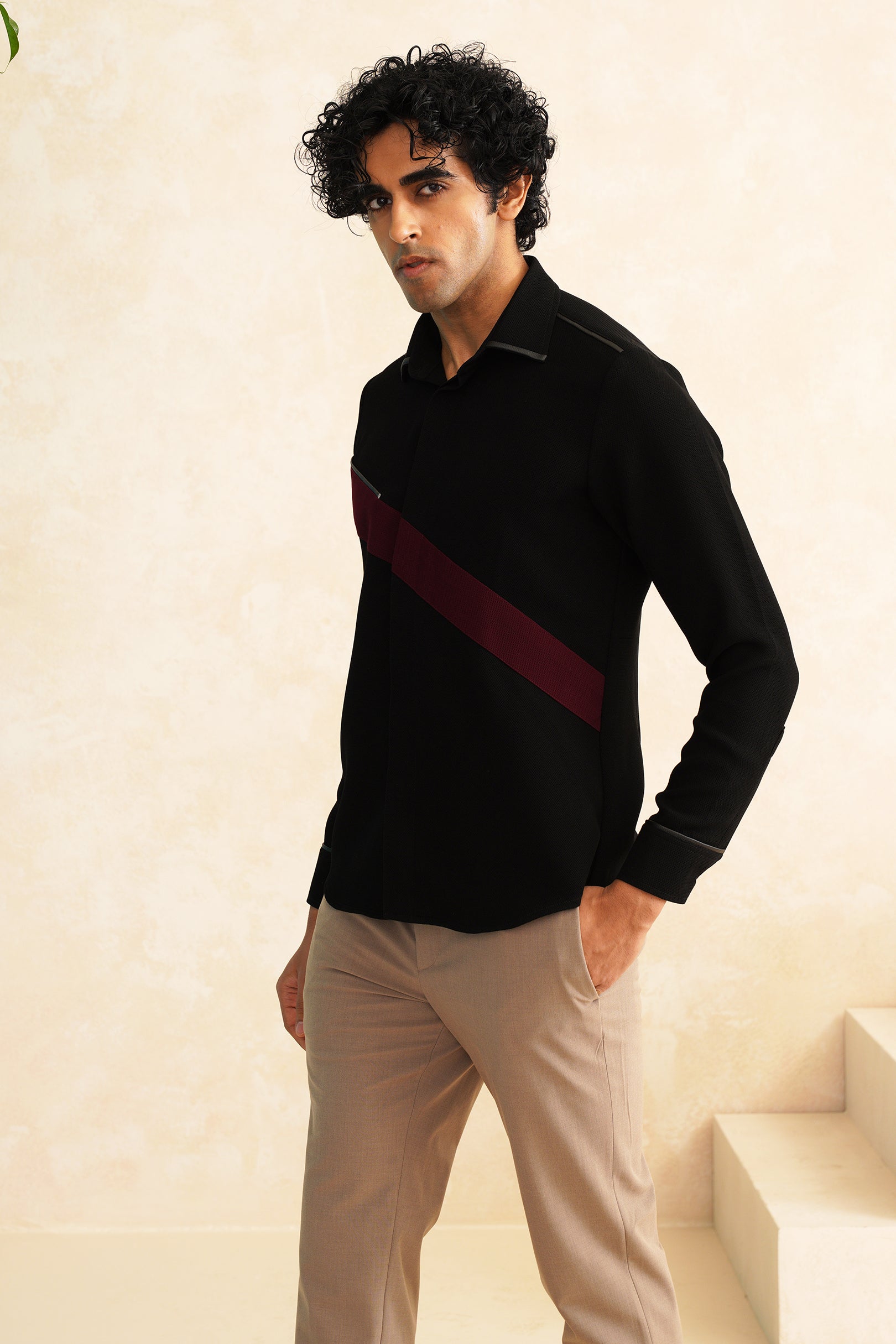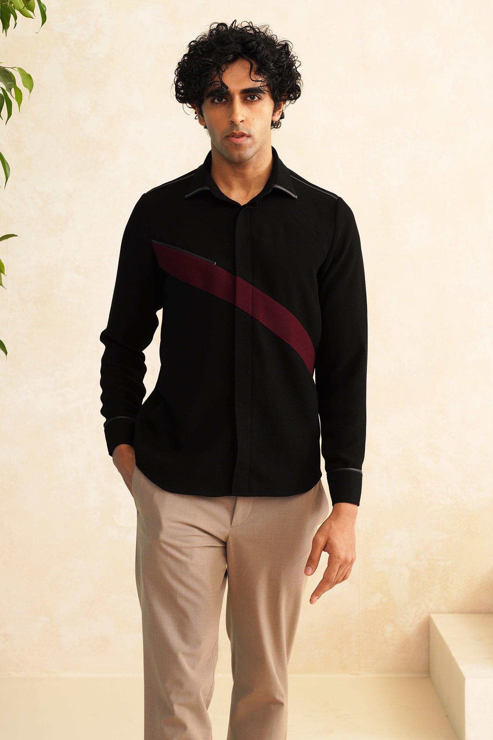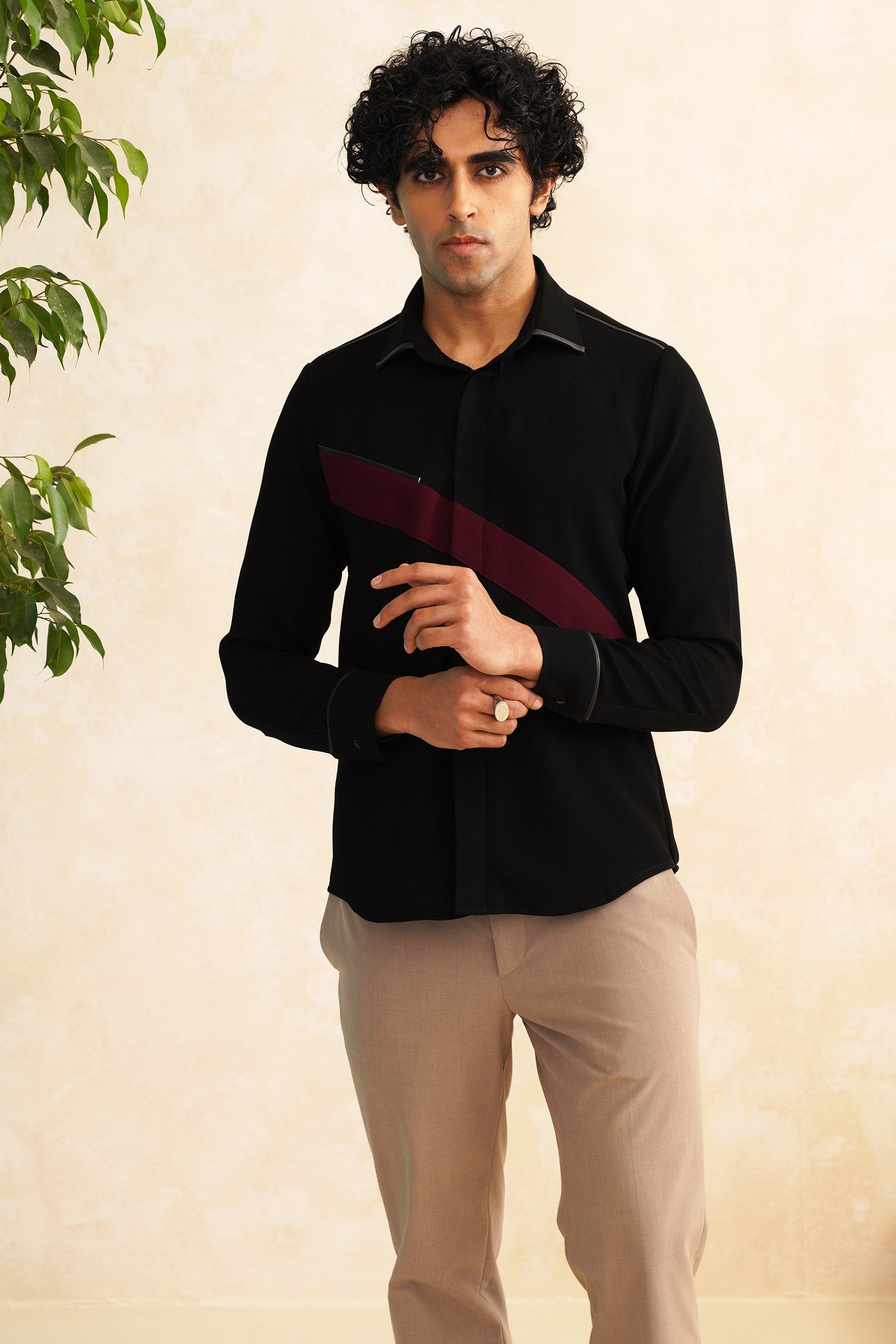 Elevate your evening ensemble with Midnight Line, a refined black shirt crafted from premium Japanese fabric known for its smooth texture and elegant drape. This statement piece features a striking burgundy diagonal slash across the chest, symbolizing bold individuality. Designed with a concealed placket and subtle piping on the cuffs and collar, it effortlessly blends minimalism with edge. Pair it with tailored trousers for a look that transitions seamlessly from dusk to dinner.