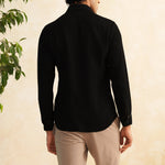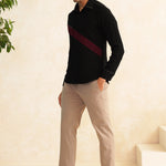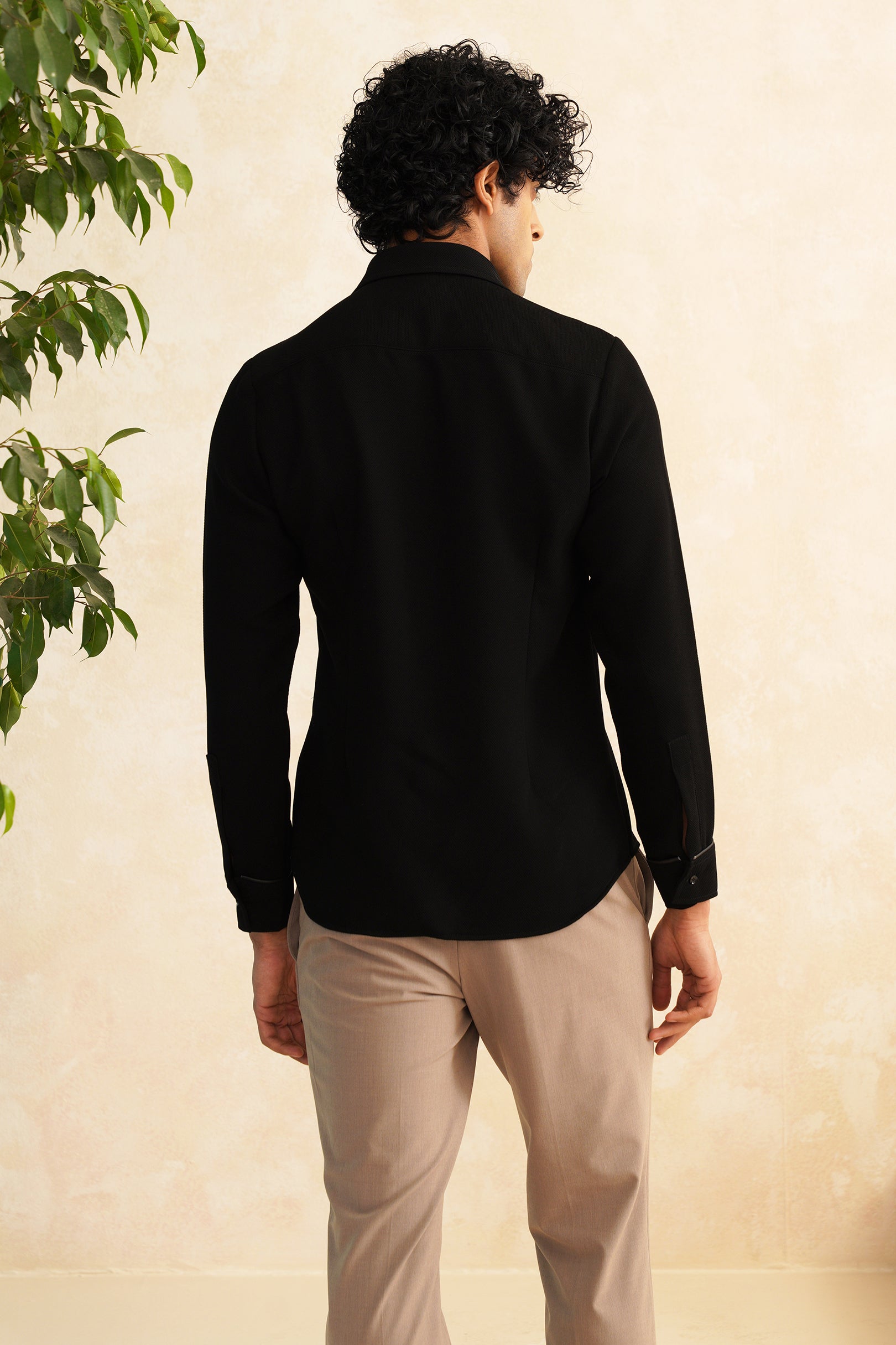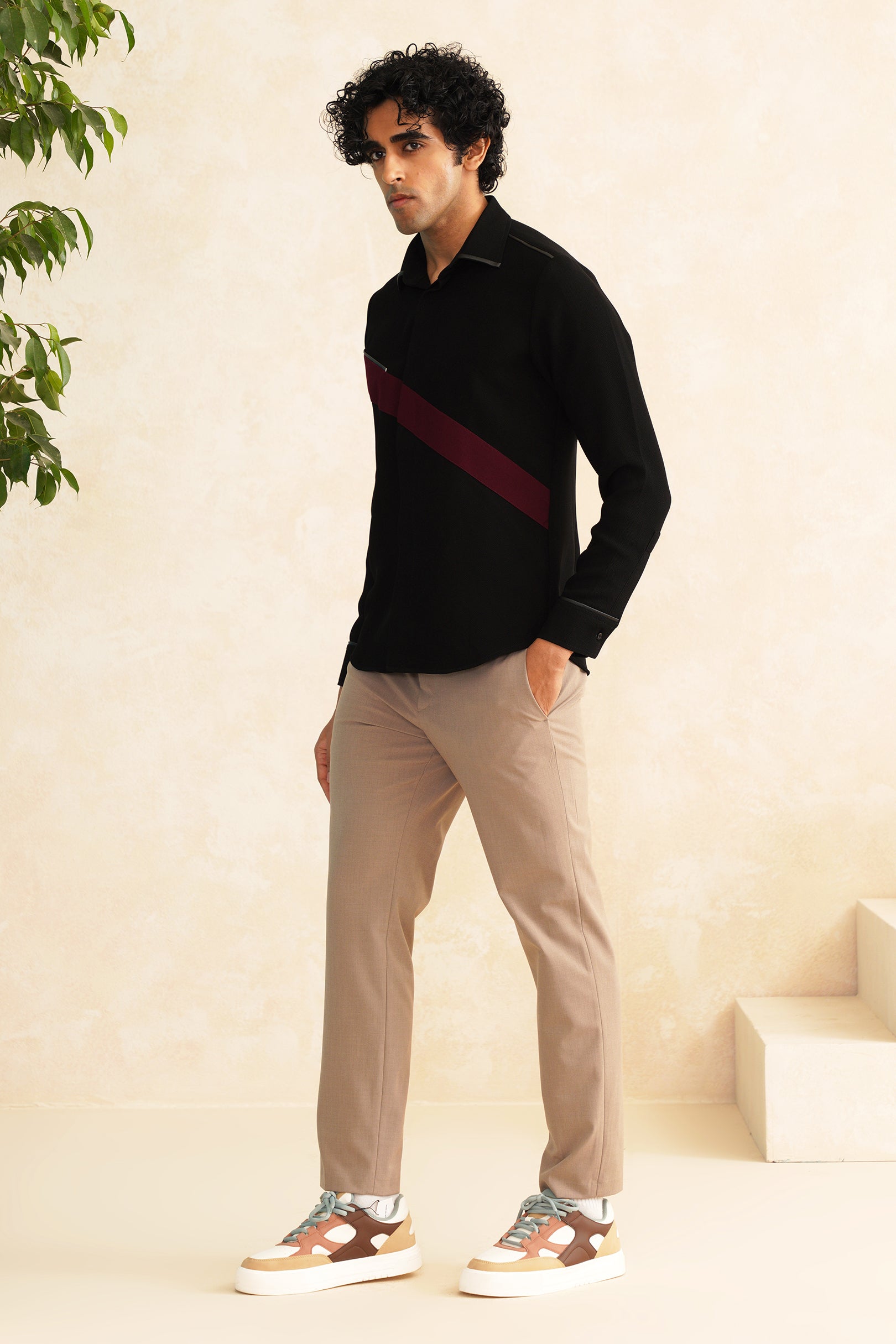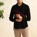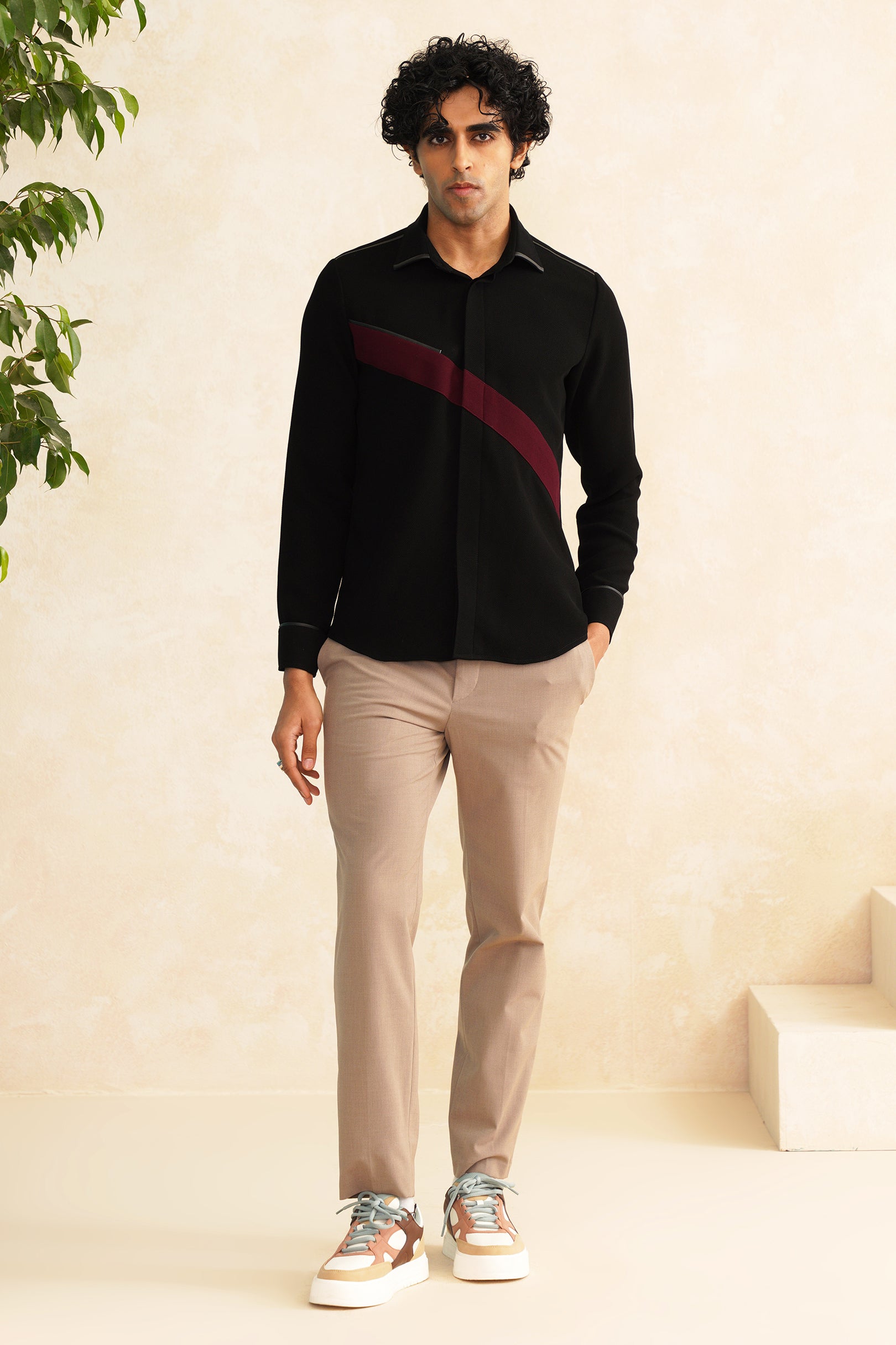 Elevate your evening ensemble with Midnight Line, a refined black shirt crafted from premium Japanese fabric known for its smooth texture and elegant drape. This statement piece features a striking burgundy diagonal slash across the chest, symbolizing bold individuality. Designed with a concealed placket and subtle piping on the cuffs and collar, it effortlessly blends minimalism with edge. Pair it with tailored trousers for a look that transitions seamlessly from dusk to dinner.