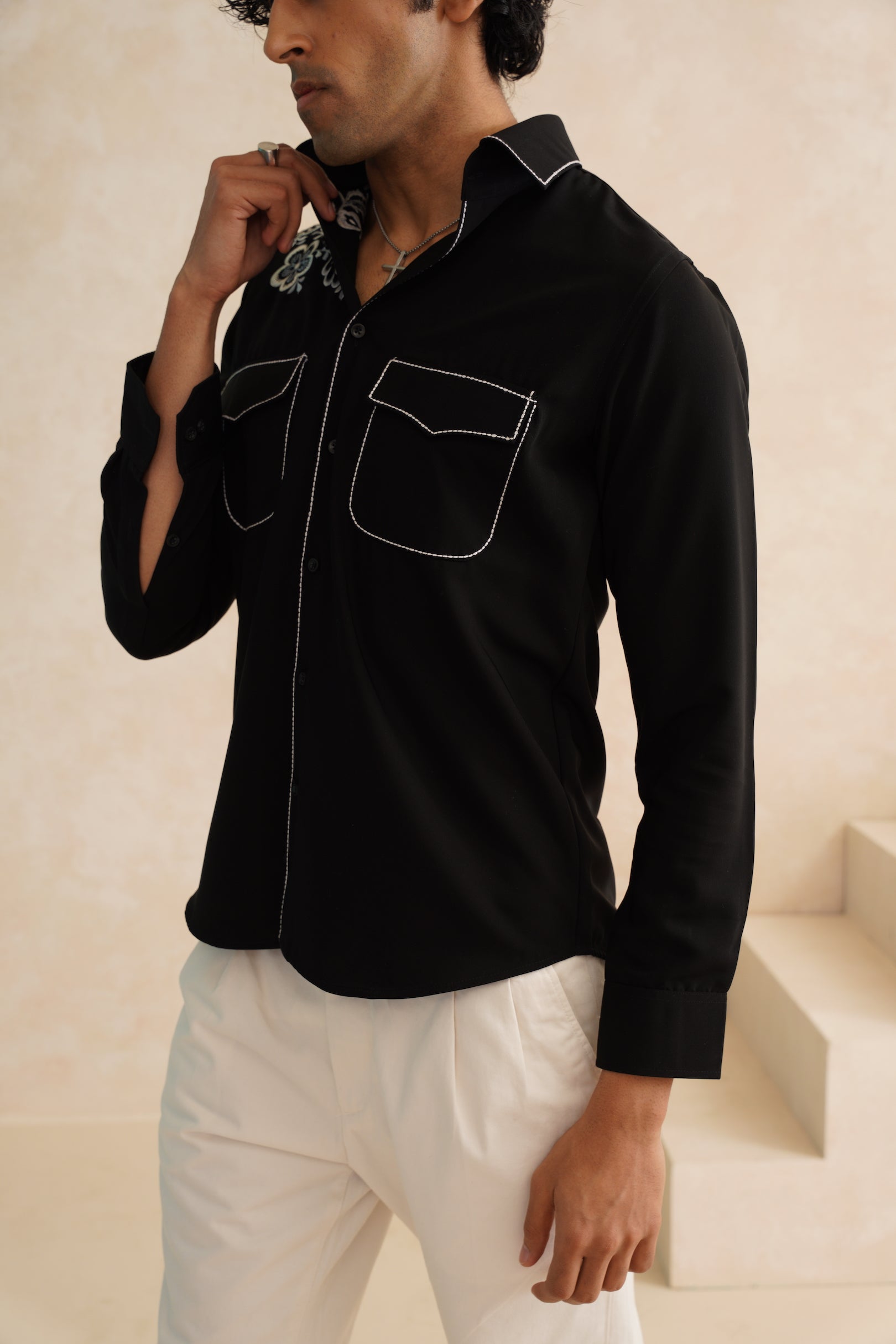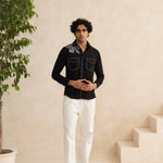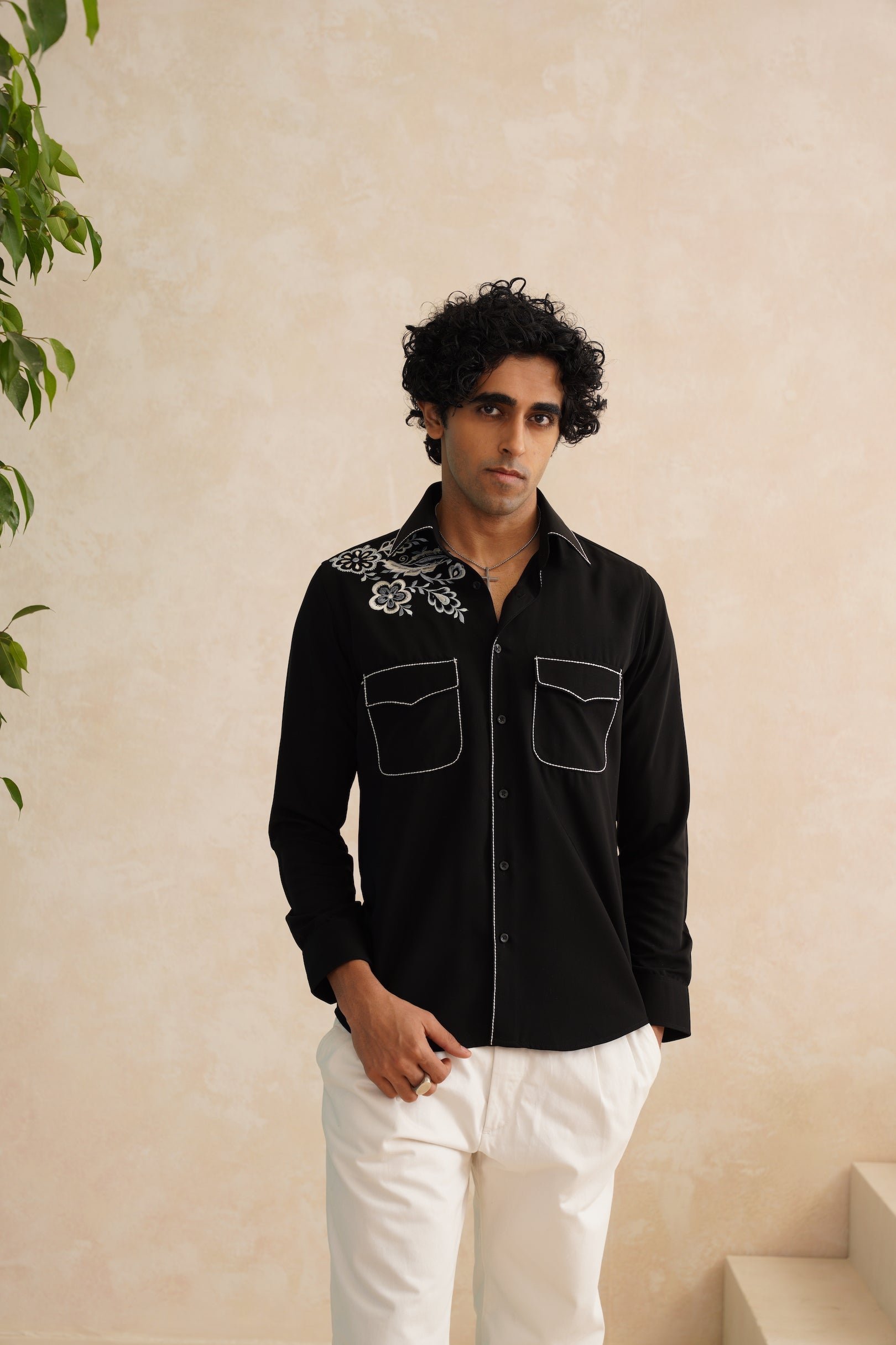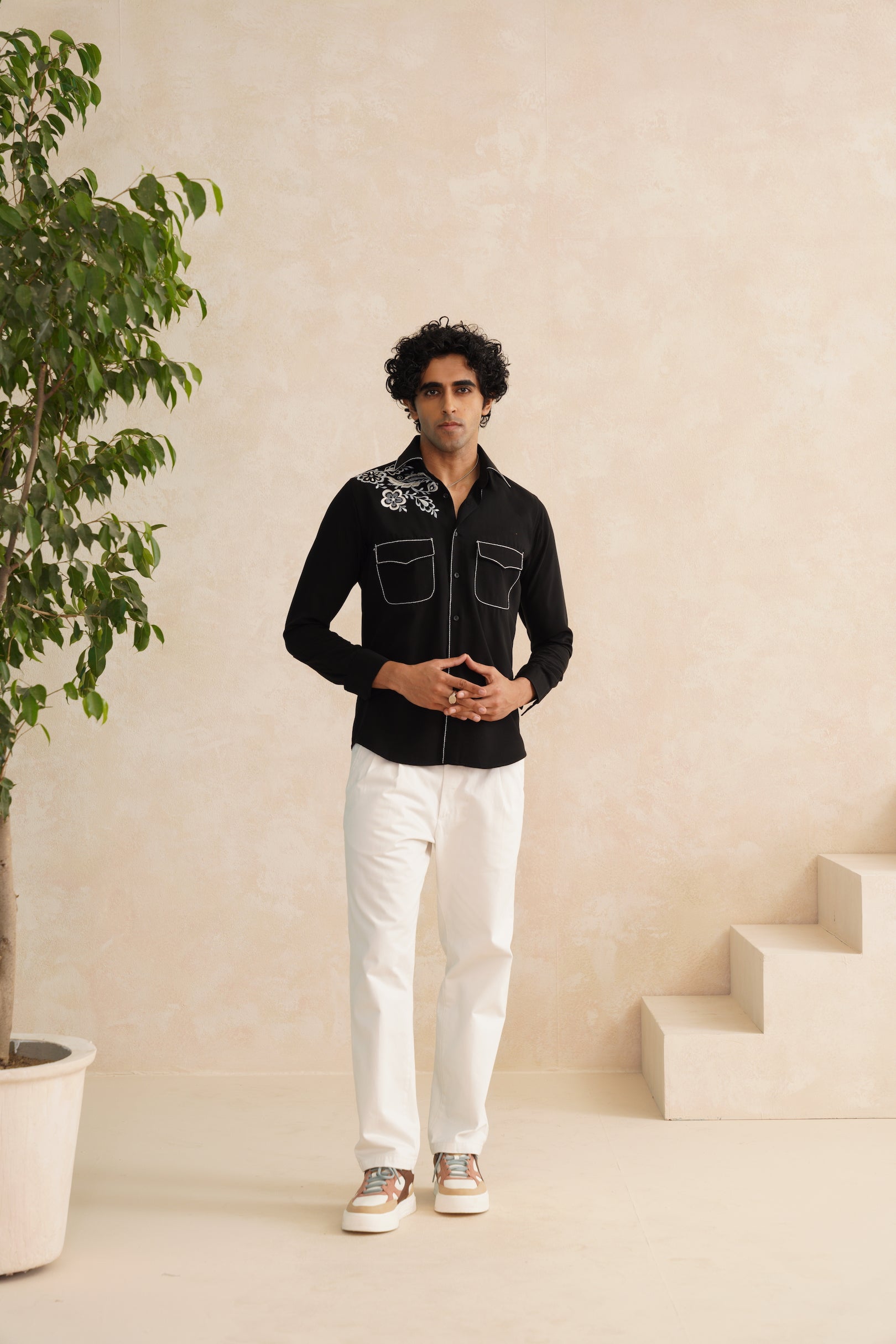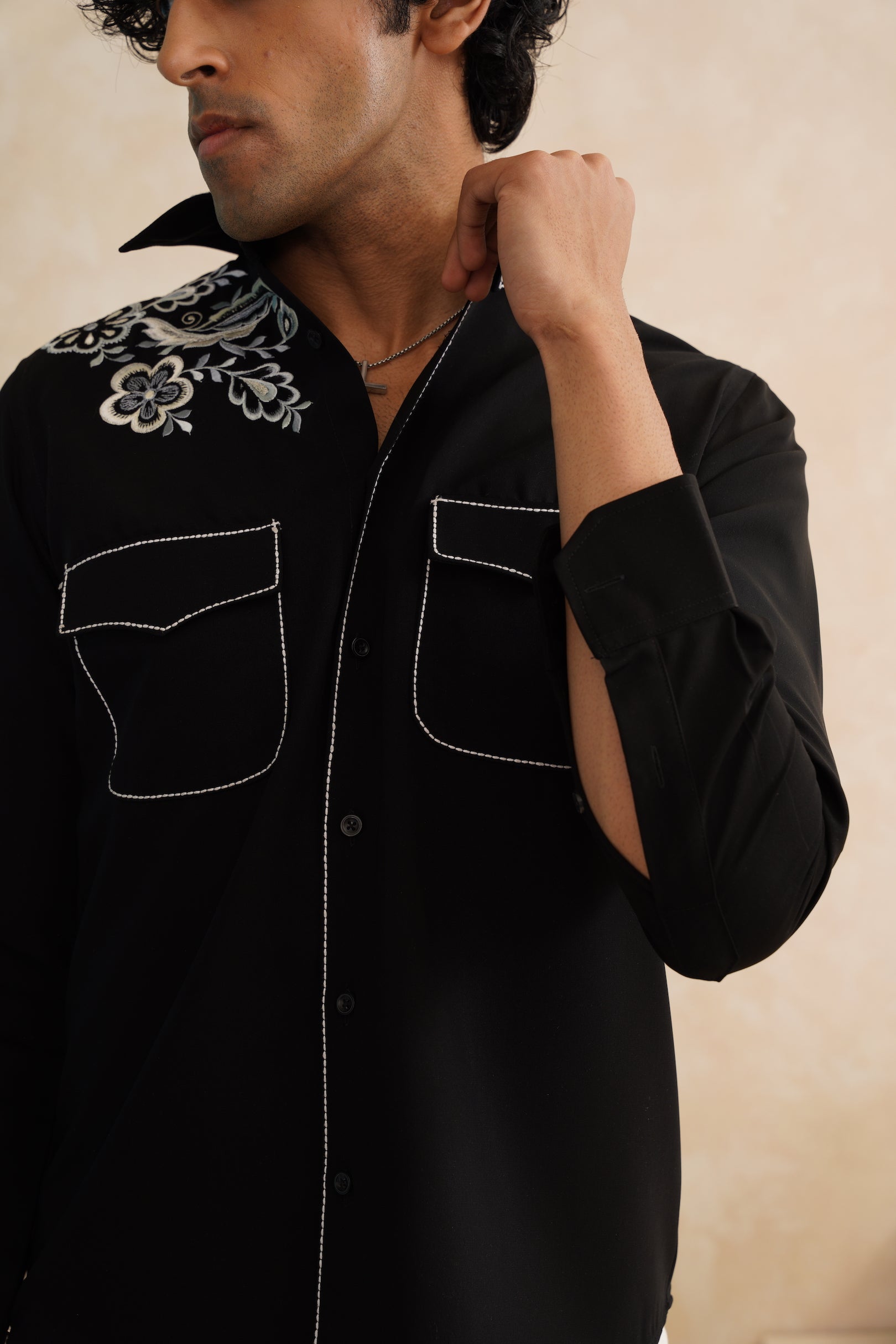 Make a bold yet refined statement with Noir Bloom, a luxurious black designer shirt tailored from ultra-soft Giza cotton for unmatched comfort and a sharp silhouette. Featuring intricate floral embroidery over the shoulder and contrasting white stitch accents on the pockets and placket, this shirt strikes the perfect balance between sophistication and artistic flair. Ideal for evening affairs, creative events, or smart-casual dressing.