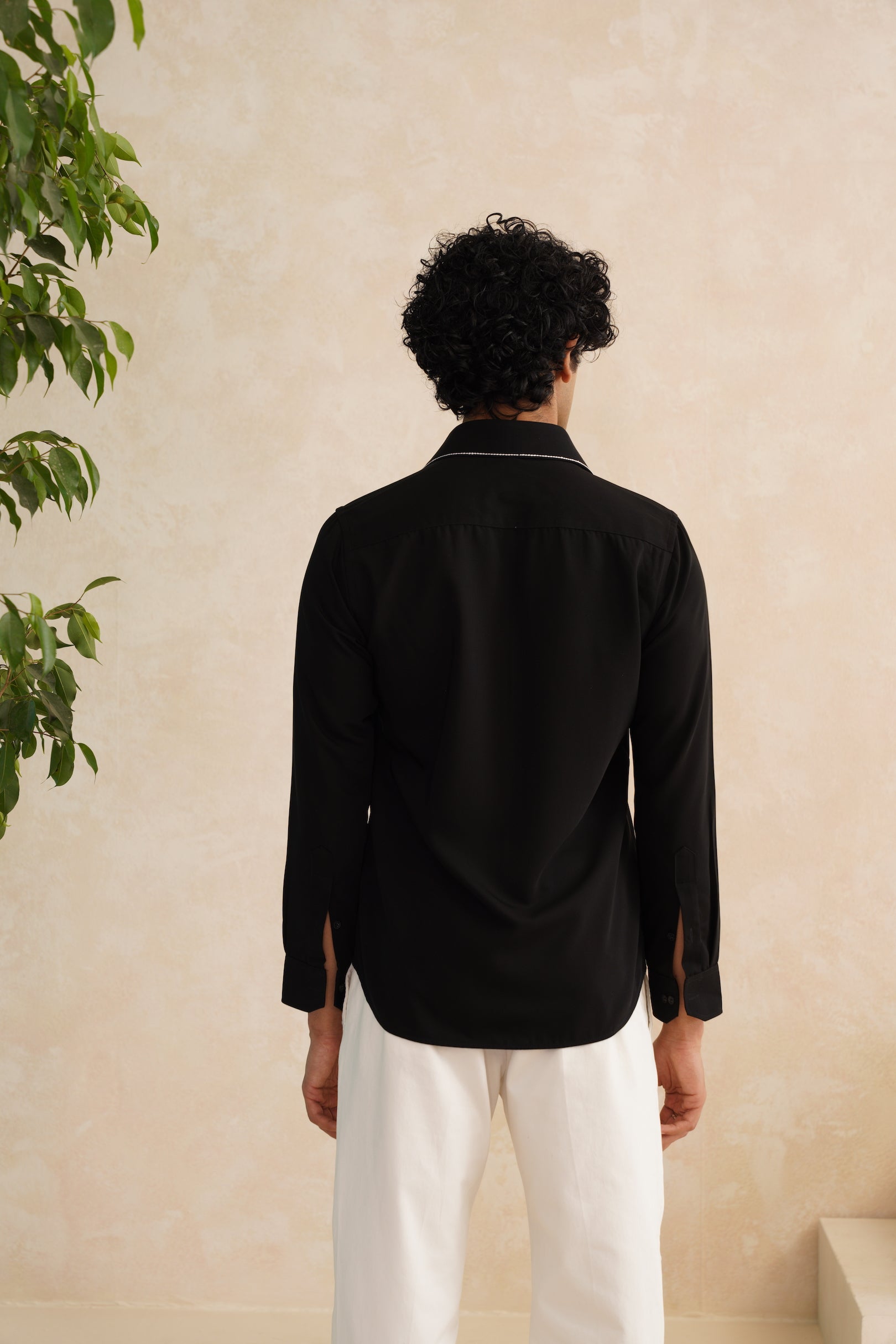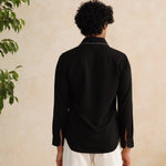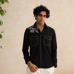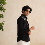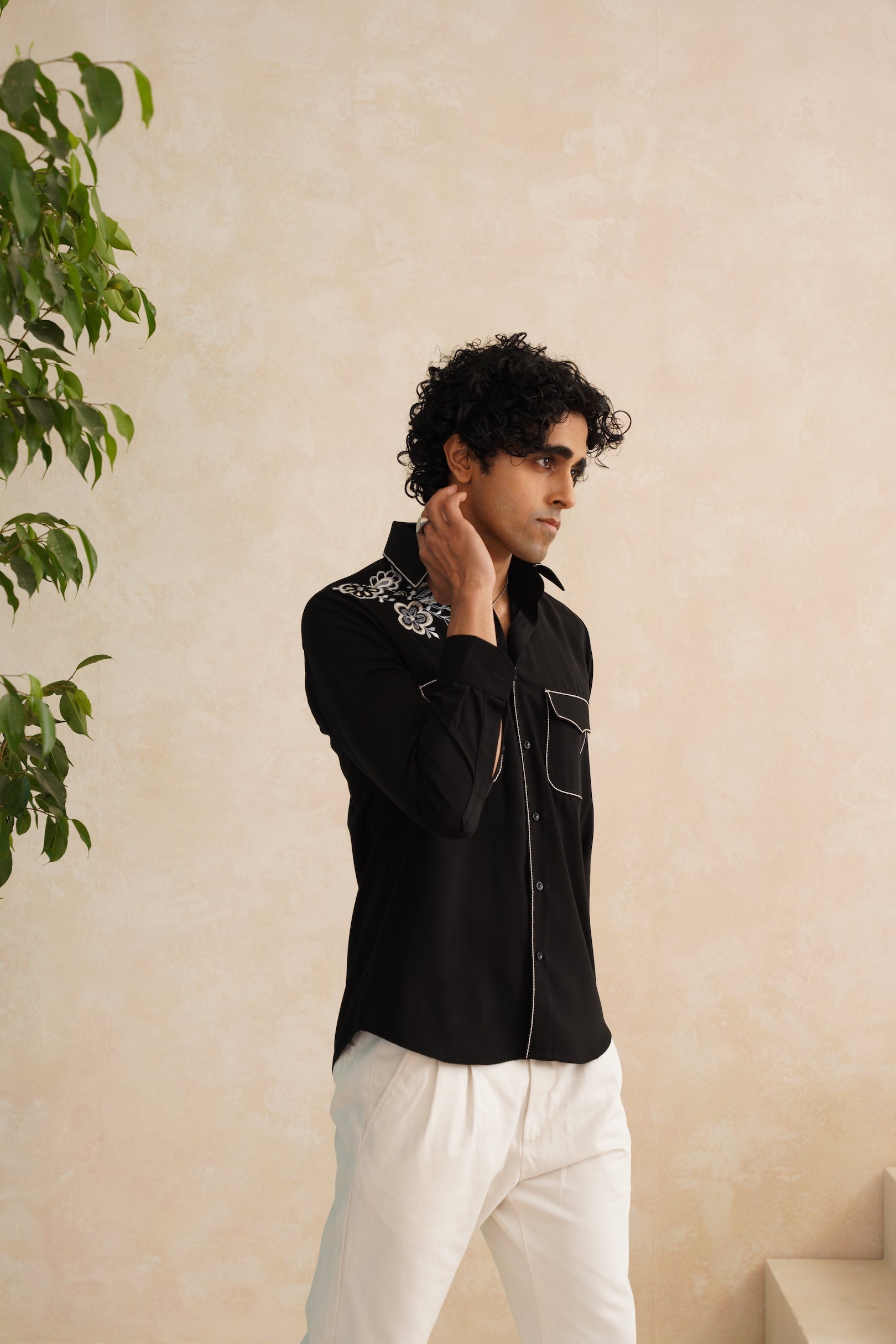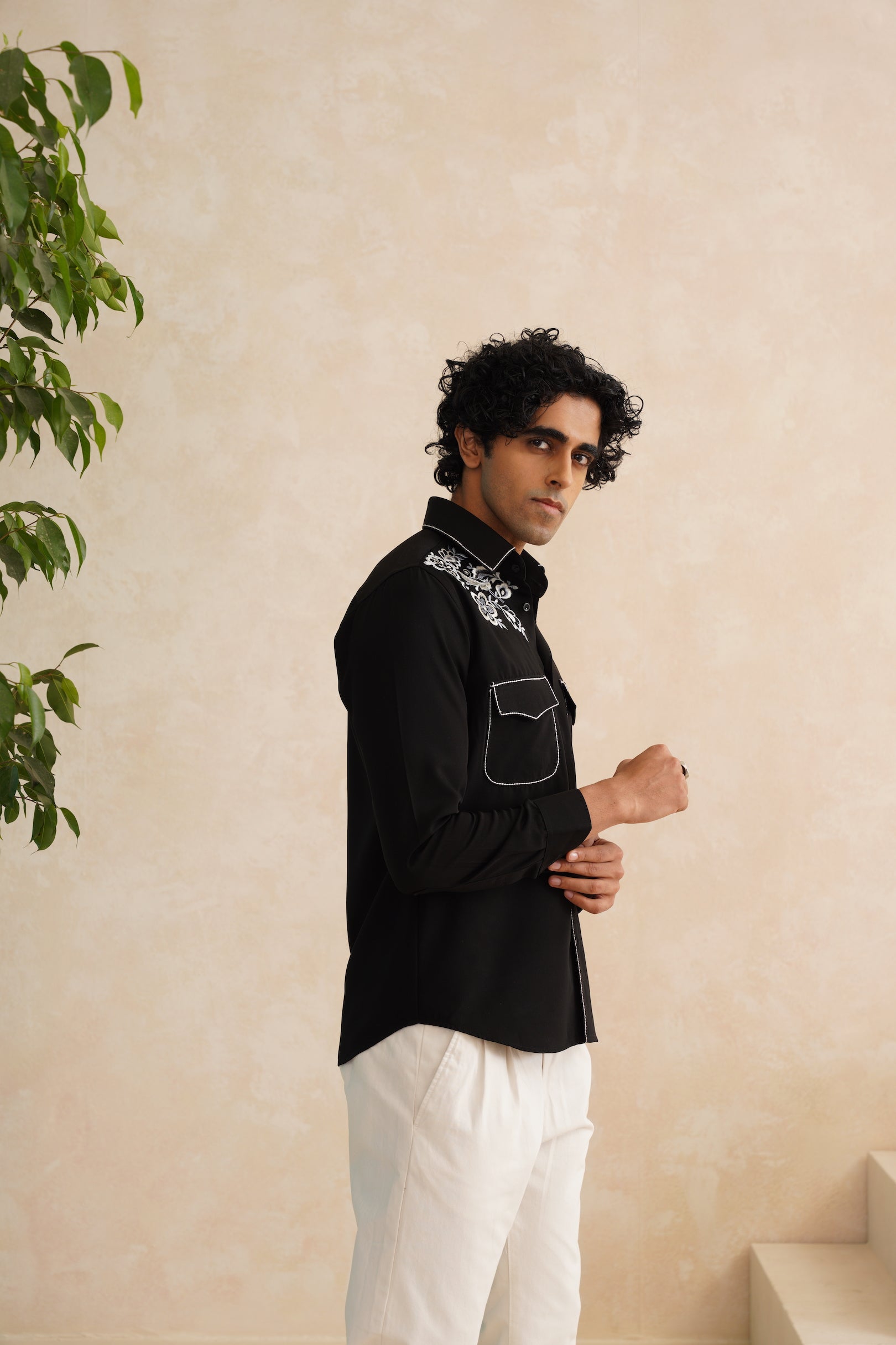 Make a bold yet refined statement with Noir Bloom, a luxurious black designer shirt tailored from ultra-soft Giza cotton for unmatched comfort and a sharp silhouette. Featuring intricate floral embroidery over the shoulder and contrasting white stitch accents on the pockets and placket, this shirt strikes the perfect balance between sophistication and artistic flair. Ideal for evening affairs, creative events, or smart-casual dressing.