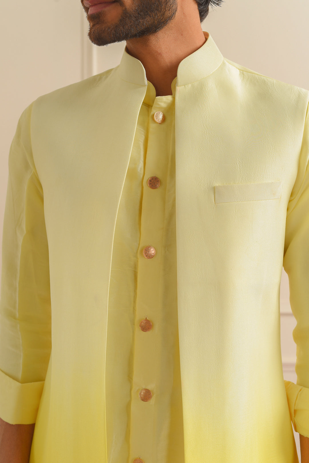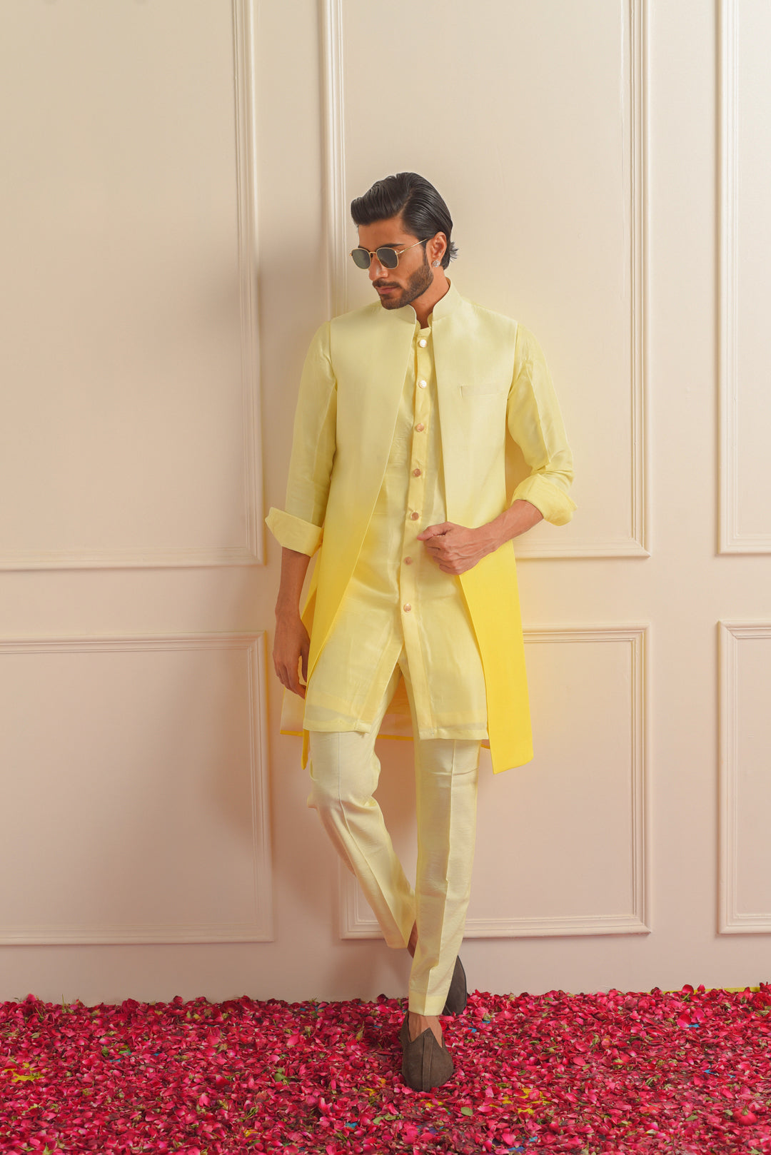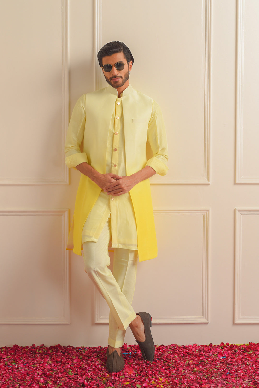 Introducing our exquisite ensemble: the Front Open Shrug in luxurious Silk fabric, perfectly paired with a Cotton Jacquard Kurta and White Cotton Pants. The silk shrug exudes elegance with its smooth texture and graceful drape, while the jacquard kurta adds a touch of sophistication with its intricate patterns and front-button detailing. Paired with the classic white cotton pants, this ensemble offers timeless style and effortless refinement for any occasion. Elevate your wardrobe with this impeccable combination of comfort and sophistication.