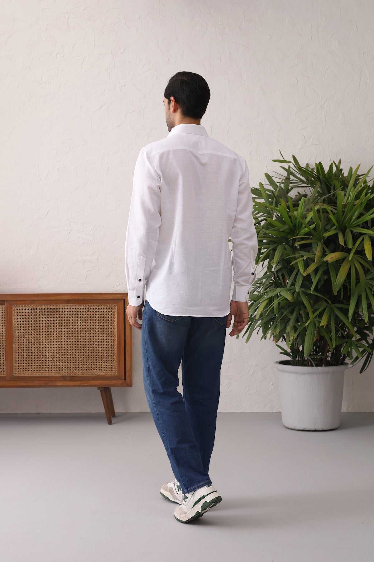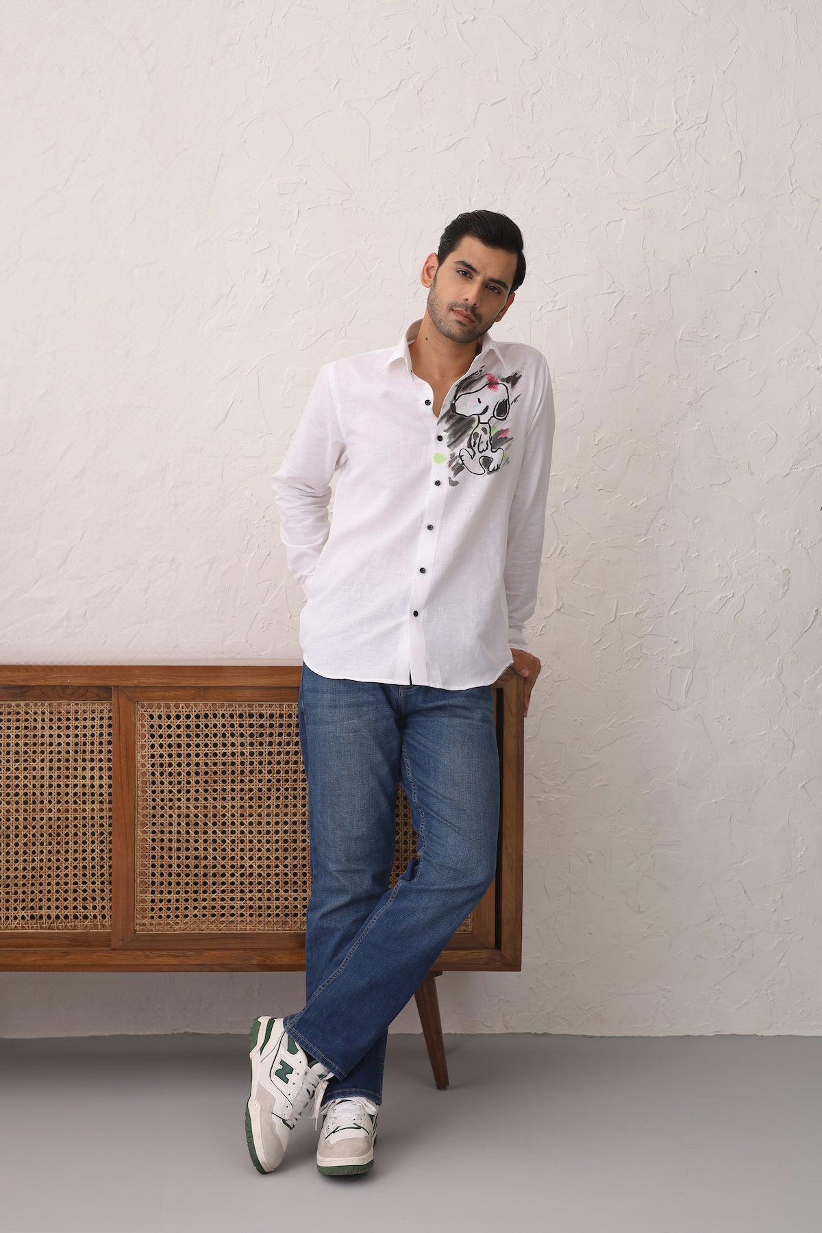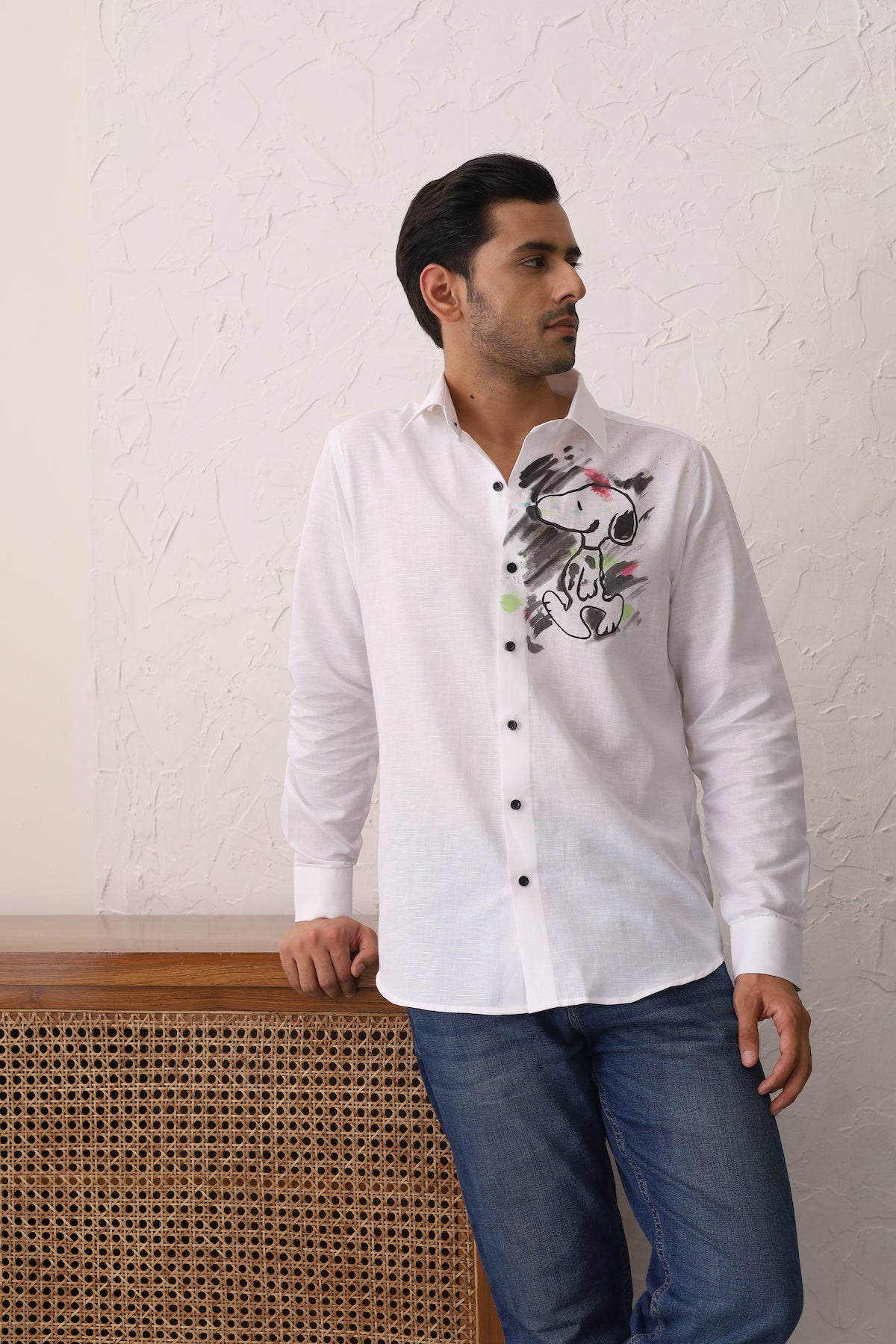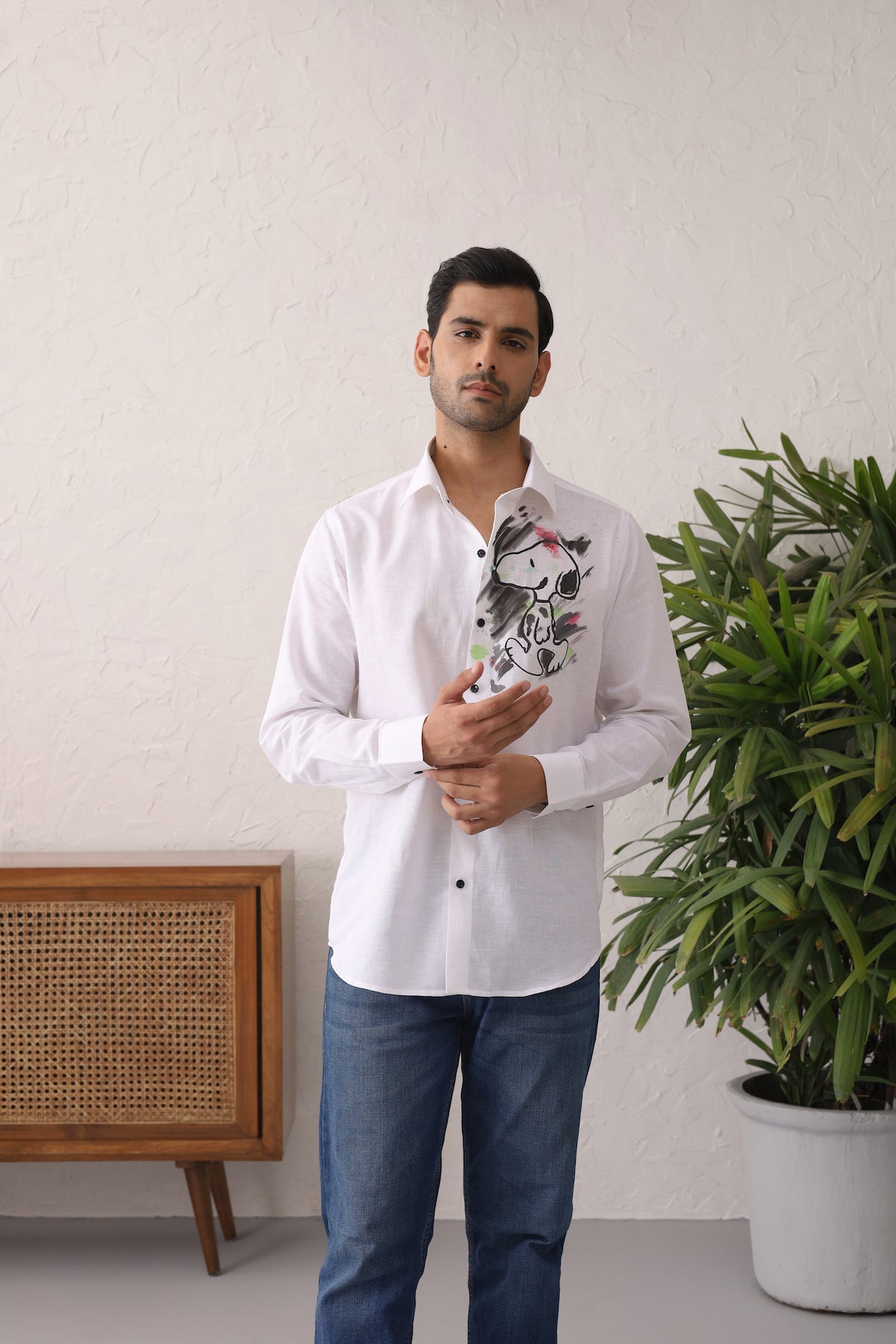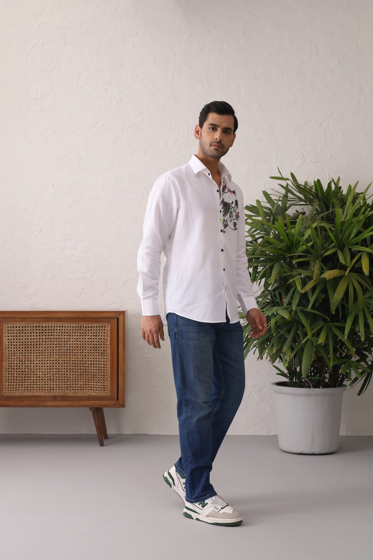 This white linen shirt features exquisite hand-painted designs, merging artisanal craftsmanship with natural elegance. The airy fabric and unique artwork create a light, sophisticated look. Ideal for those who cherish individuality and timeless style.