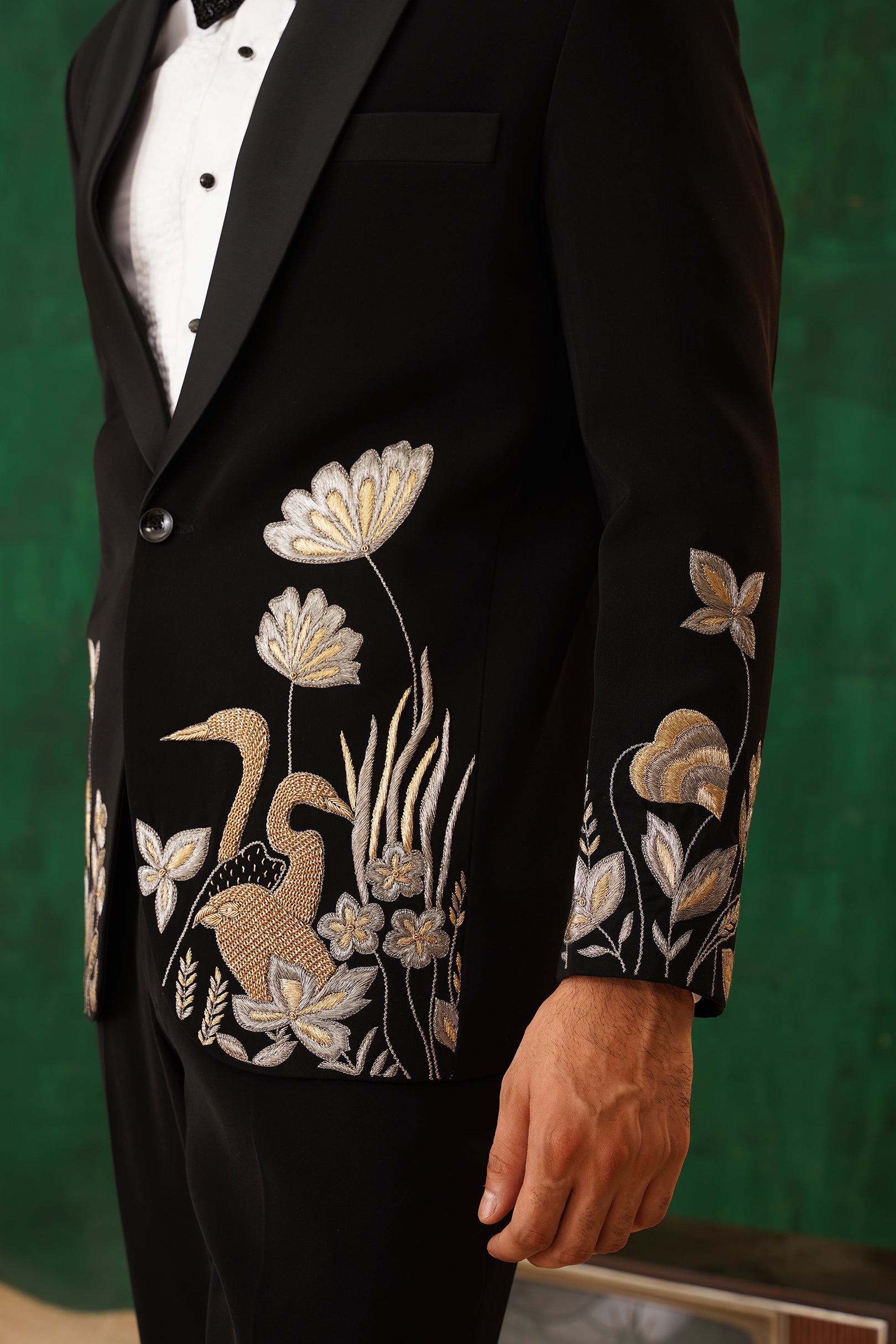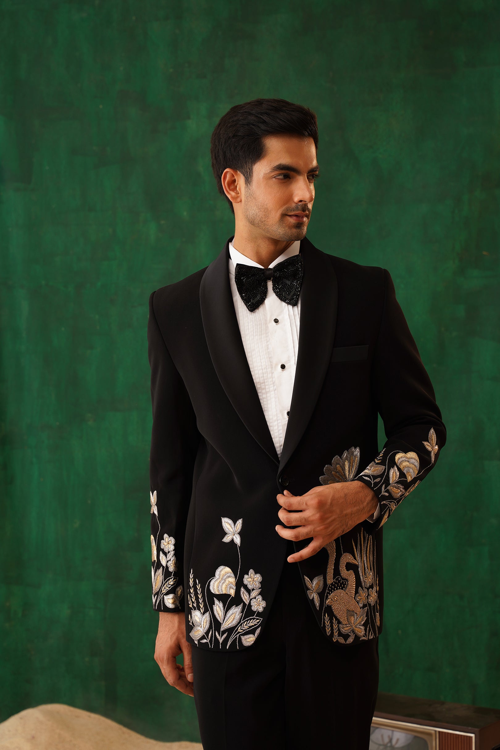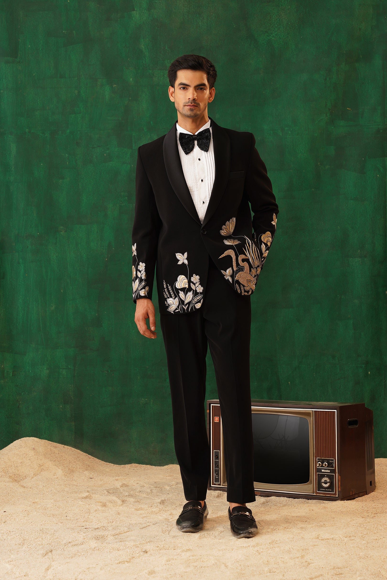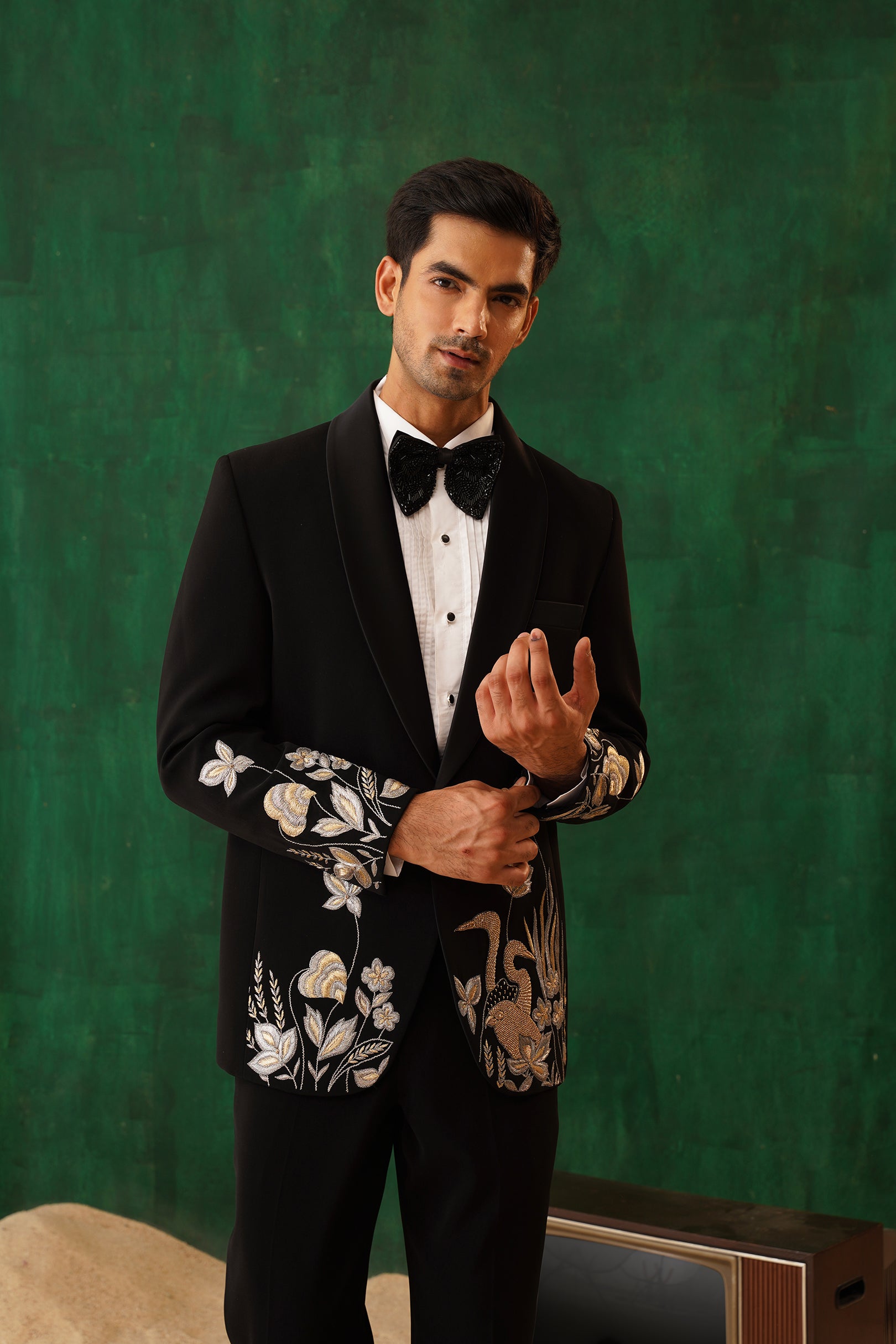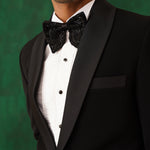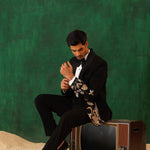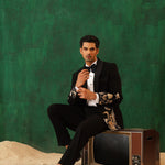 Step into the spotlight with The Regal -Sequence embroidered tuxedo – a 4-piece masterpiece blending timeless elegance with artistic flair. The black tuxedo blazer features intricate metallic embroidery of florals and cranes, symbolising prosperity. Paired with our White Crest Pin-tuck Shirt, satin-detailed trousers, and a black sequin bow tie, this set is perfect for formal galas, weddings, or black-tie evenings. A sleek silhouette and luxurious detailing ensure you command attention with effortless sophistication.