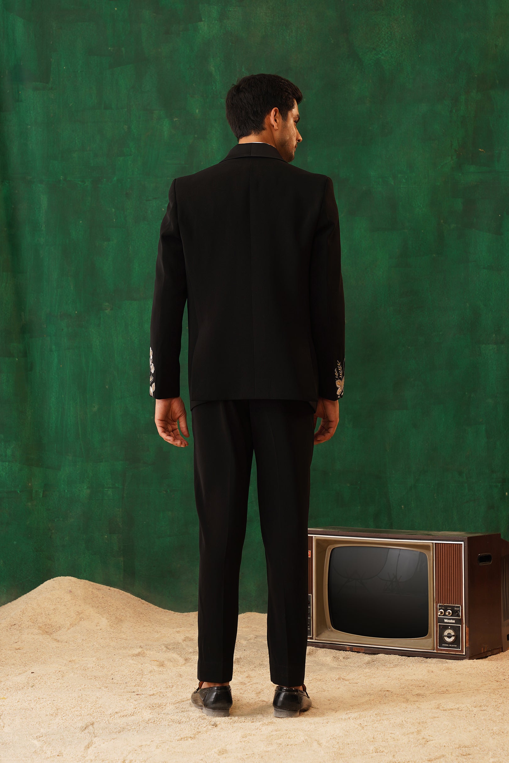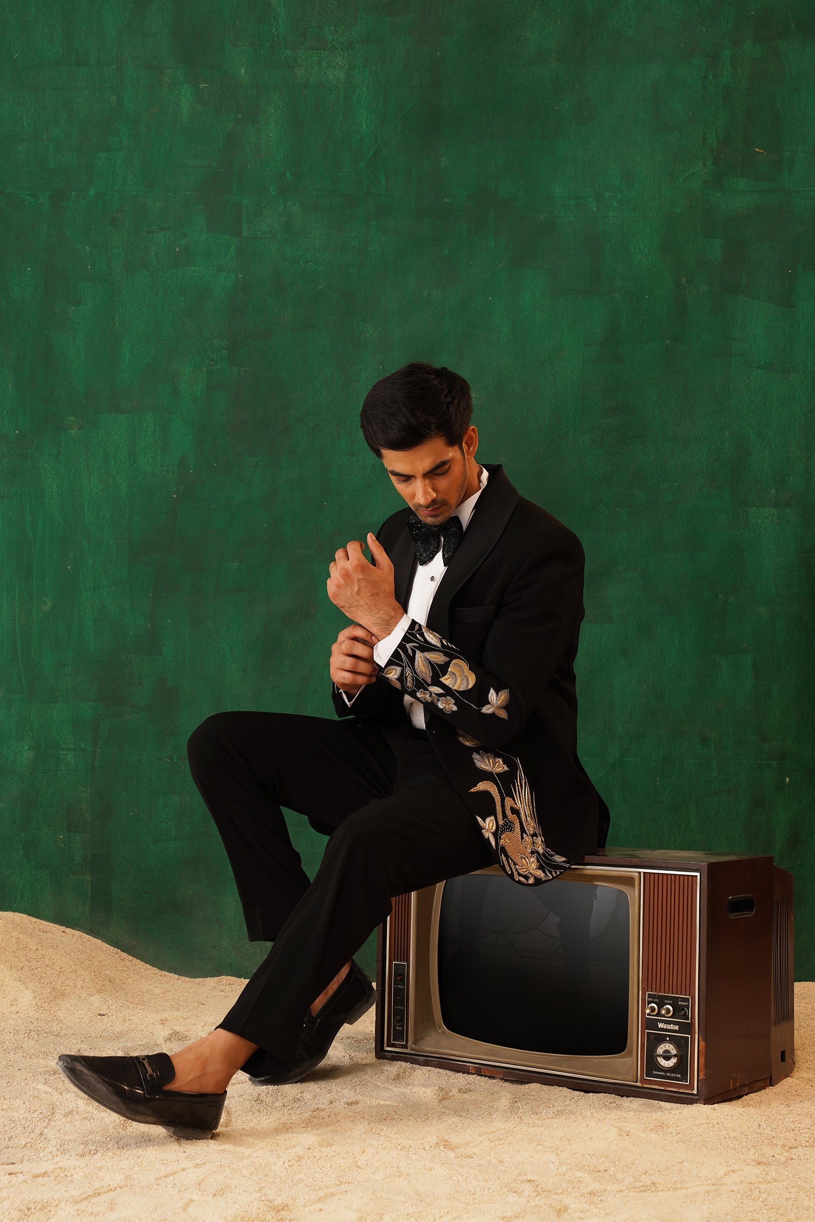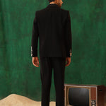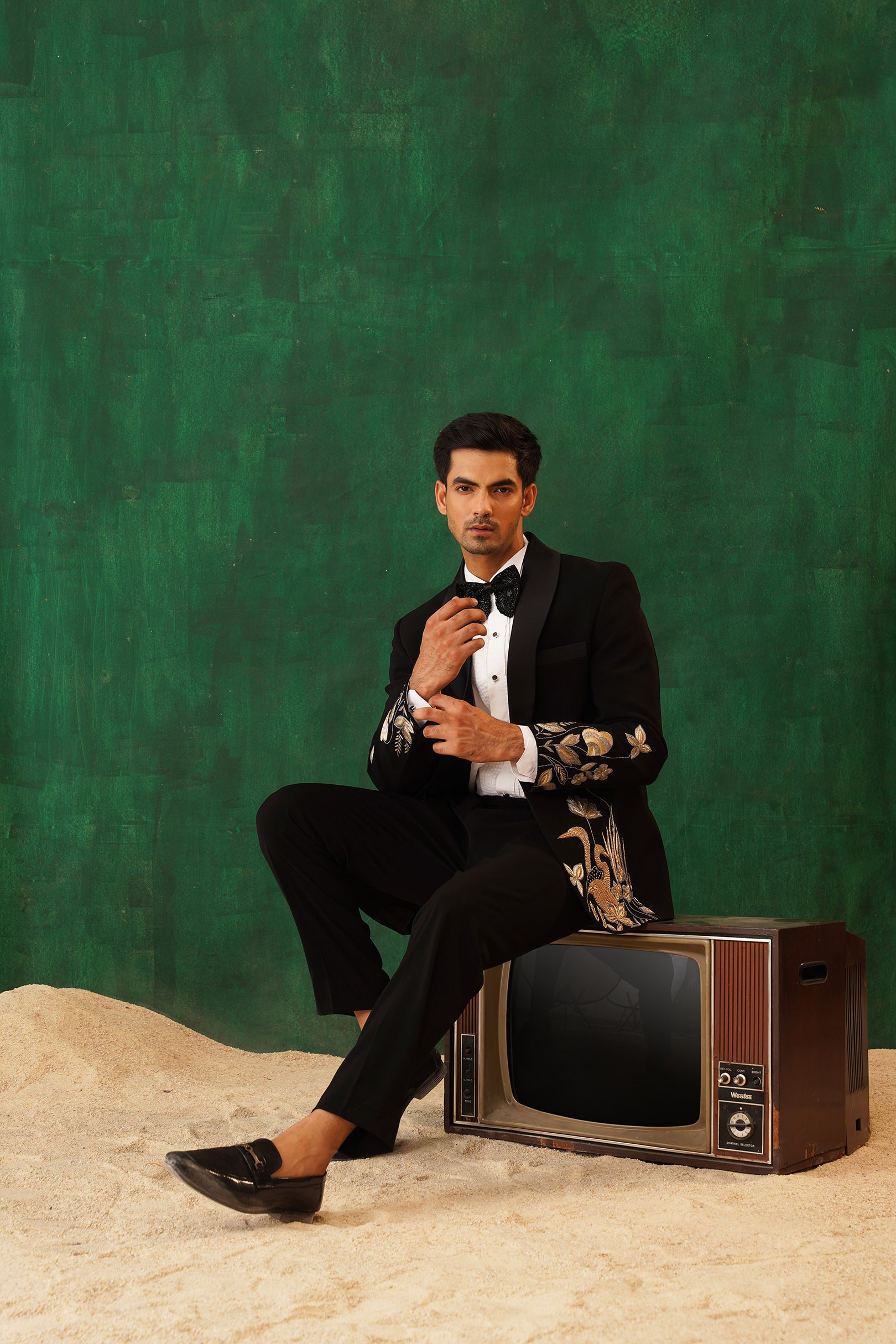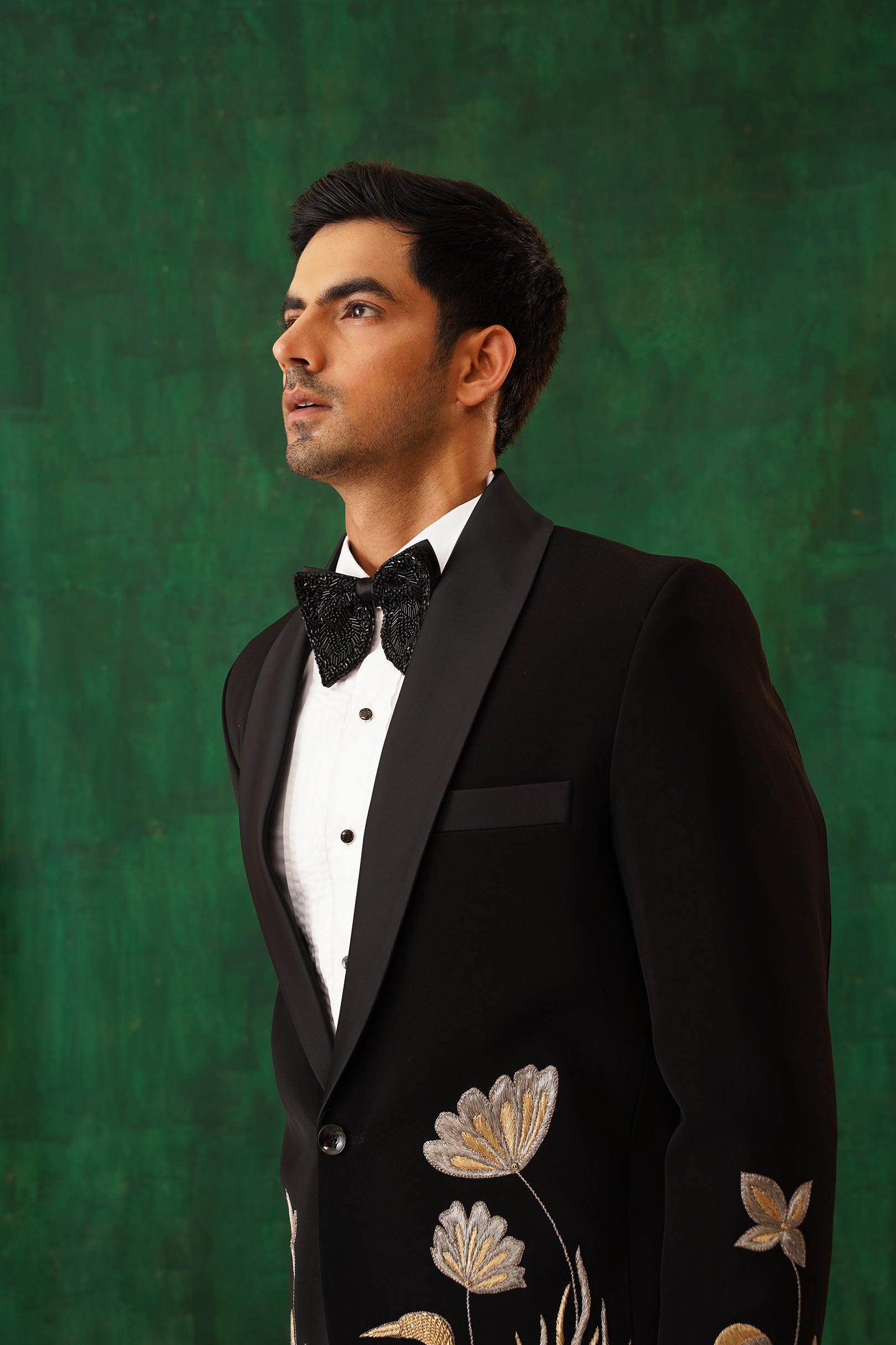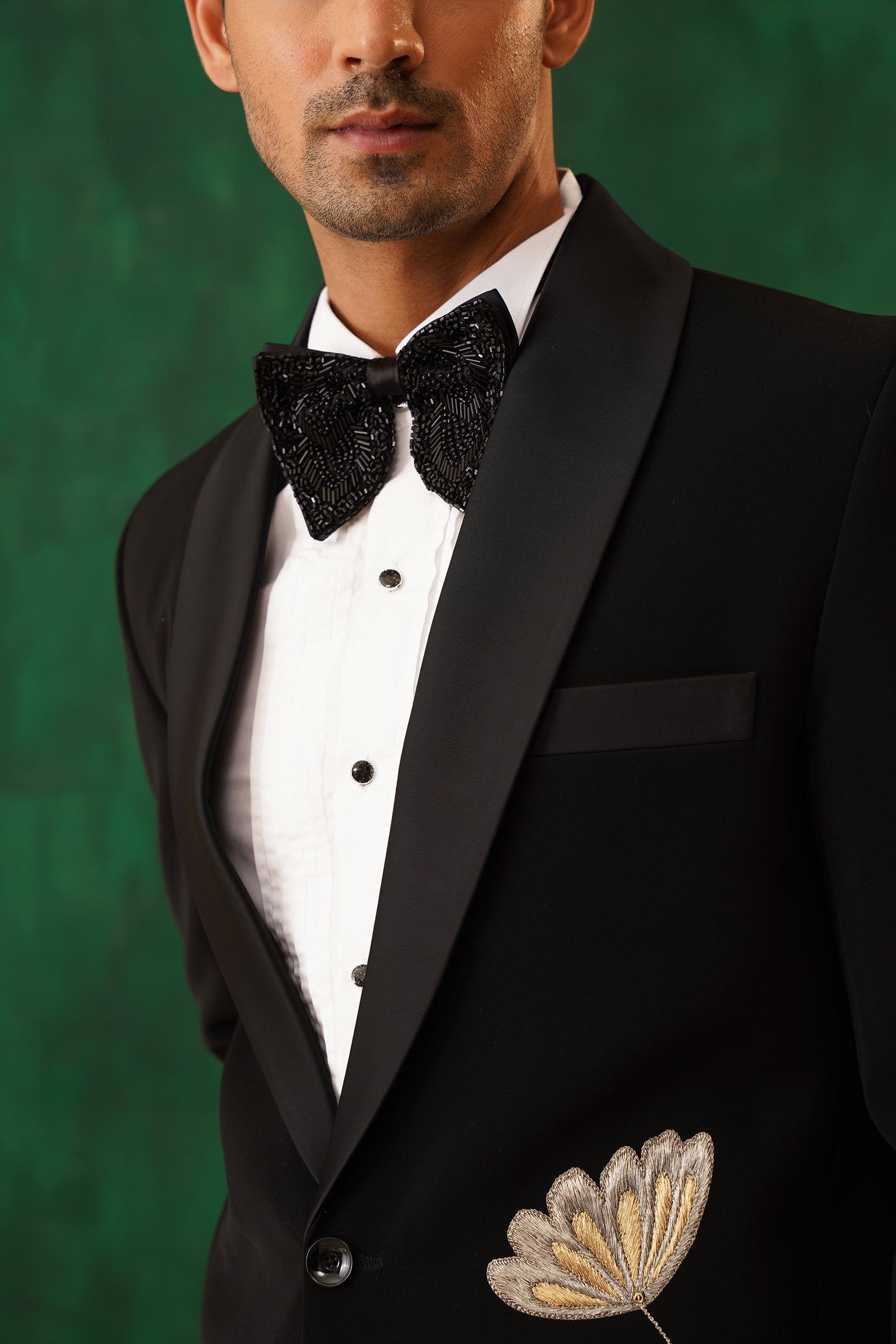 Step into the spotlight with The Regal -Sequence embroidered tuxedo – a 4-piece masterpiece blending timeless elegance with artistic flair. The black tuxedo blazer features intricate metallic embroidery of florals and cranes, symbolising prosperity. Paired with our White Crest Pin-tuck Shirt, satin-detailed trousers, and a black sequin bow tie, this set is perfect for formal galas, weddings, or black-tie evenings. A sleek silhouette and luxurious detailing ensure you command attention with effortless sophistication.