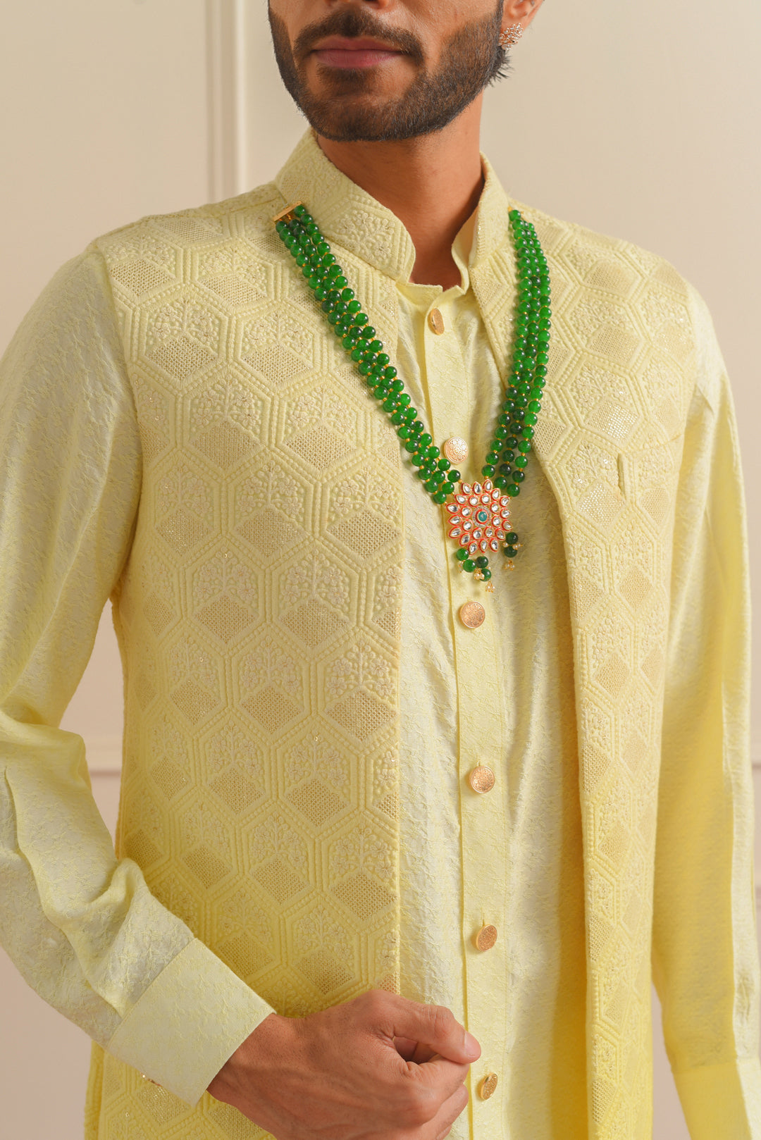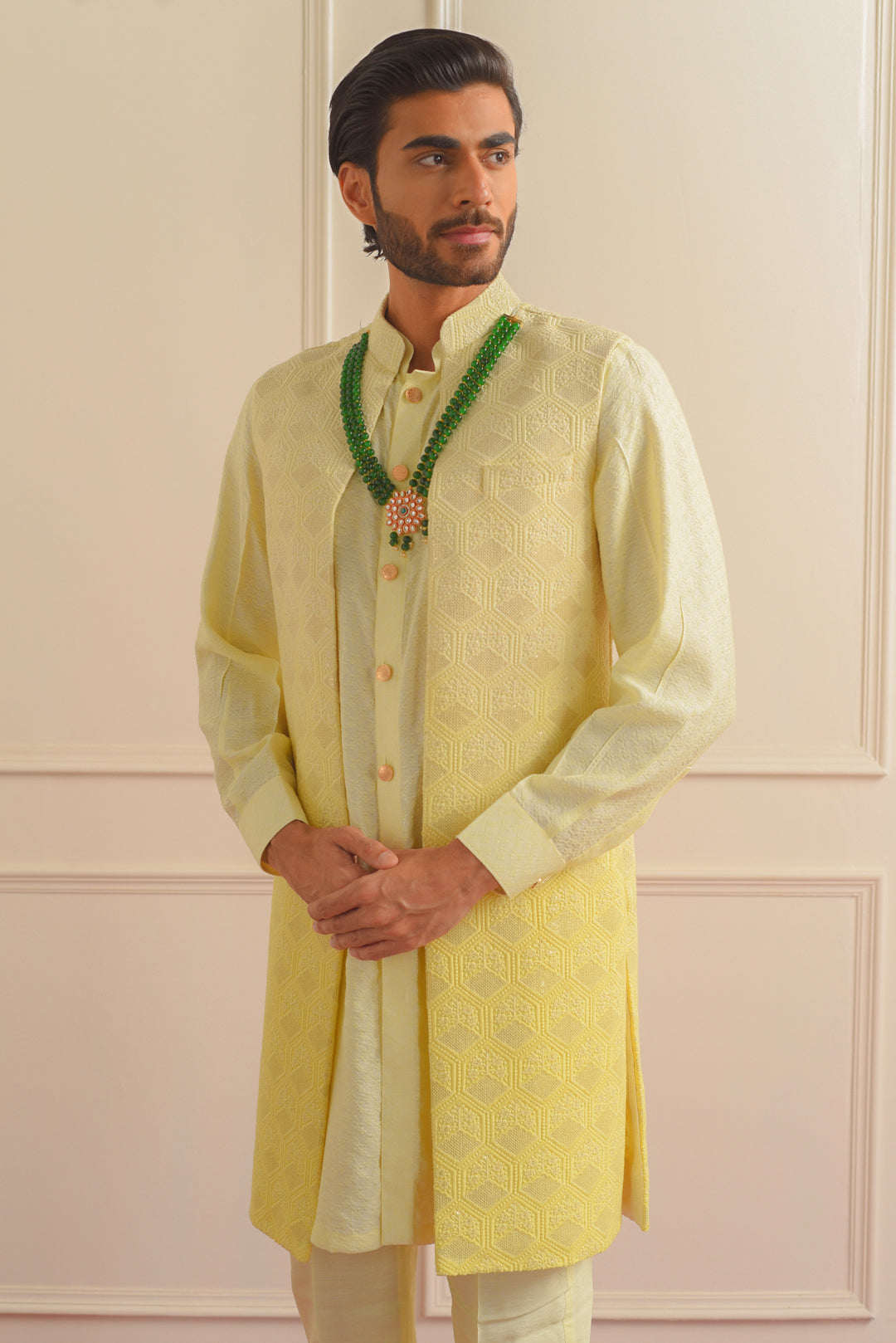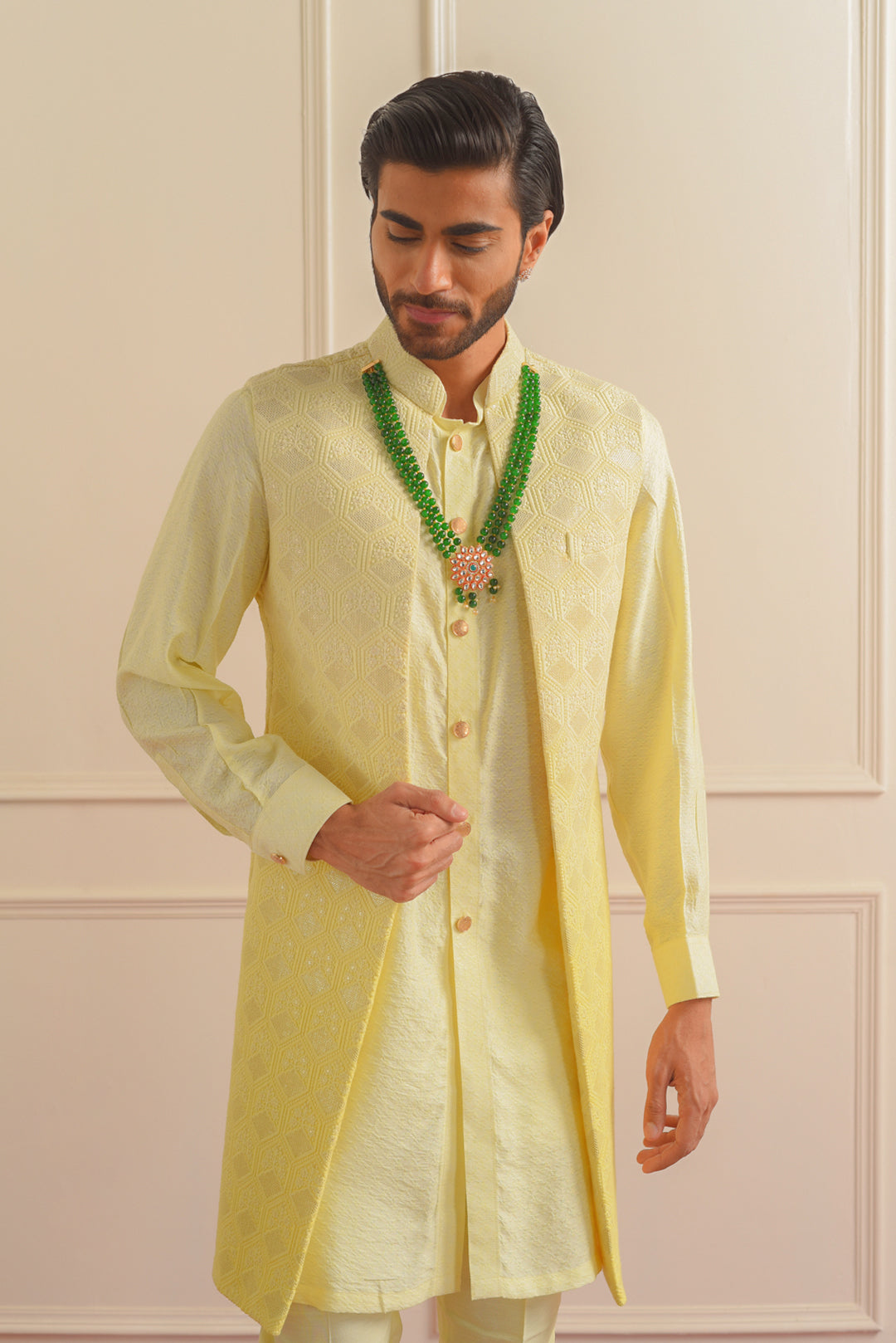 Whether you're attending a social gathering or stepping out for a leisurely outing, our Front Open Shrug paired with a Cotton Jacquard Kurta and White Cotton Pants is the epitome of effortless style and sophistication. Elevate your wardrobe with this impeccable ensemble, and make a statement wherever you go.