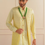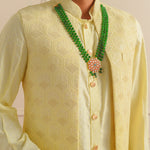 Introducing our exquisite ensemble, blending sophistication with comfort, our Front Open Shrug in Jacquard fabric paired seamlessly with a Cotton Jacquard Kurta and crisp White Cotton Pants exudes elegance and charm.